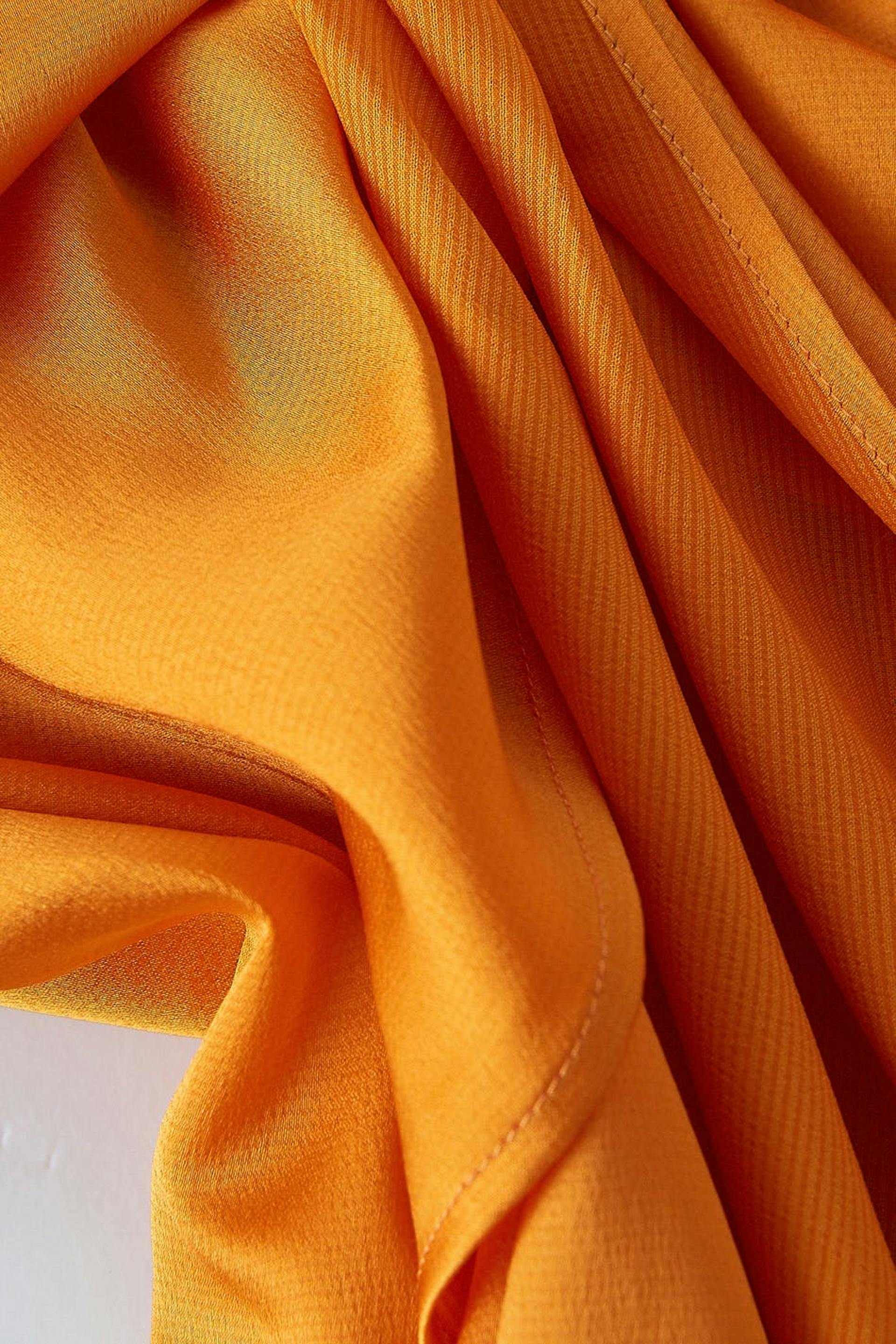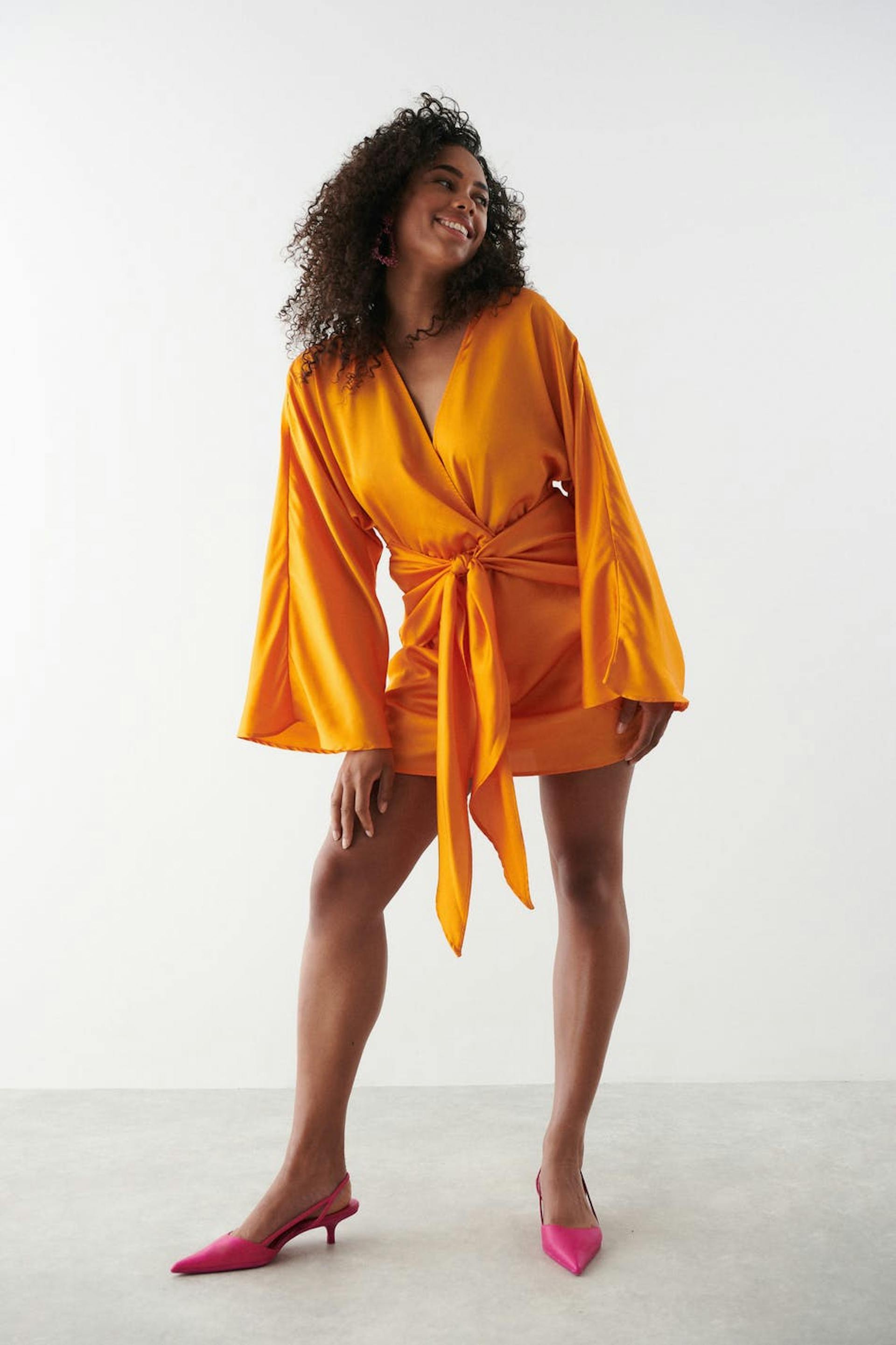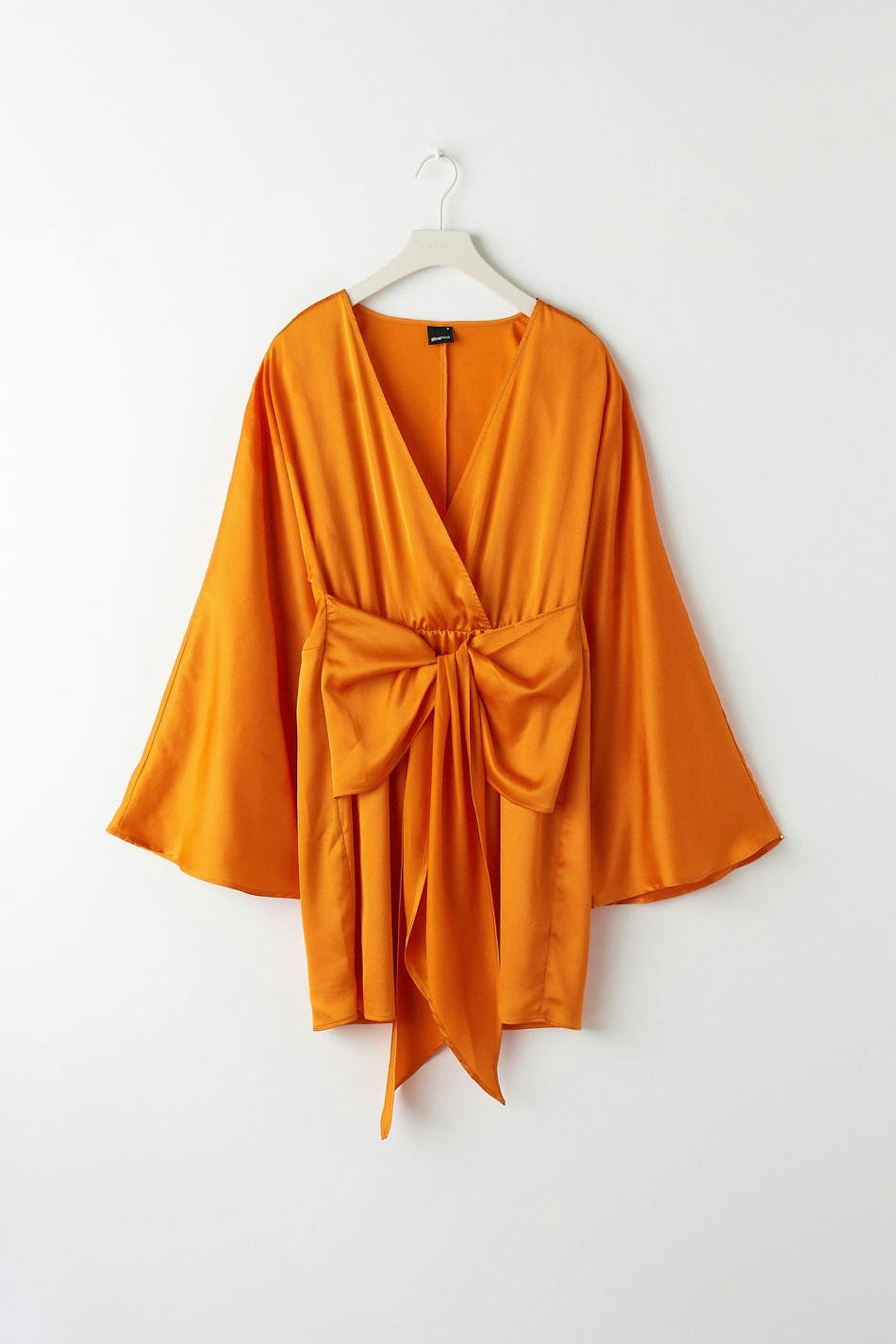 Langärmliges Wickelkleid aus Satin mit Schnürungen in der Taille. Das Kleid ist perfekt für eine Party, orange und kurz. Es hat eine lockere Passform, Gummiband in der Taille, Laternenärmel, V-Ausschnitt und ein Material aus recyceltem Polyester.