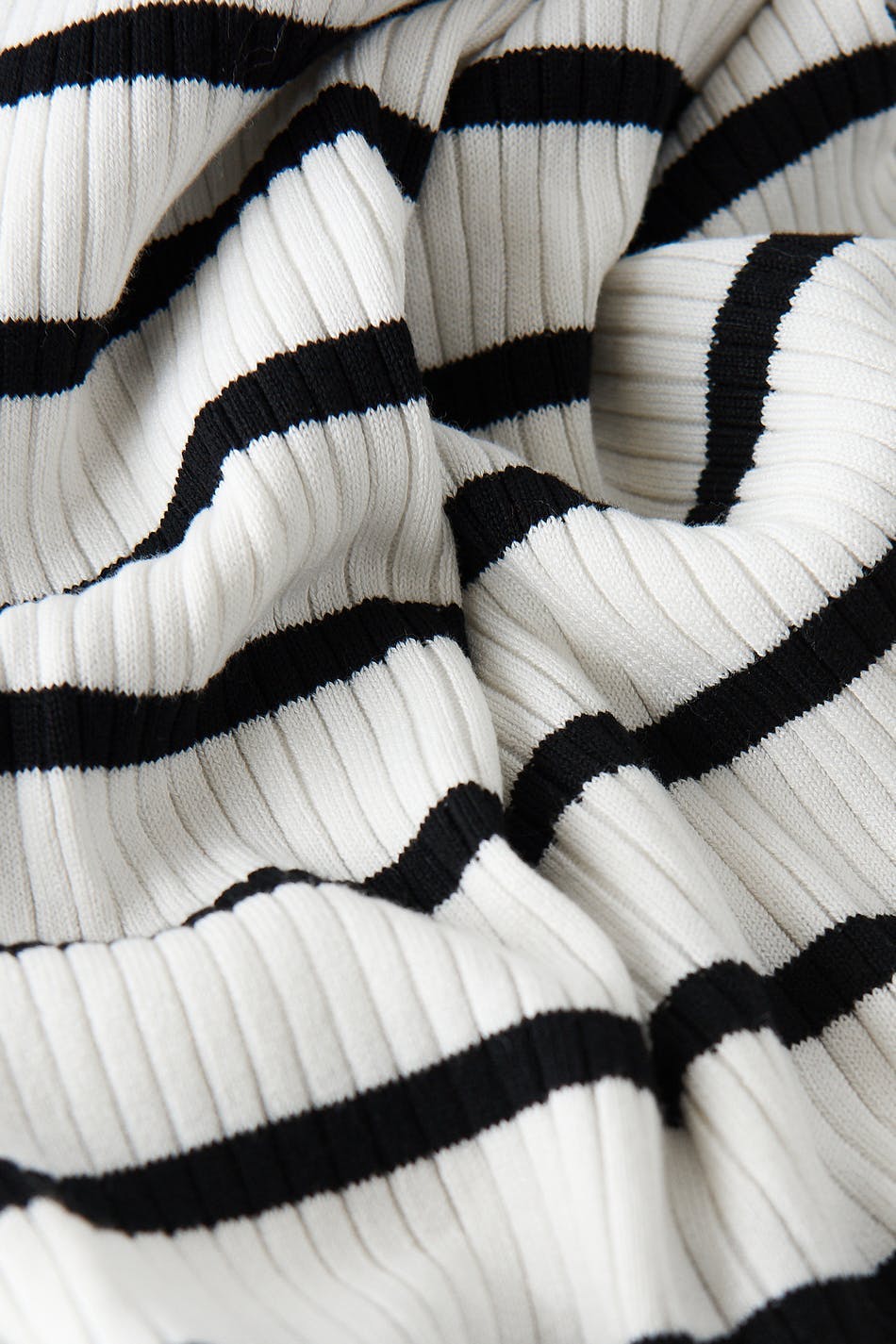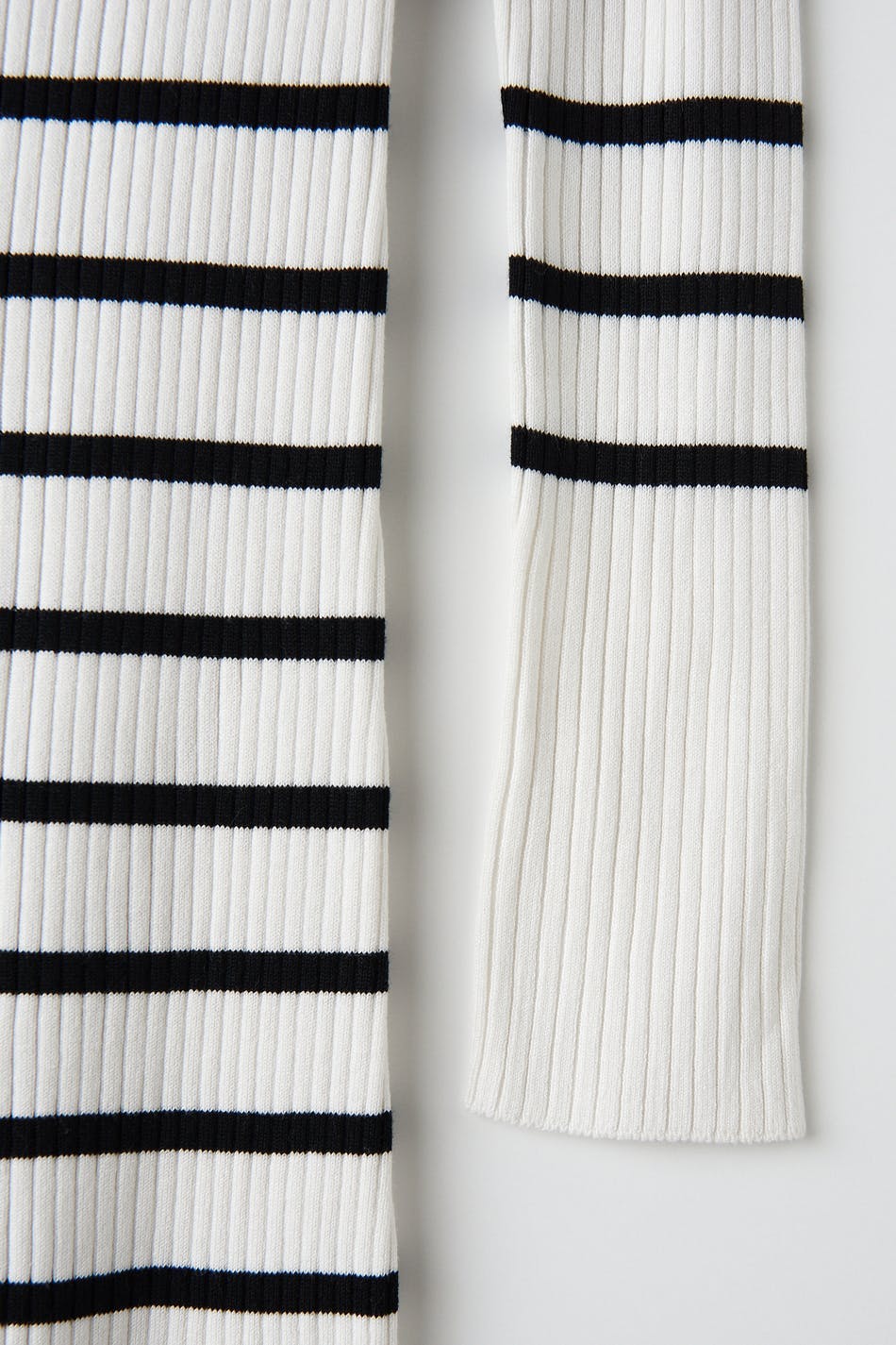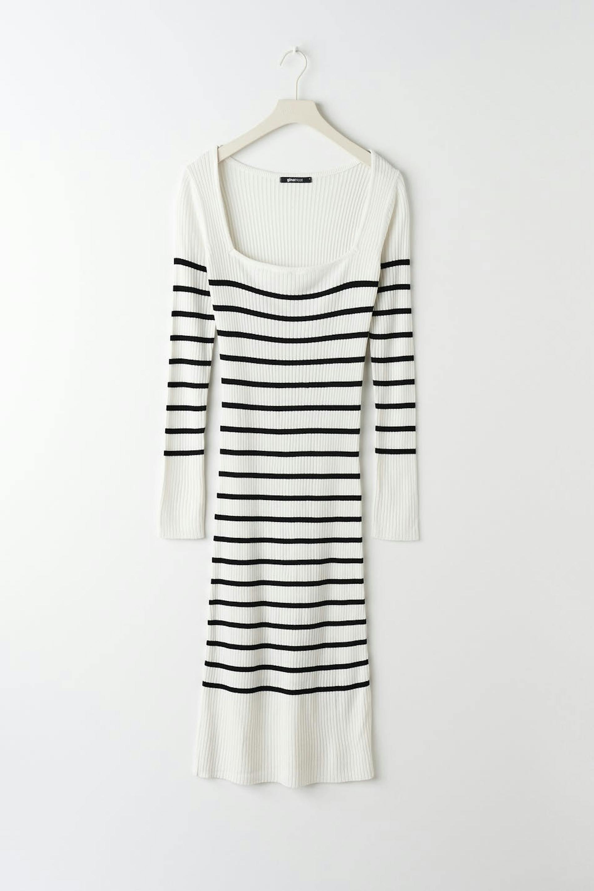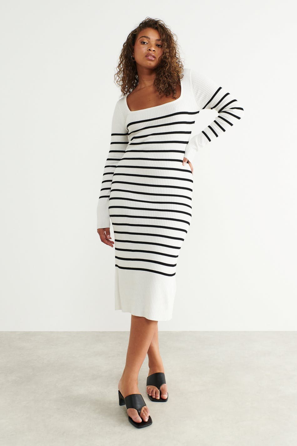 Gestreiftes Strickkleid mit quadratischem Ausschnitt. Das Kleid ist weiβ, schwarz und langärmlig. Es hat eine taillierte Passform und eine Midi-Länge.