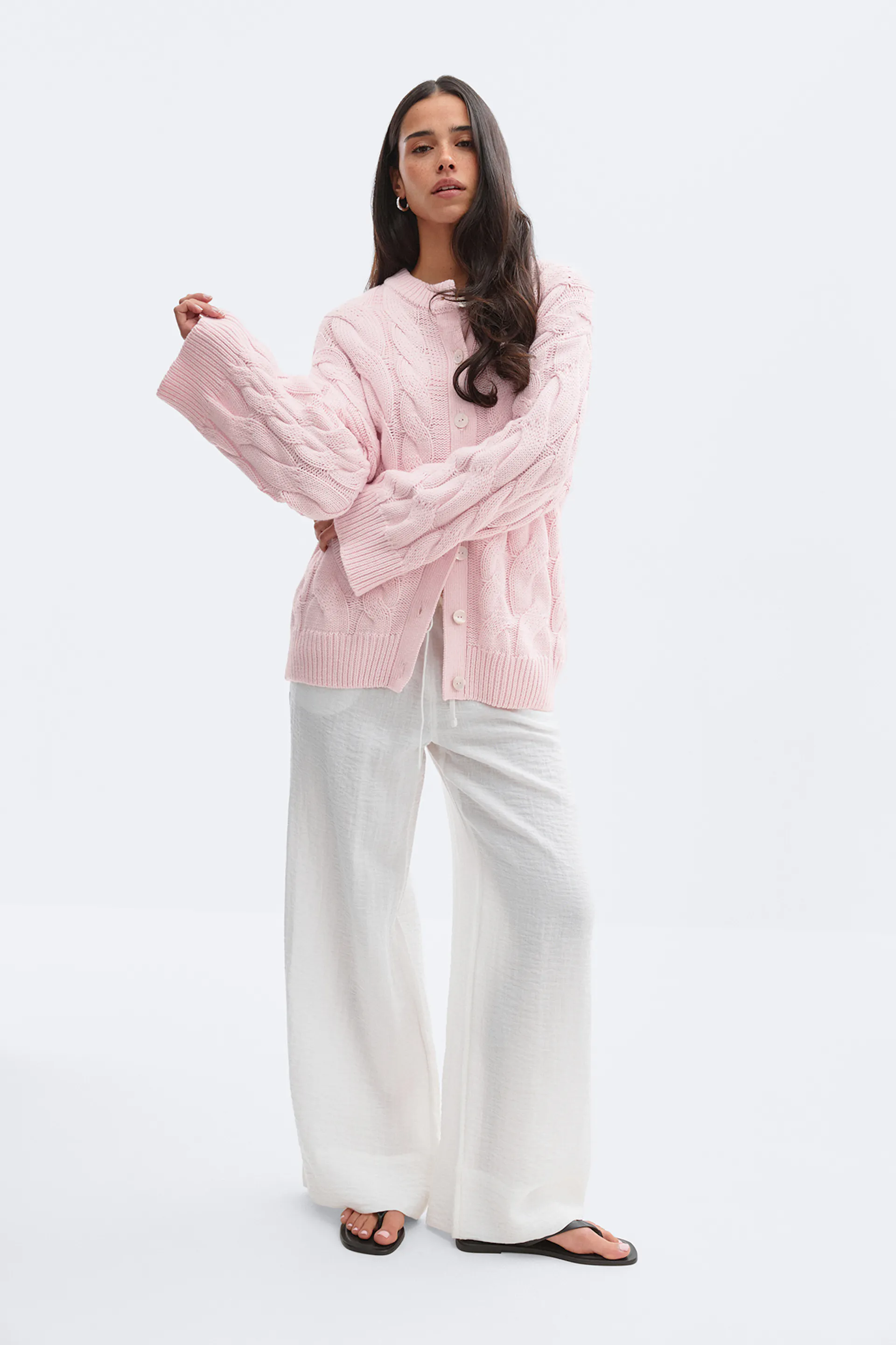 Zartrosa Strickjacke mit Knopfleiste und geripptem Kragen und Manschetten, kombiniert mit einer weißen Hose mit weitem Bein und schwarzen Slide-Sandalen; kleine Ohrringe.