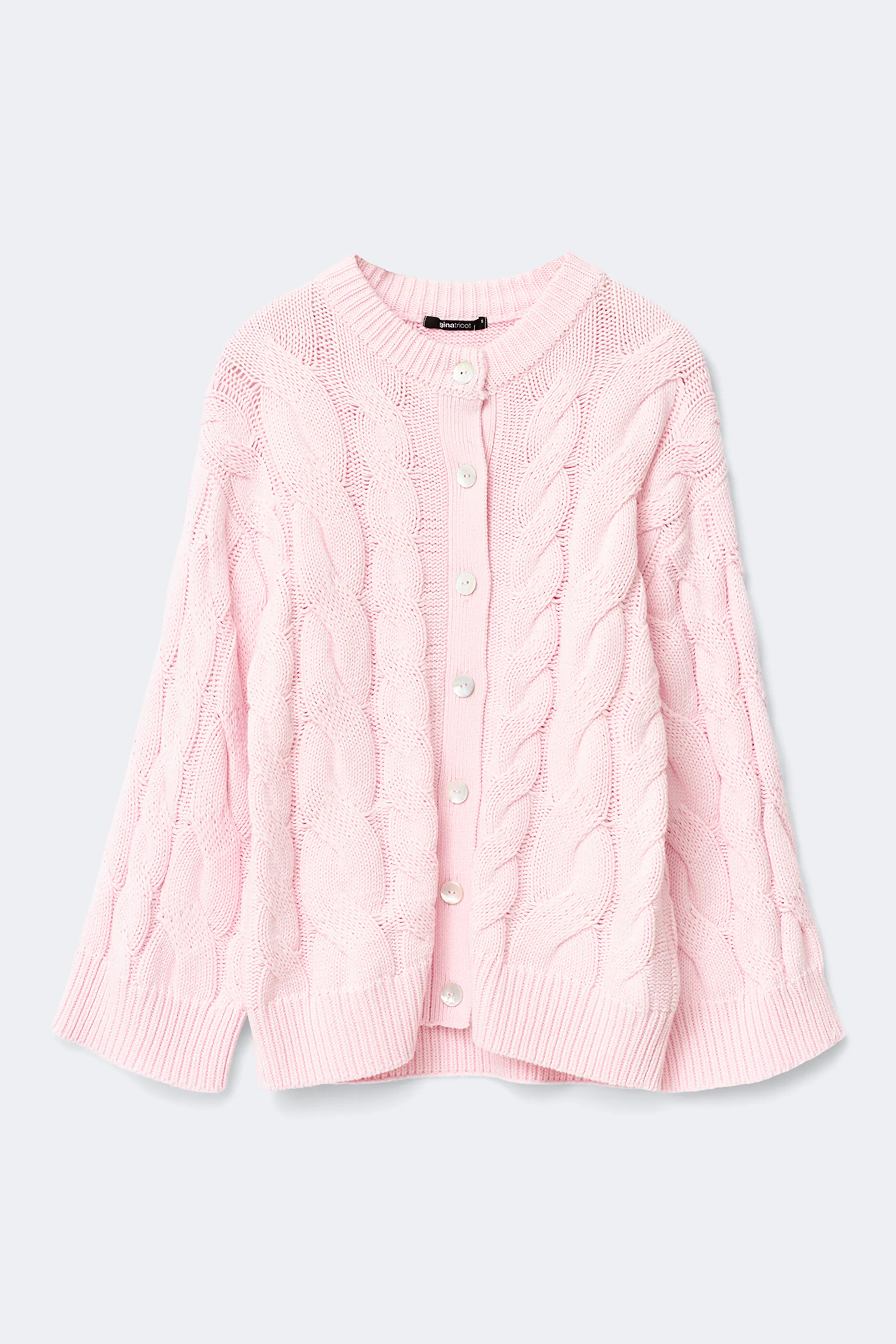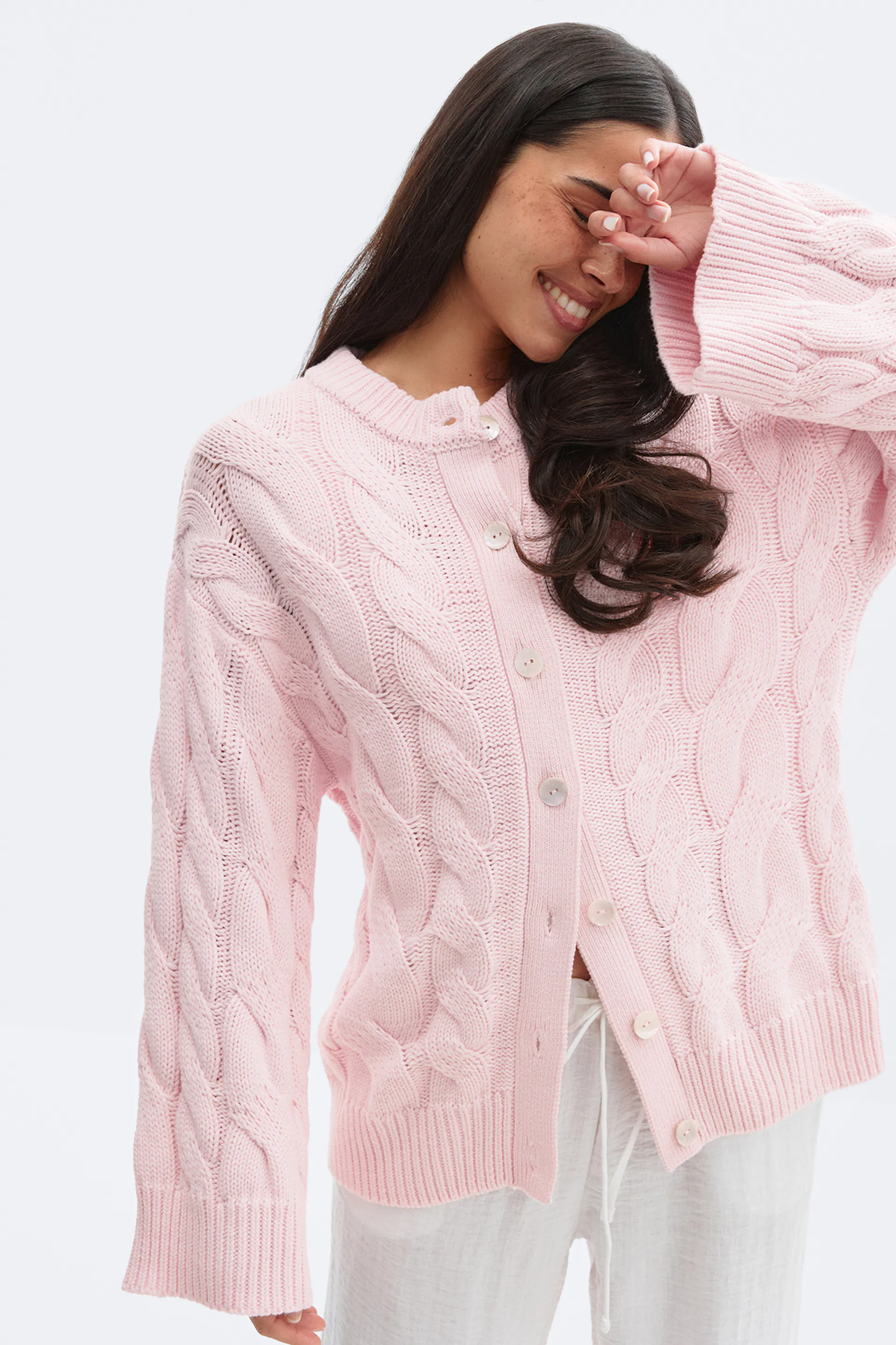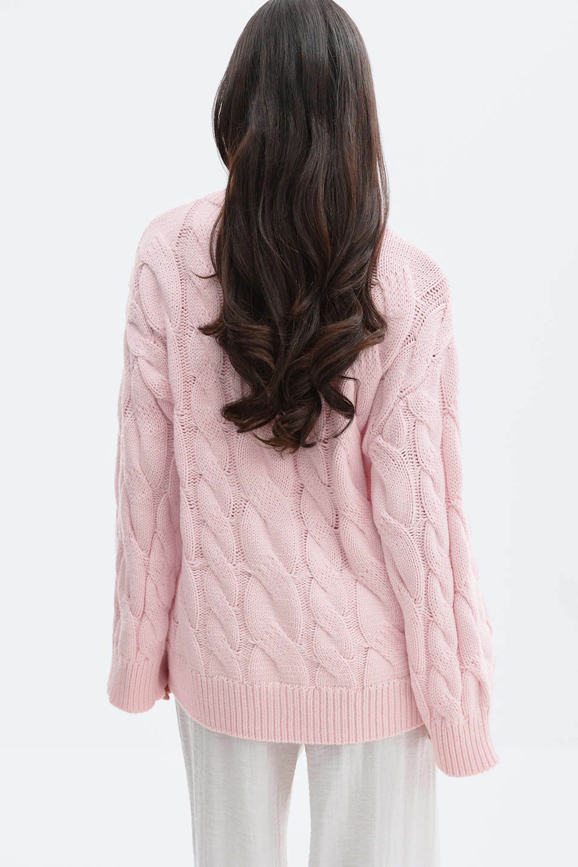 Im Zopfmuster gestrickte Strickjacke mit Knöpfen aus Perlmutt vorne. Die Strickjacke ist hellrosa und hat weit-geschnittenen Style. Sie hat Rundhalsausschnitt, langen Ärmel und gerippten Saum.
