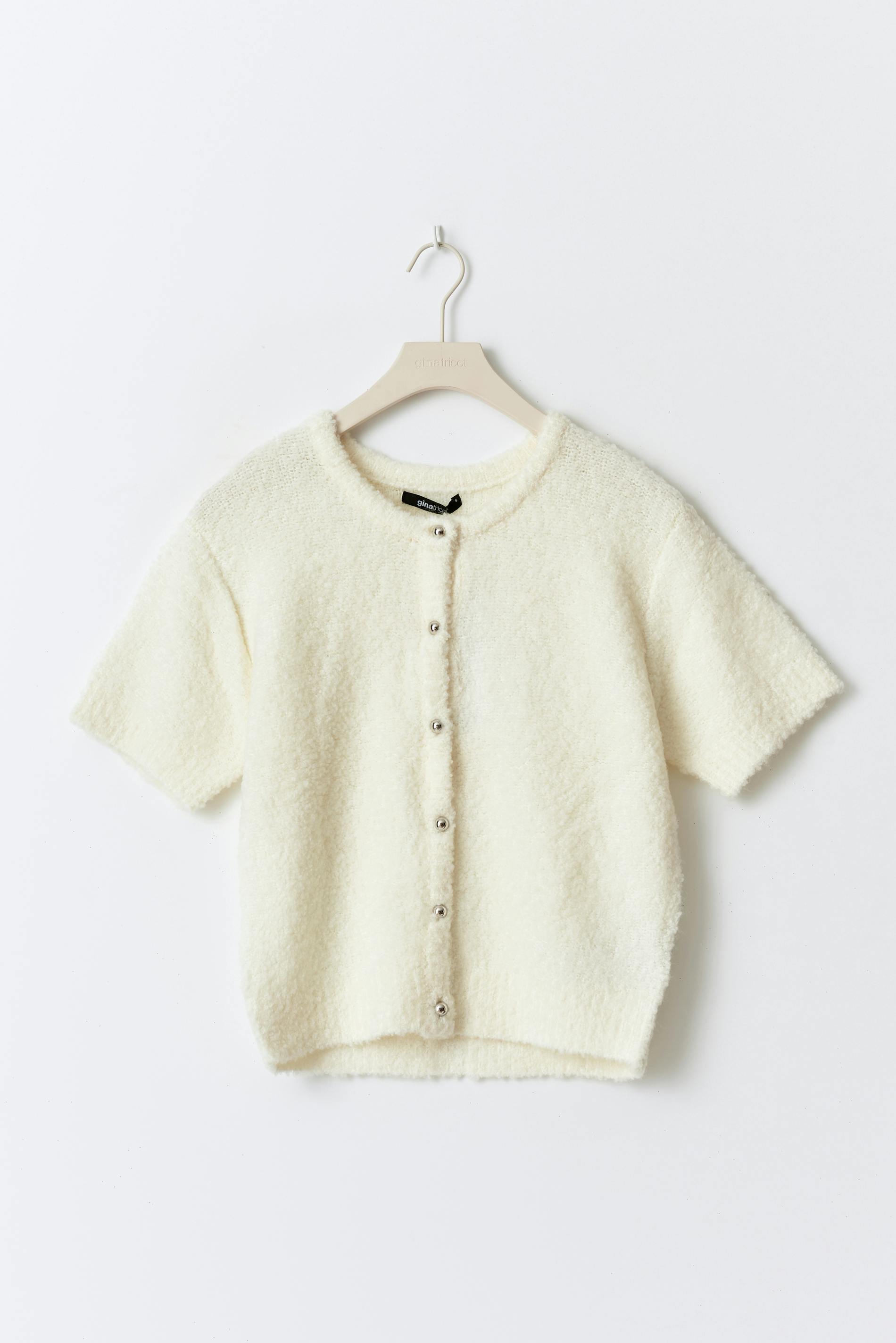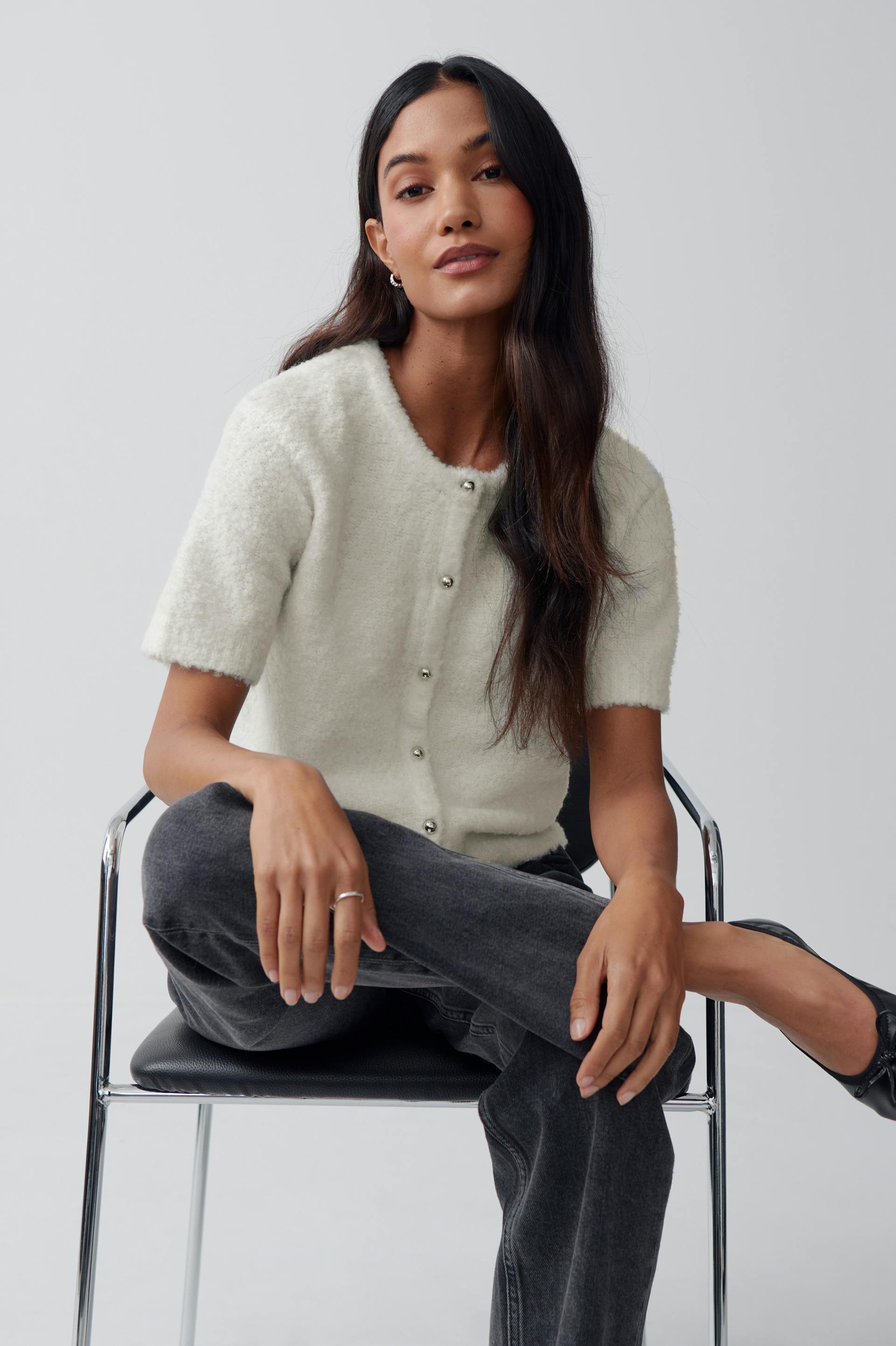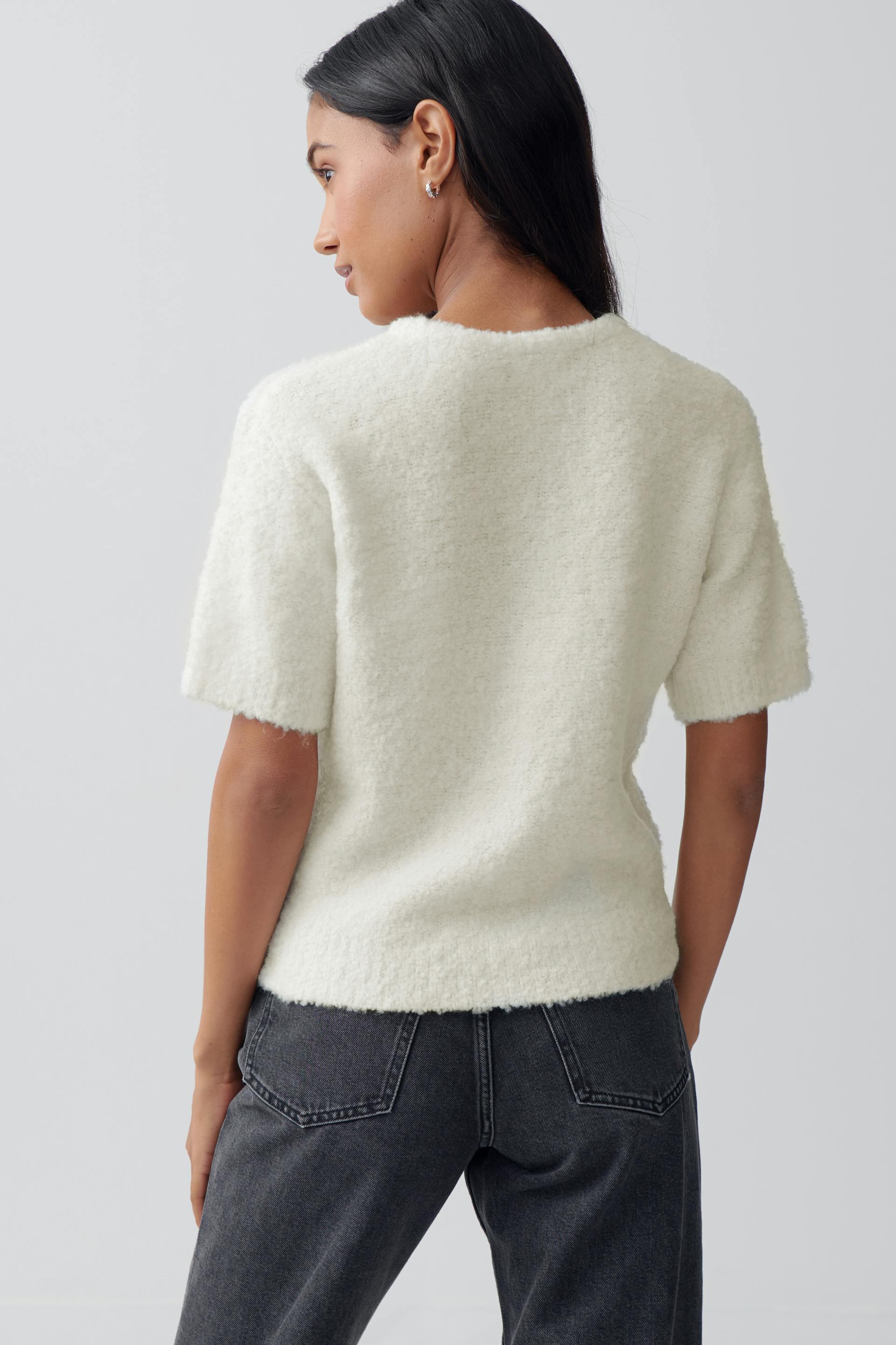 Kurzärmlige Strickjacke aus Bouclé-Stoff mit Knöpfen vorne. Die Strickjacke ist weiβ und hat normale Passform. Sie hat Rundhalsausschnitt, weiche, gestrickte Qualität und Rippenstrick an der Unterkante.