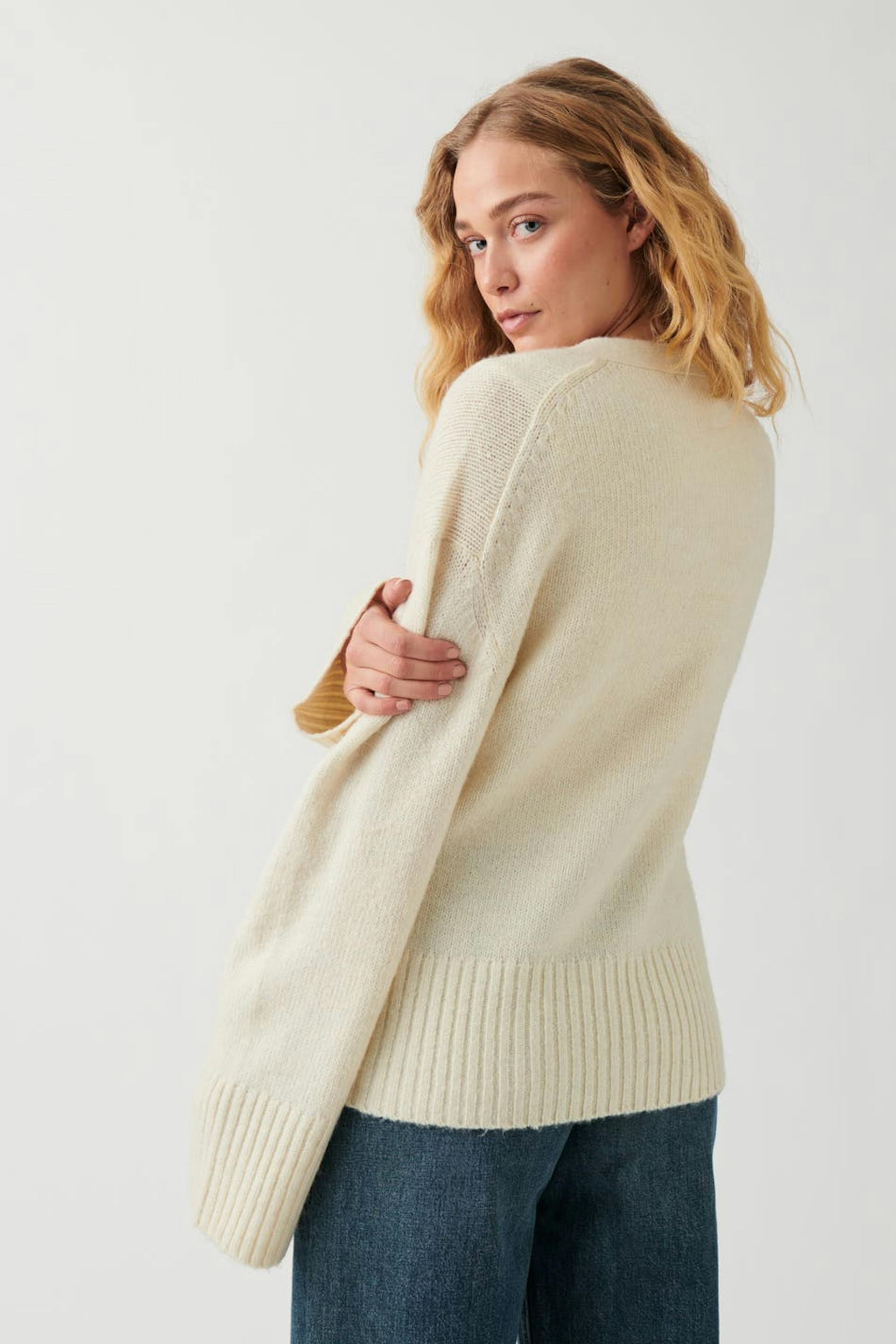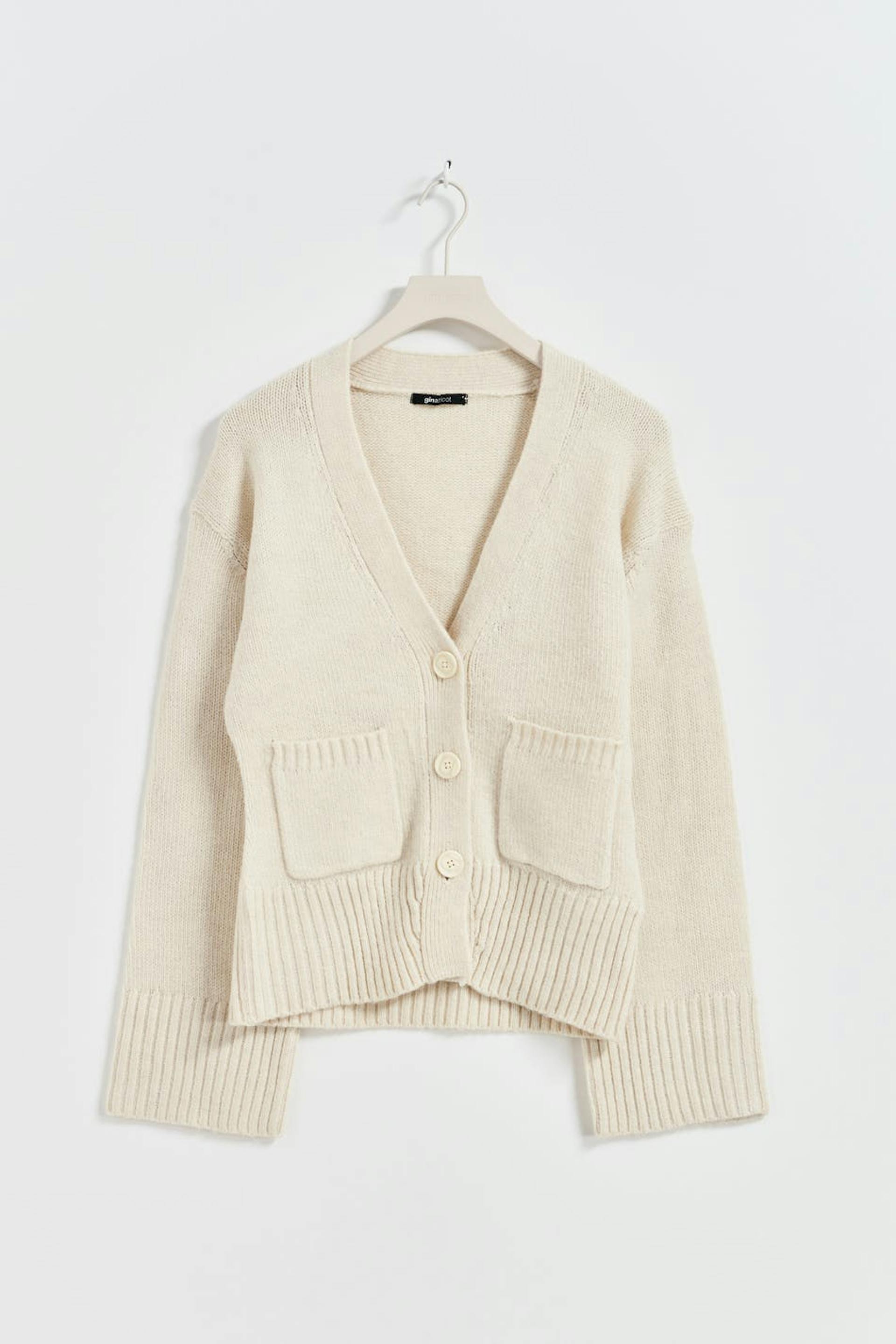 Gestrickter Cardigan mit boxy Passform. Der Cardigan ist weiβ und hat Taschen in den Seiten. Er hat V-Ausschnitt, Knöpfung vorne und breite Rippe an der Unterkante.