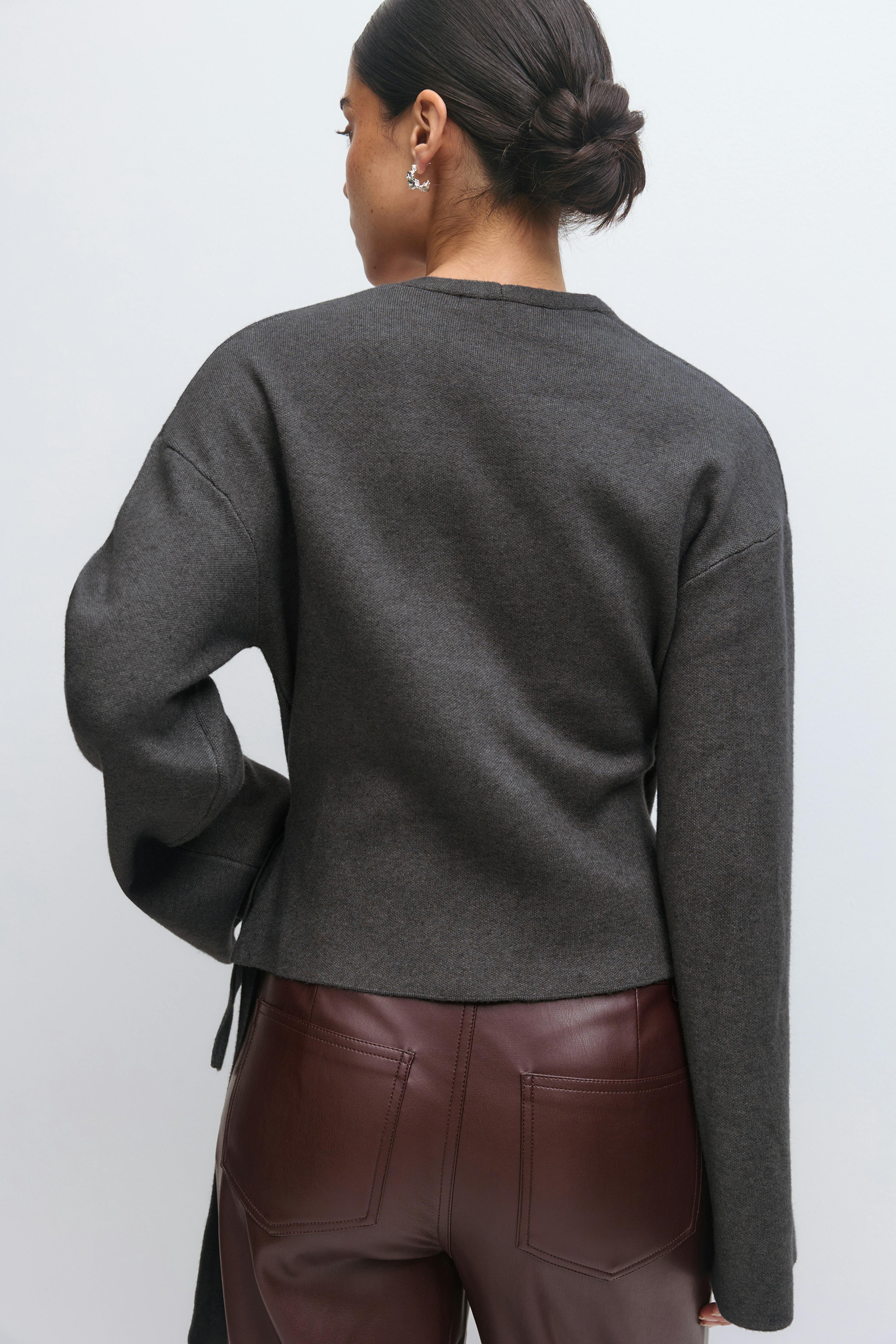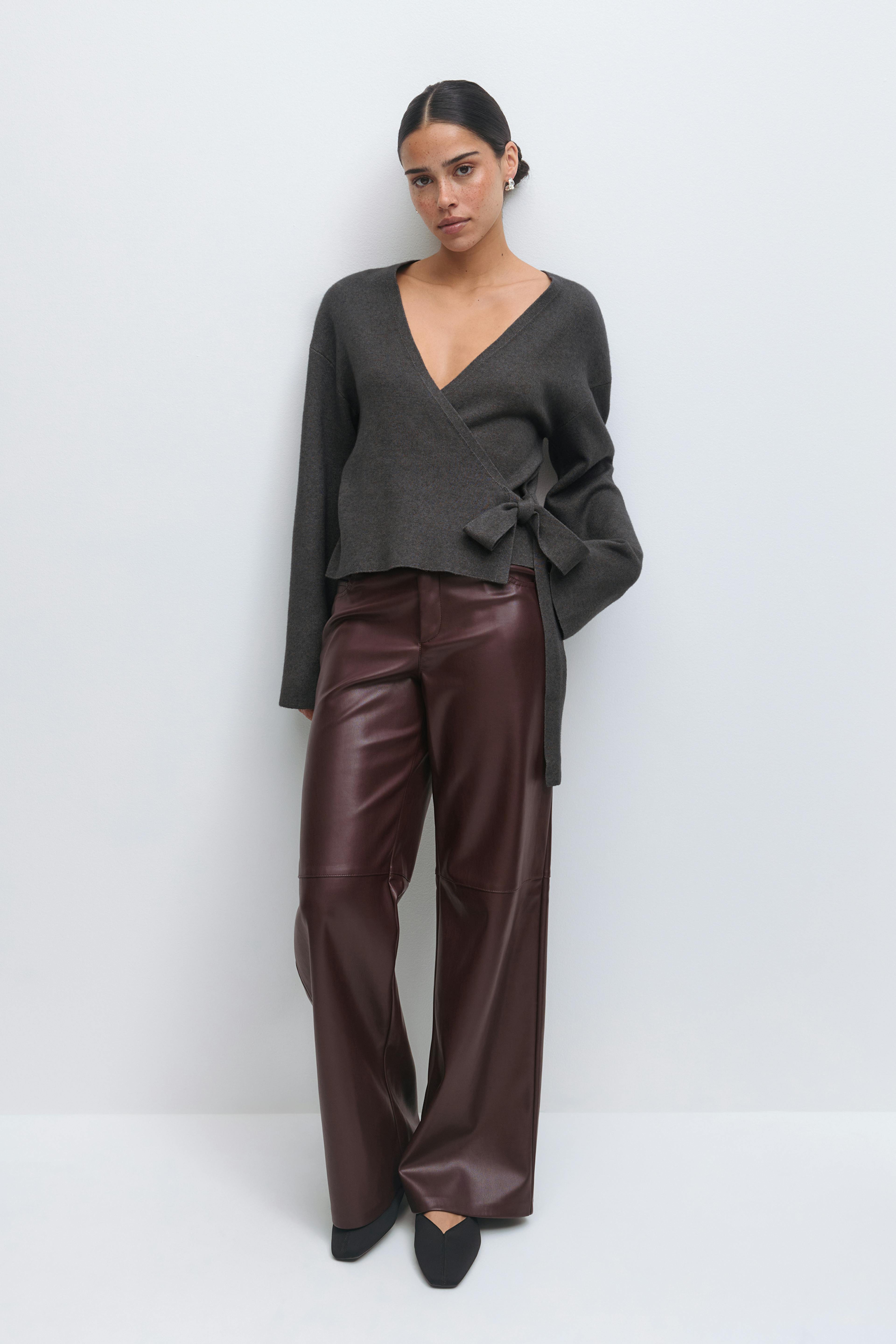 Anthrazitfarbener Wickelpullover mit V-Ausschnitt, langen Ärmeln und seitlicher Bindung, kombiniert mit einer burgunderroten Lederhose mit hoher Taille.