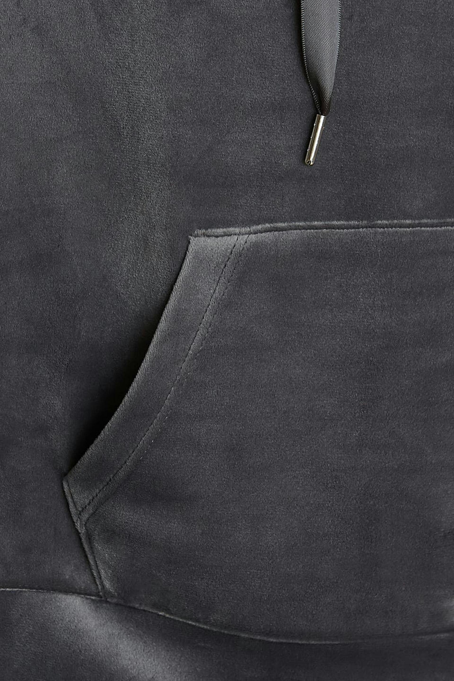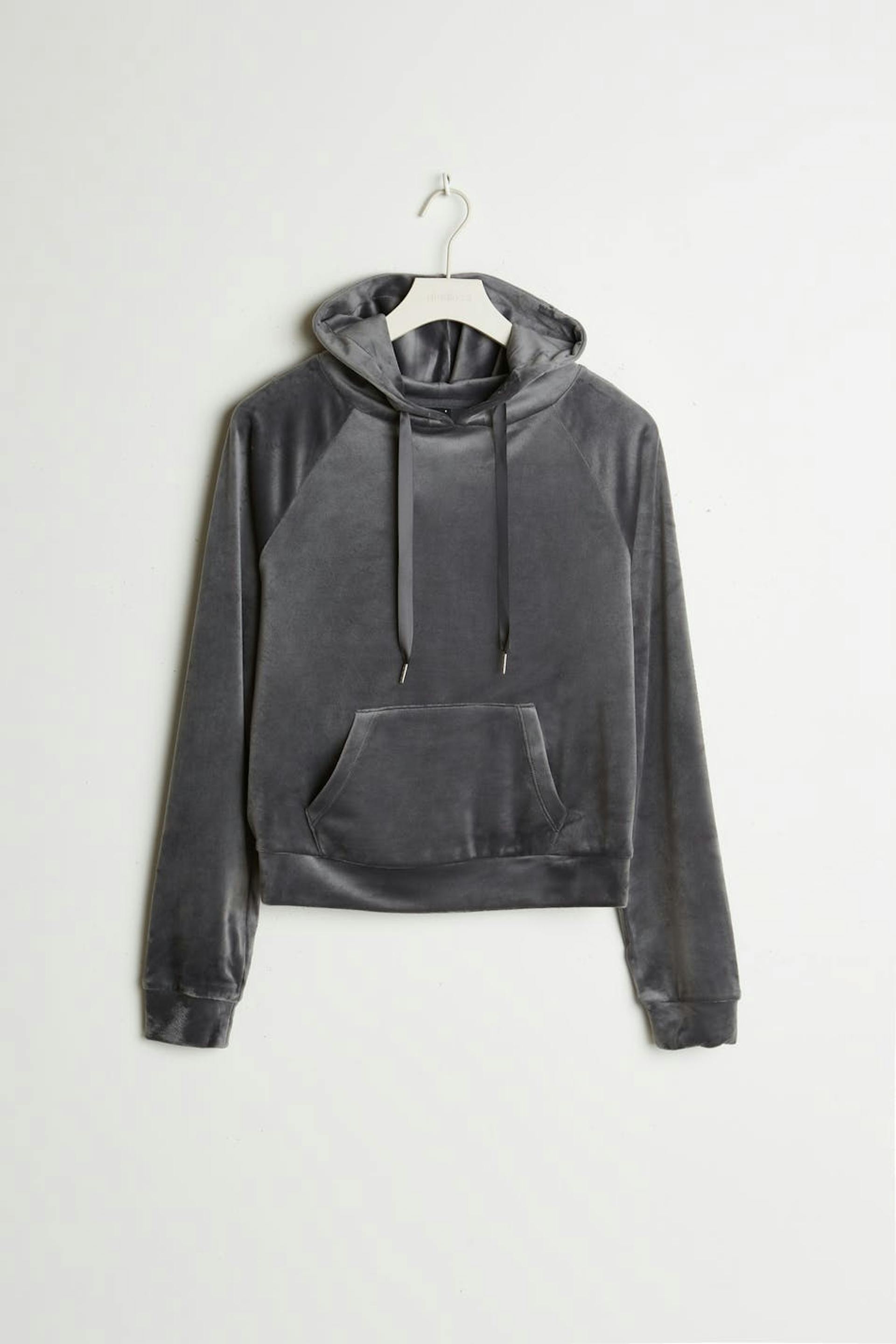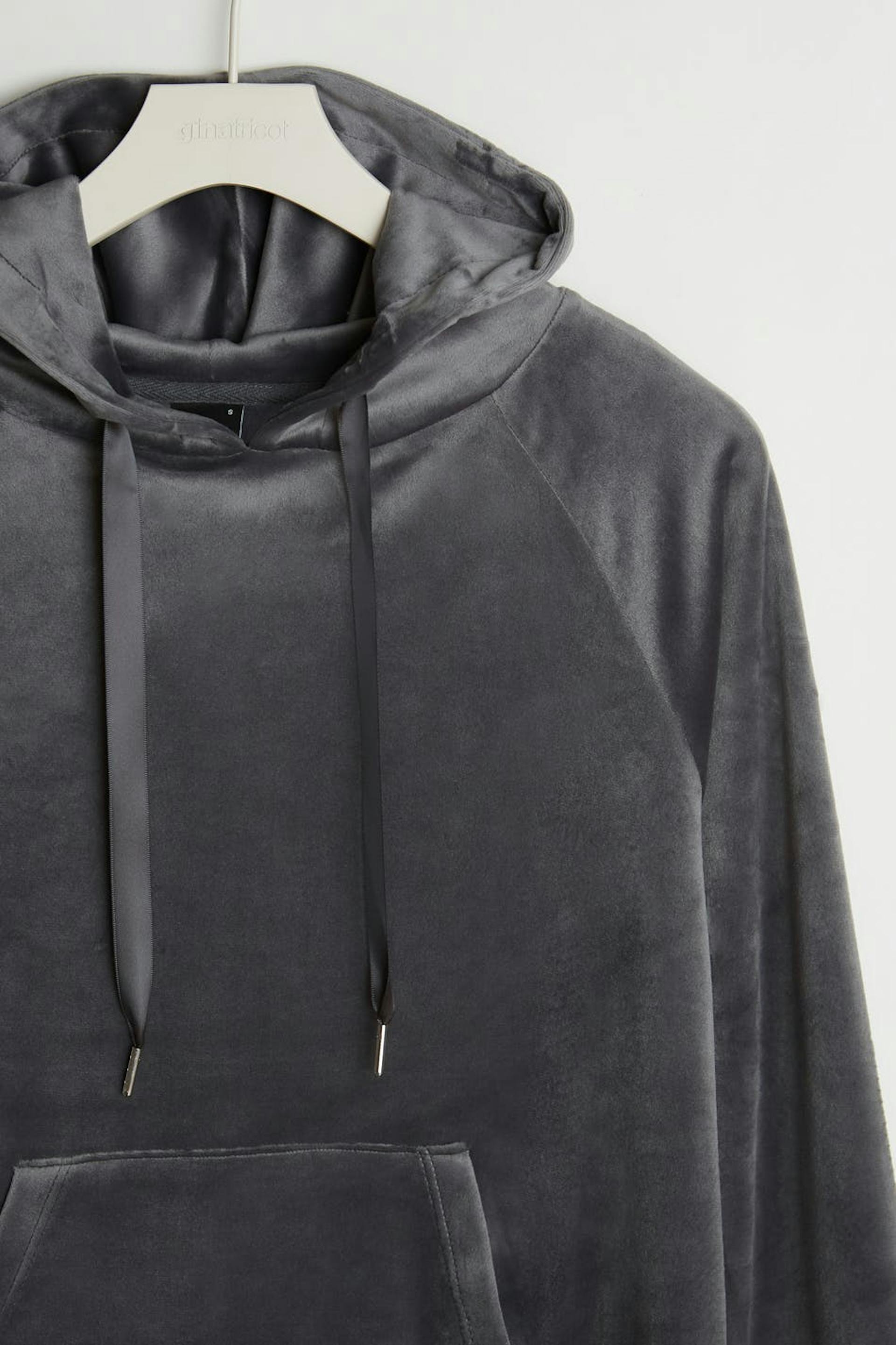 Pullover mit einer Kapuze mit einem Kordelzug aus Satin. Der Pullover ist dunkelgrau und hat eine Beuteltasche auf der Vorderseite. Er ist hergestellt aus Velours. Von Feuerquellen fernhalten.
