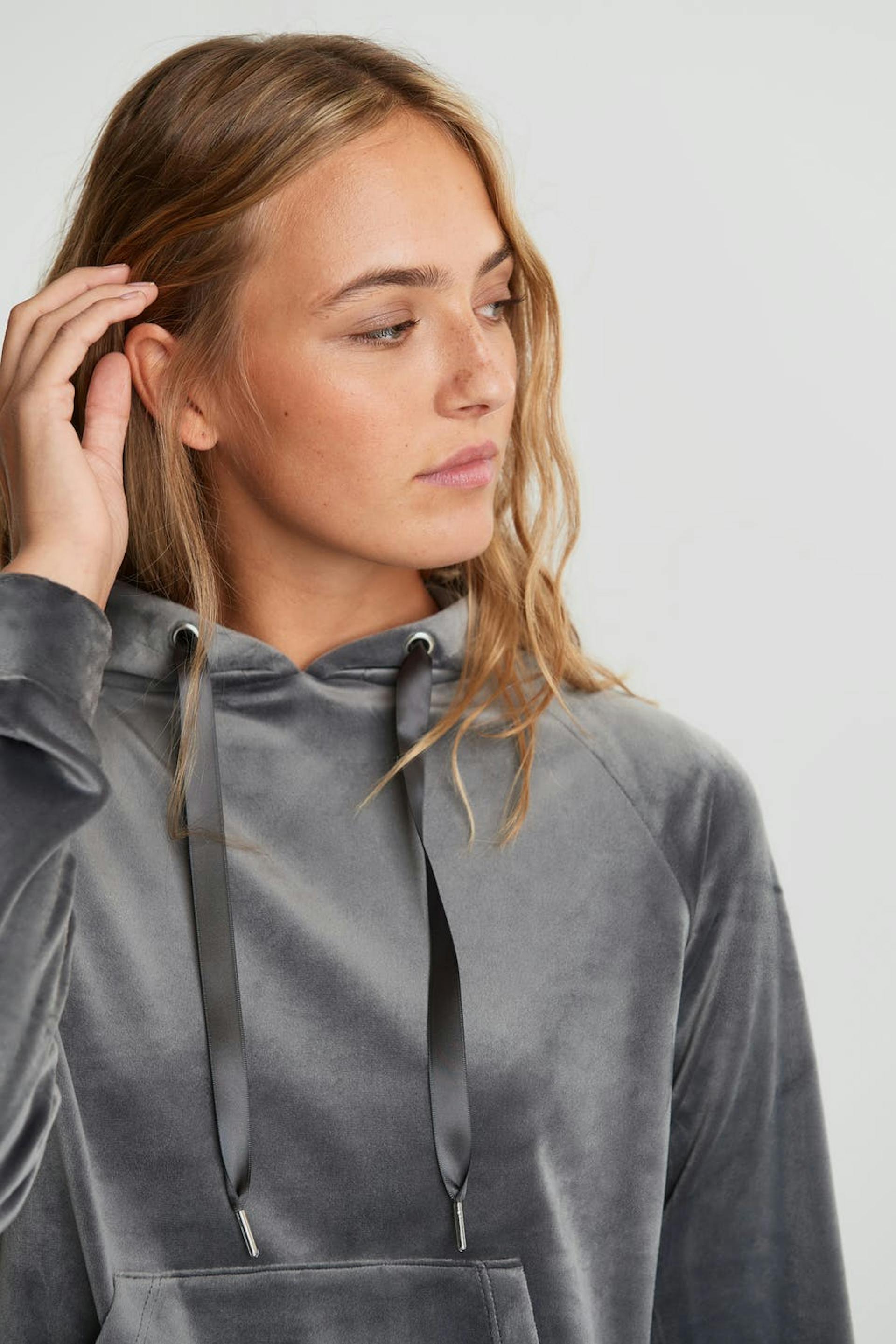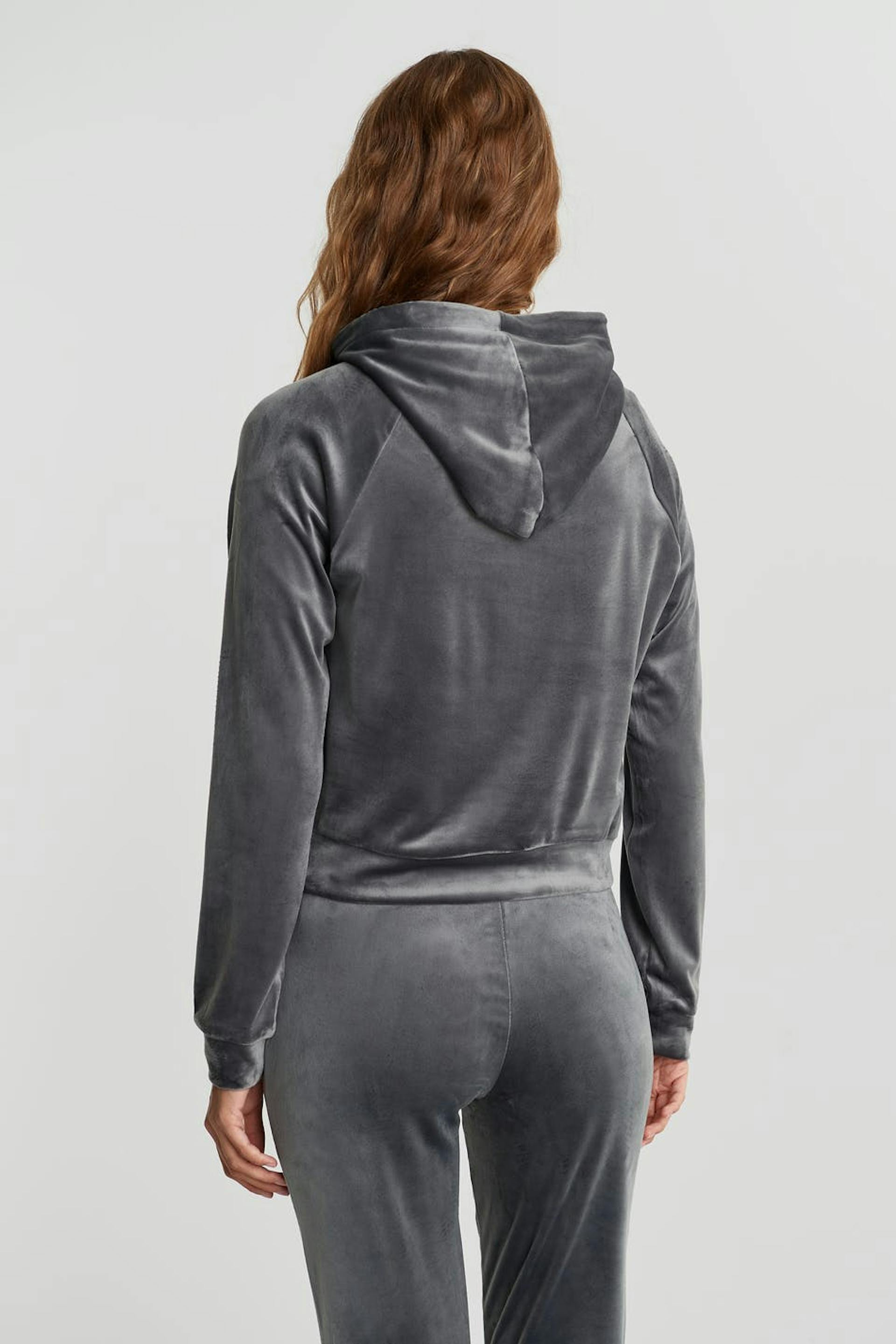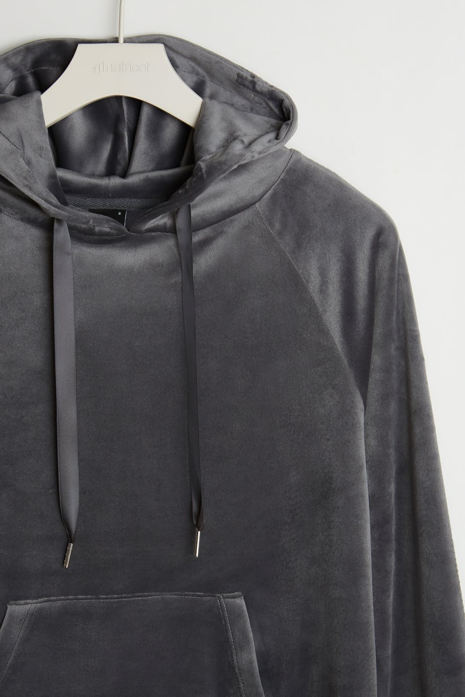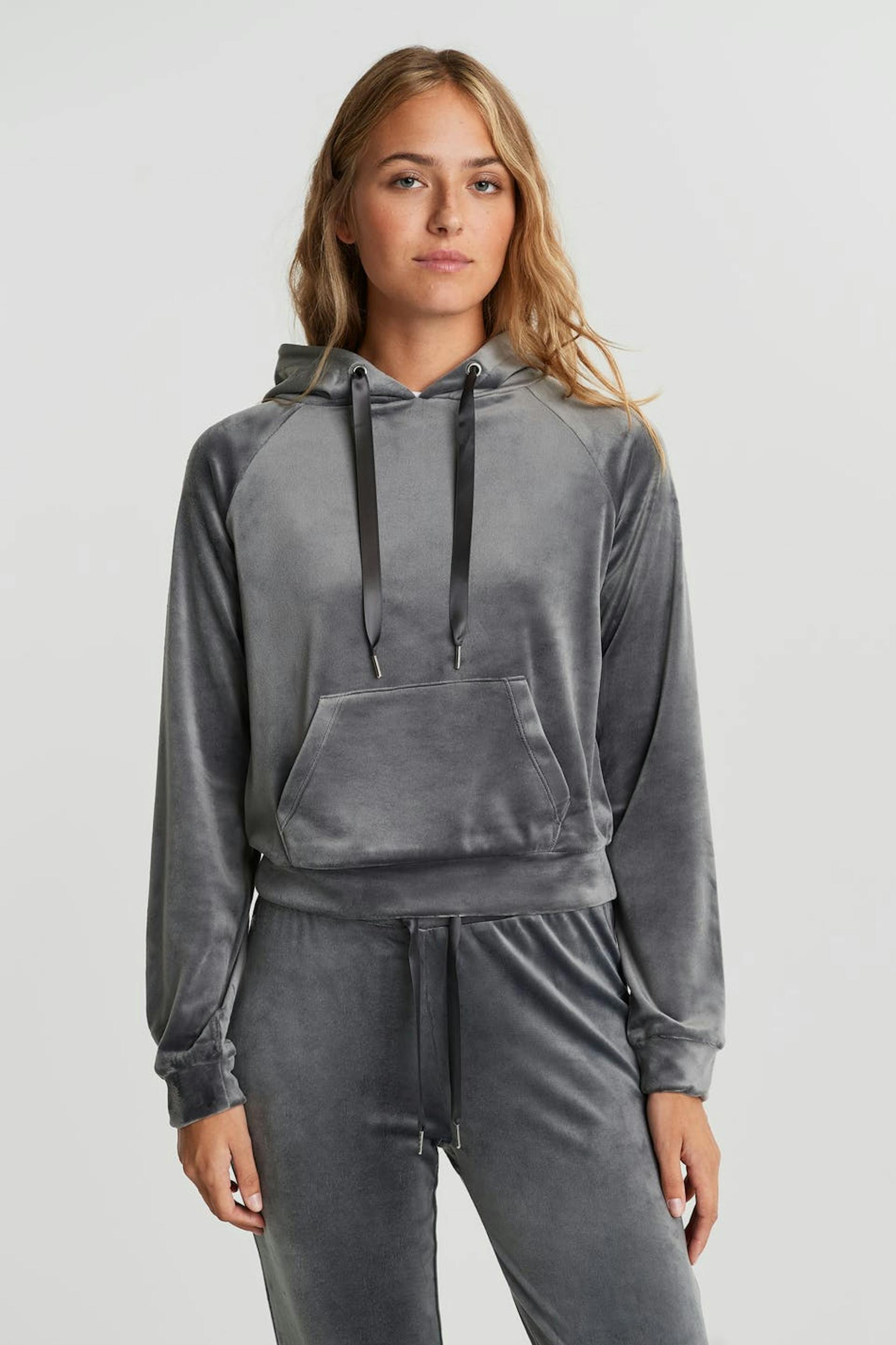 Pullover mit einer Kapuze mit einem Kordelzug aus Satin. Der Pullover ist dunkelgrau und hat eine Beuteltasche auf der Vorderseite. Er ist hergestellt aus Velours. Von Feuerquellen fernhalten.