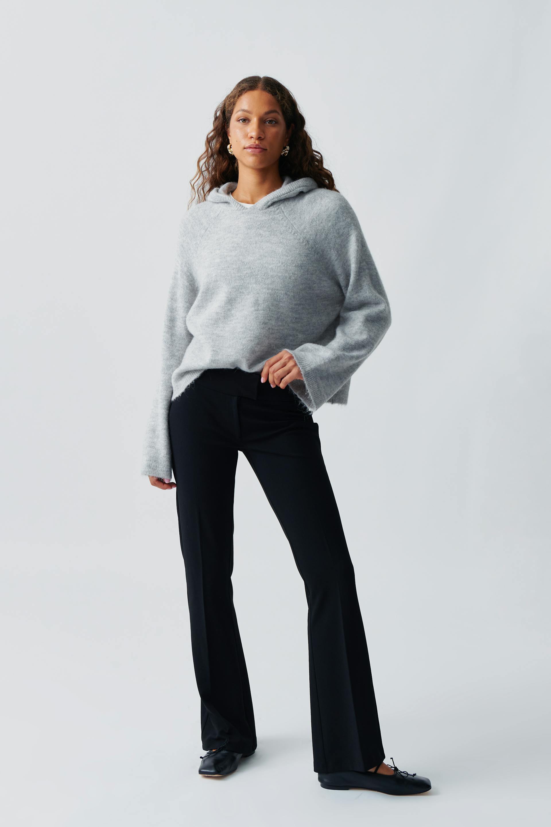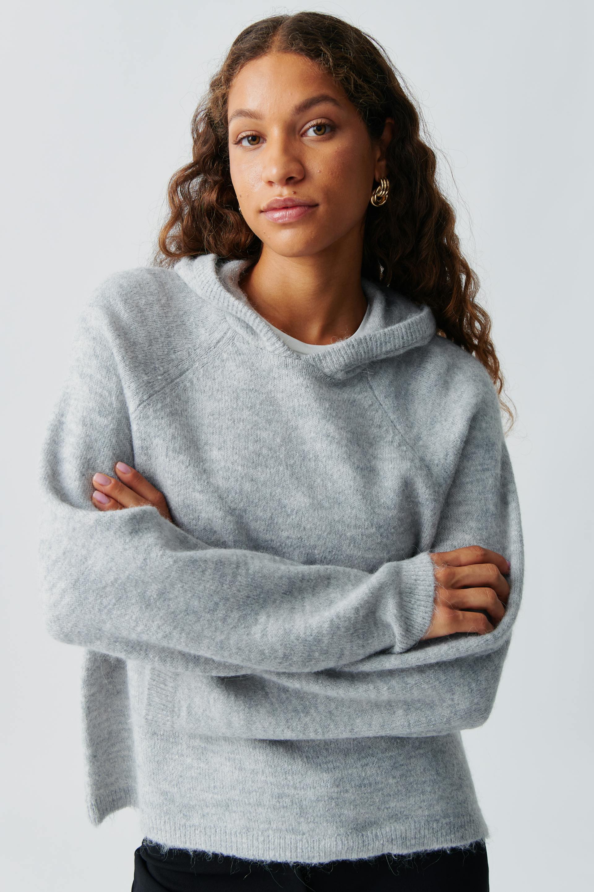 Gestrickter Hoodie mit Oversize-Passform. Der Hoodie ist grau und hat langen Ärmel. Er hat Rundhalsausschnitt, normale Länge und Rippenstrick an der Unterkante.