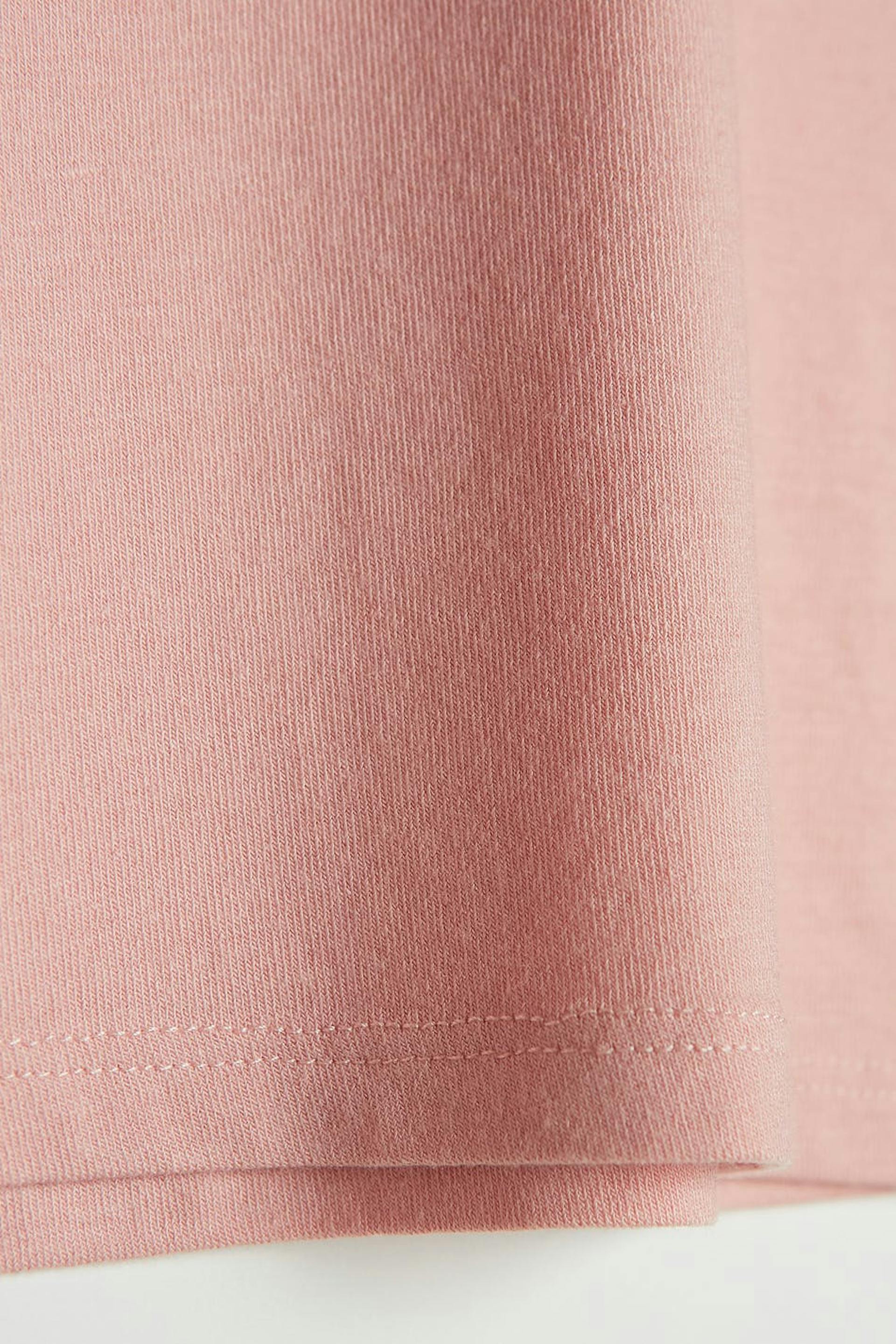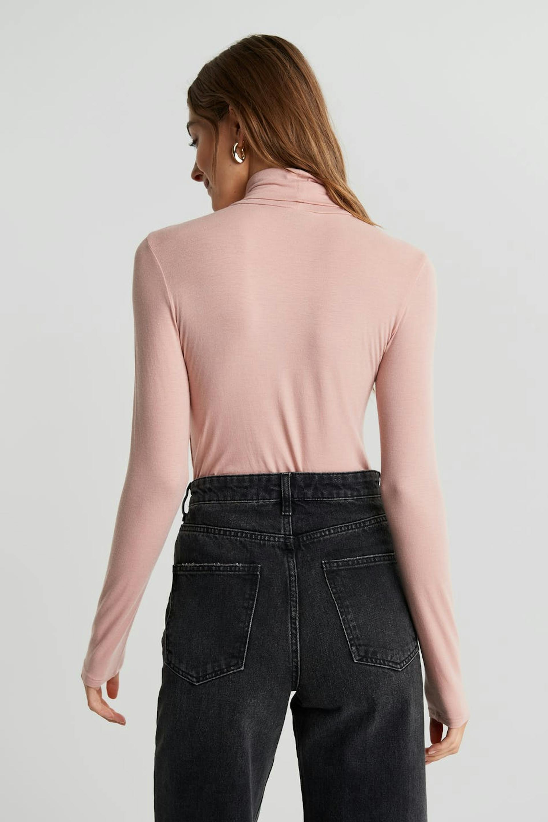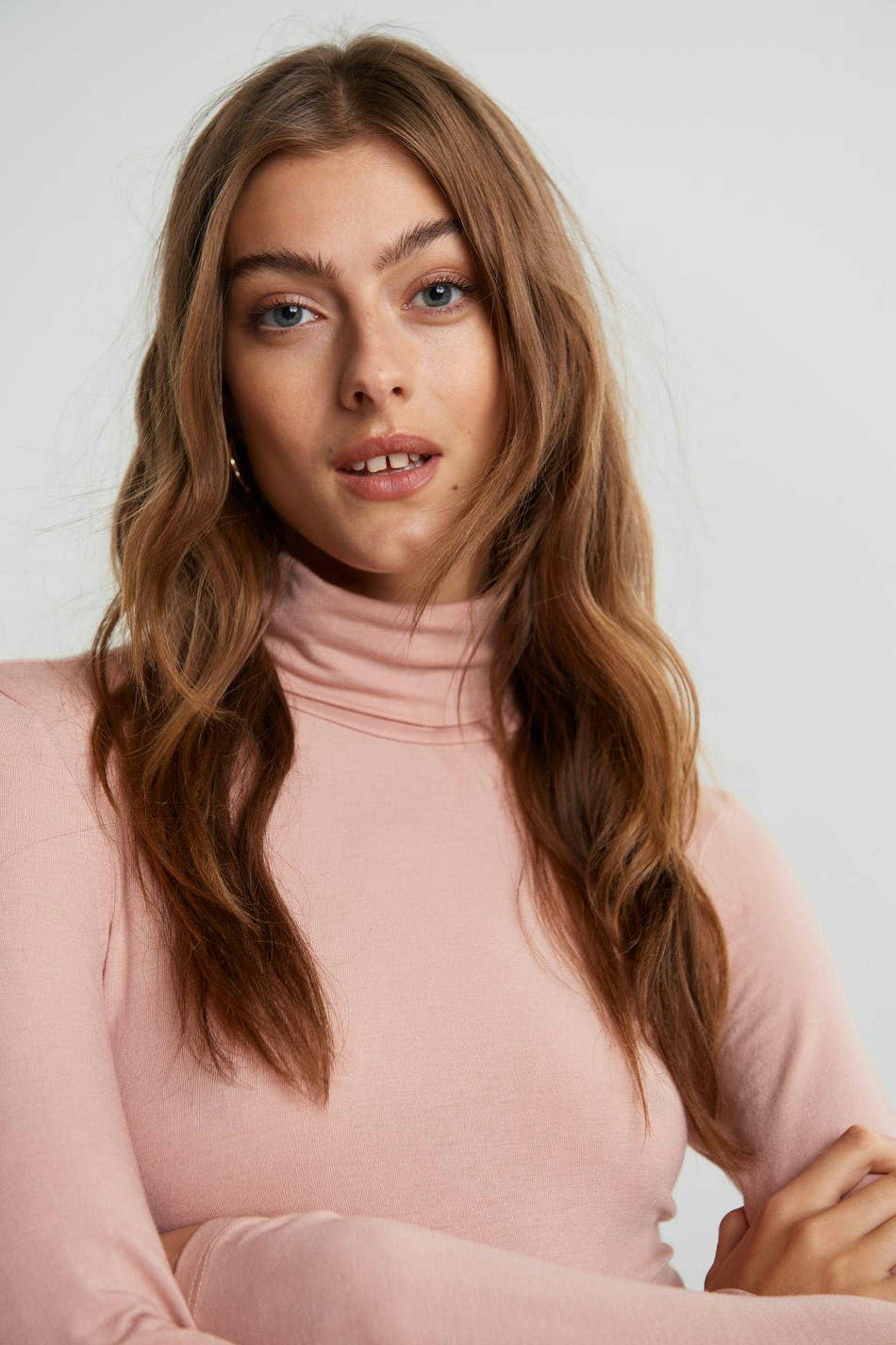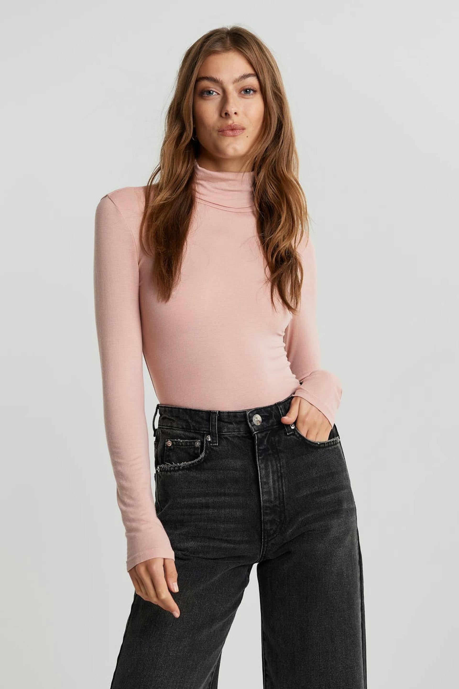 Weicher Rollkragen mit einer taillierten Passform. Der Pullover ist rosa.