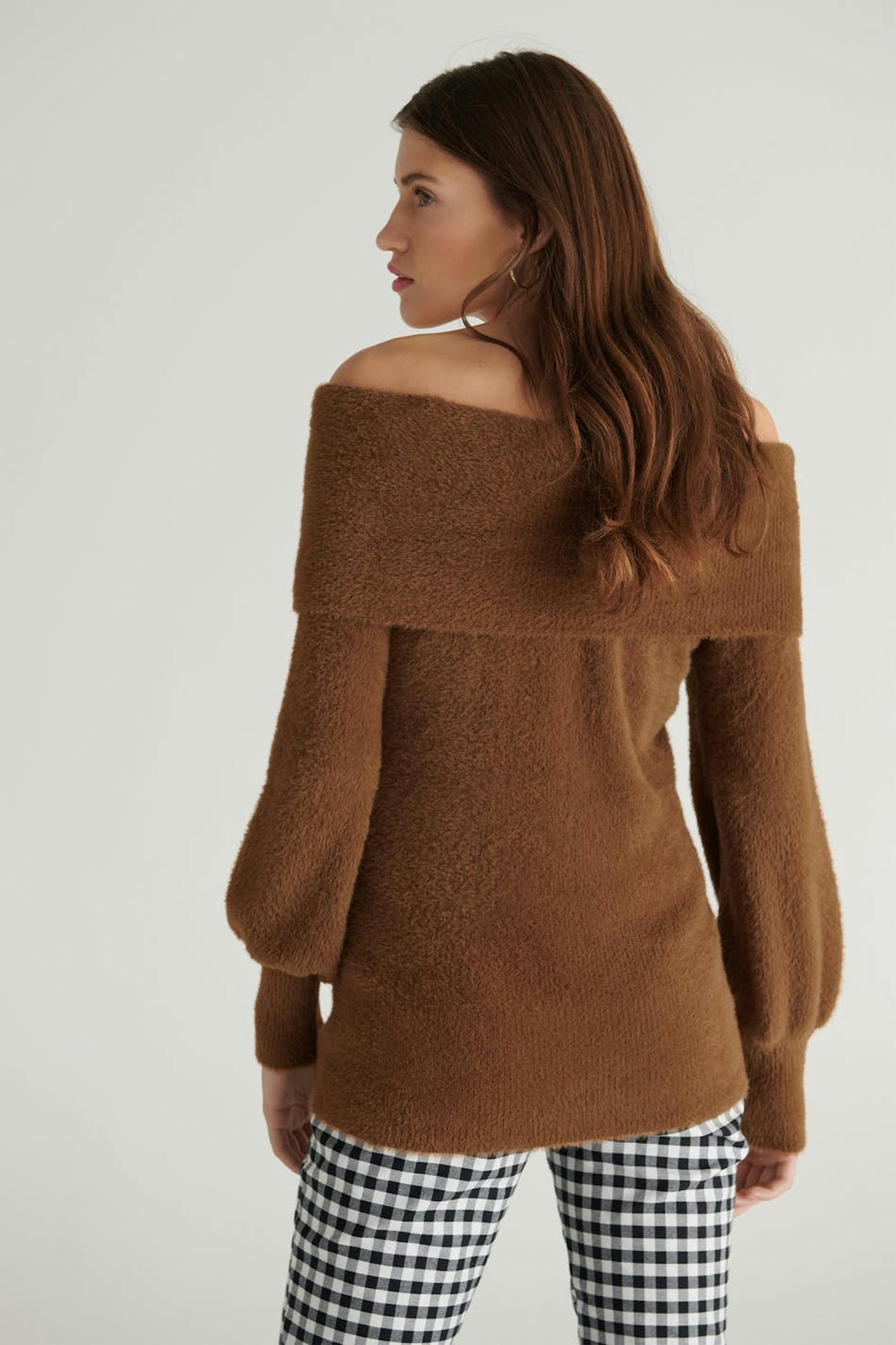 Gestrickter schulterfreier Pullover mit einer Kante auf der Oberseite mit einem Umlegekragen. Der Pullover ist braun, gestrickt und langärmlig.