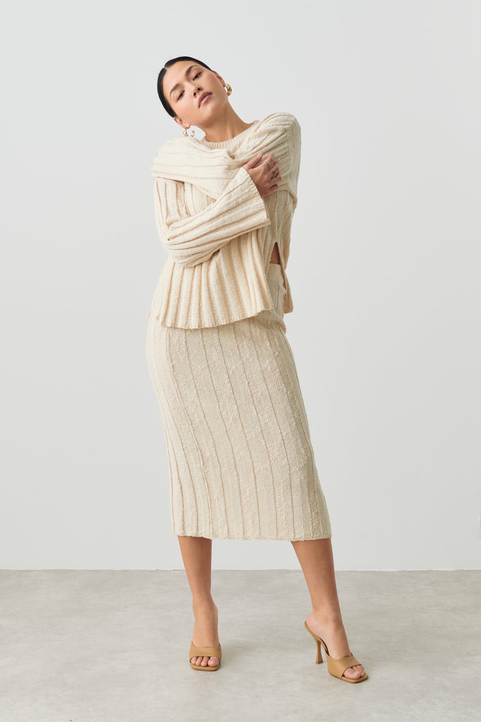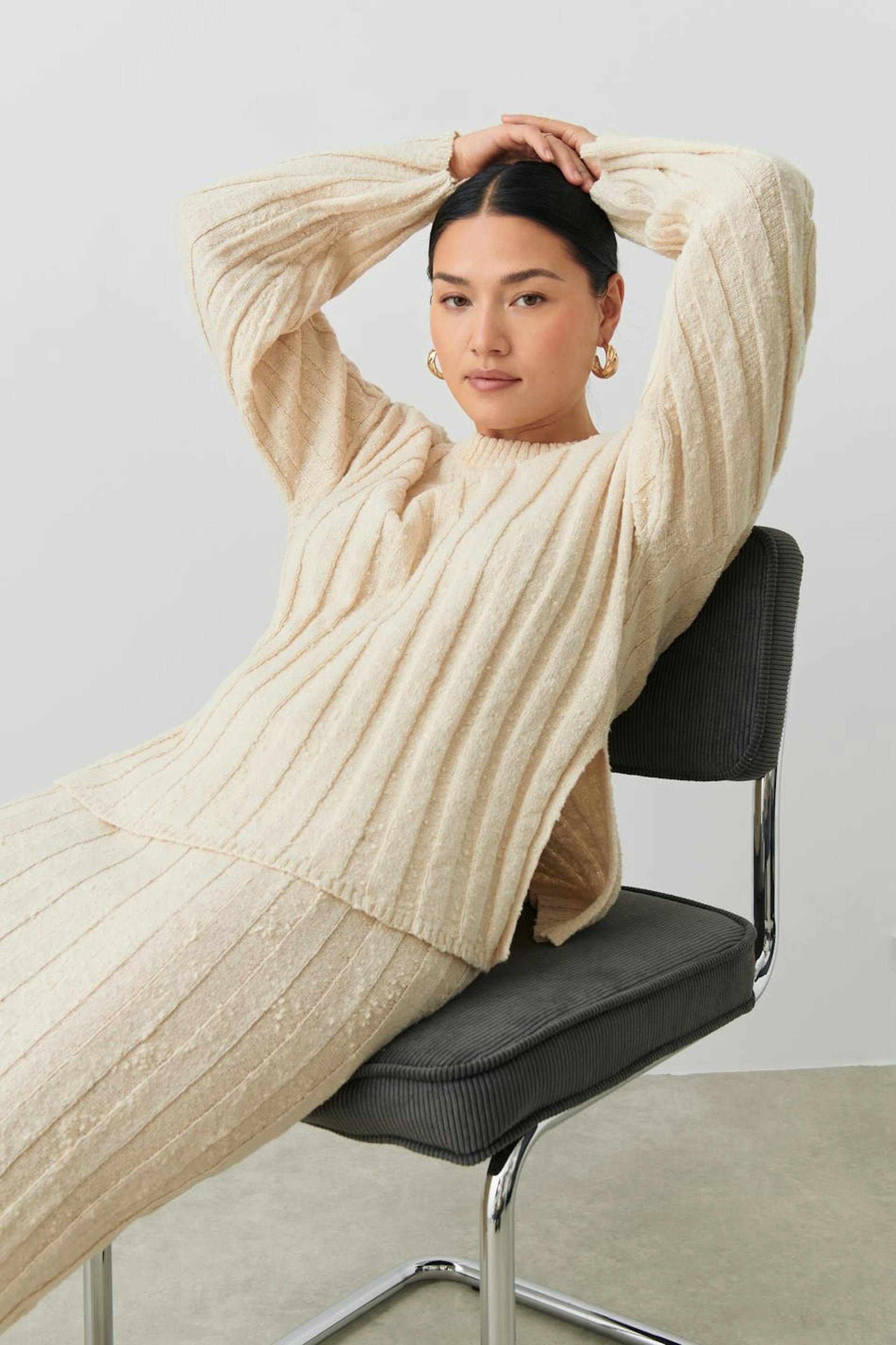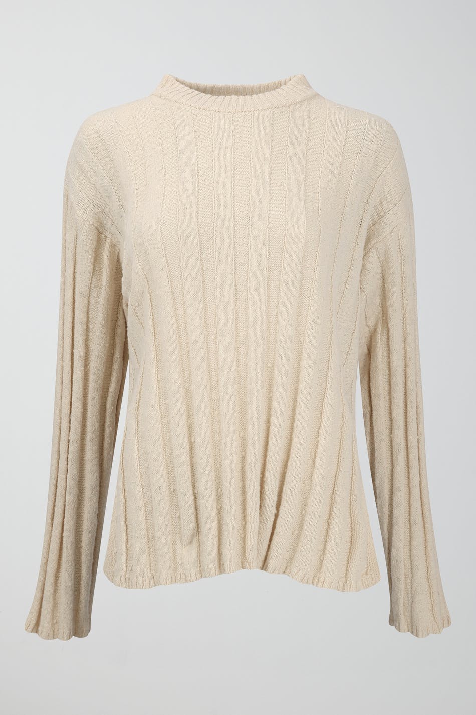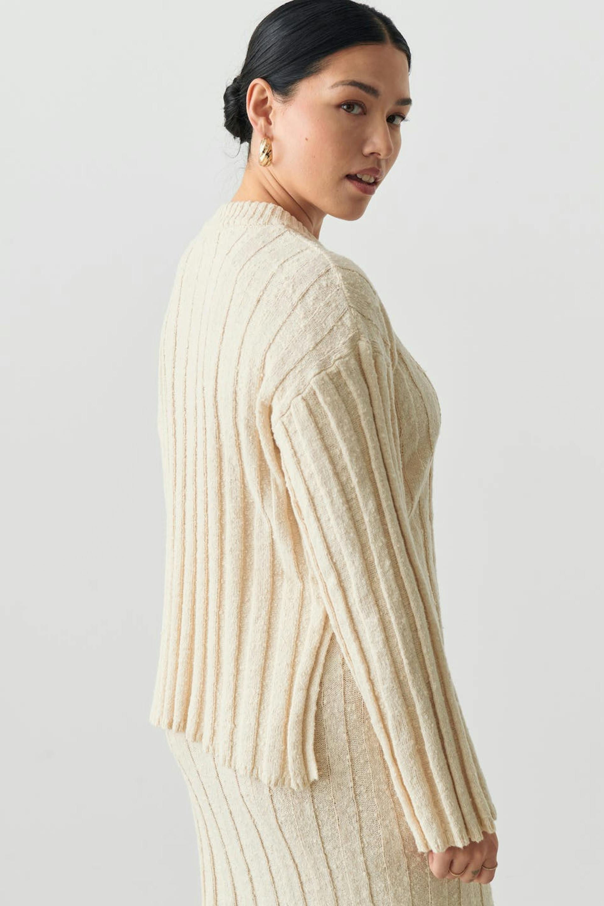 Gestrickter Pullover mit breiter Rippe. Der Pullover ist beige und hat Schlitz in den Seiten. Er hat Rundhalsausschnitt und lange Ärmel.
