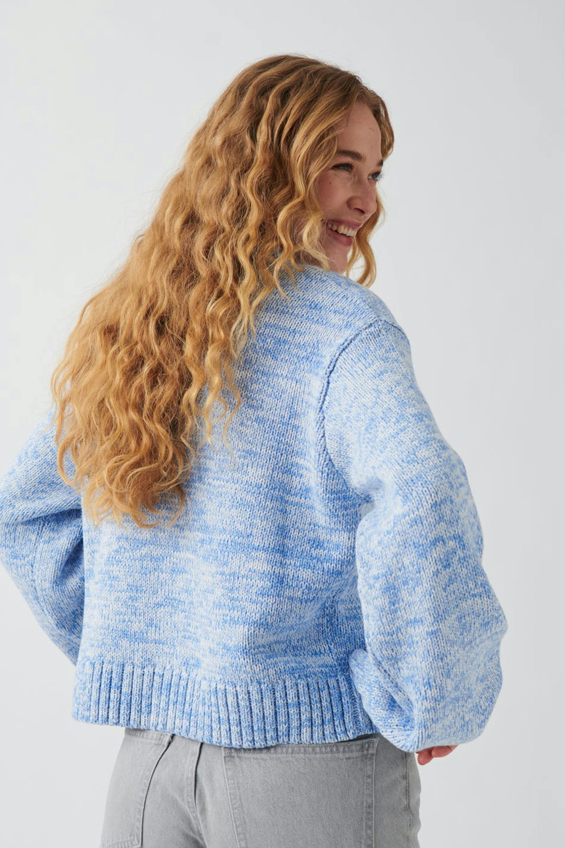 Gestrickter Pullover aus Baumwolle mit boxy Passform. Der Pullover ist blau und hat weiche Qualität. Er hat Rundhalsausschnitt und Rippenstrick an den Ärmelenden und an der Unterkante.