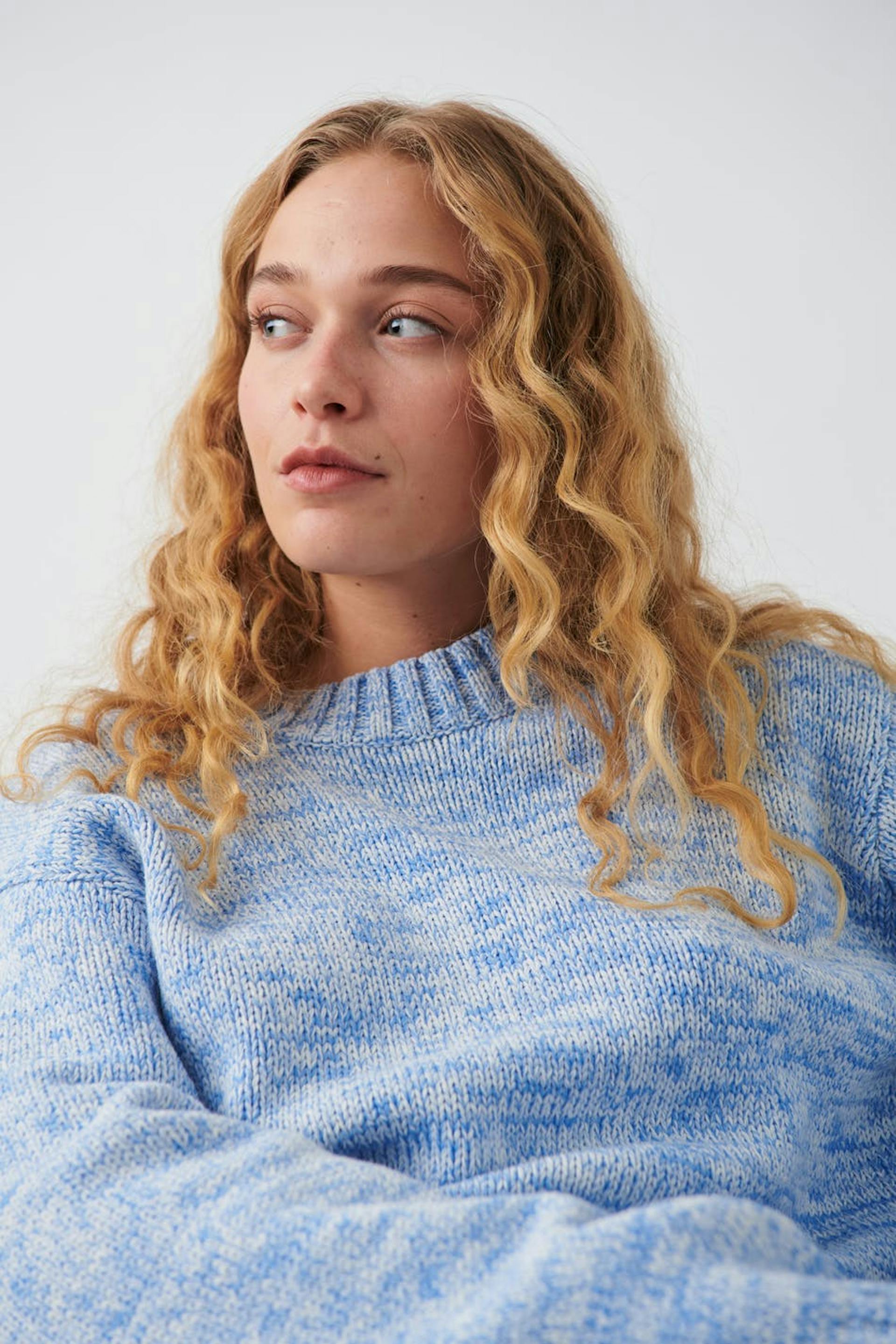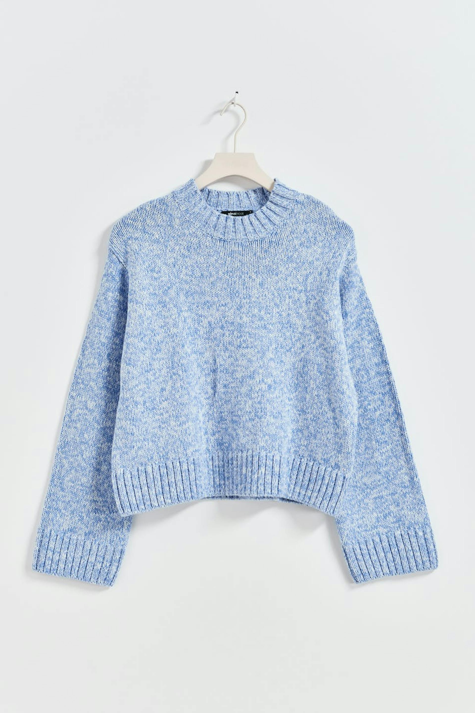 Gestrickter Pullover aus Baumwolle mit boxy Passform. Der Pullover ist blau und hat weiche Qualität. Er hat Rundhalsausschnitt und Rippenstrick an den Ärmelenden und an der Unterkante.