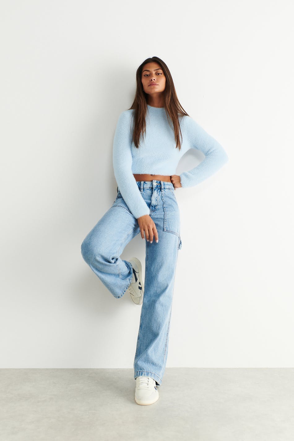 Flauschiger Pullover mit einer weichen Qualität. Der Pullover ist blau, gestrickt und abgeschnitten. Er hat normale Passform, Rundhalsausschnitt und gerippten Saum.