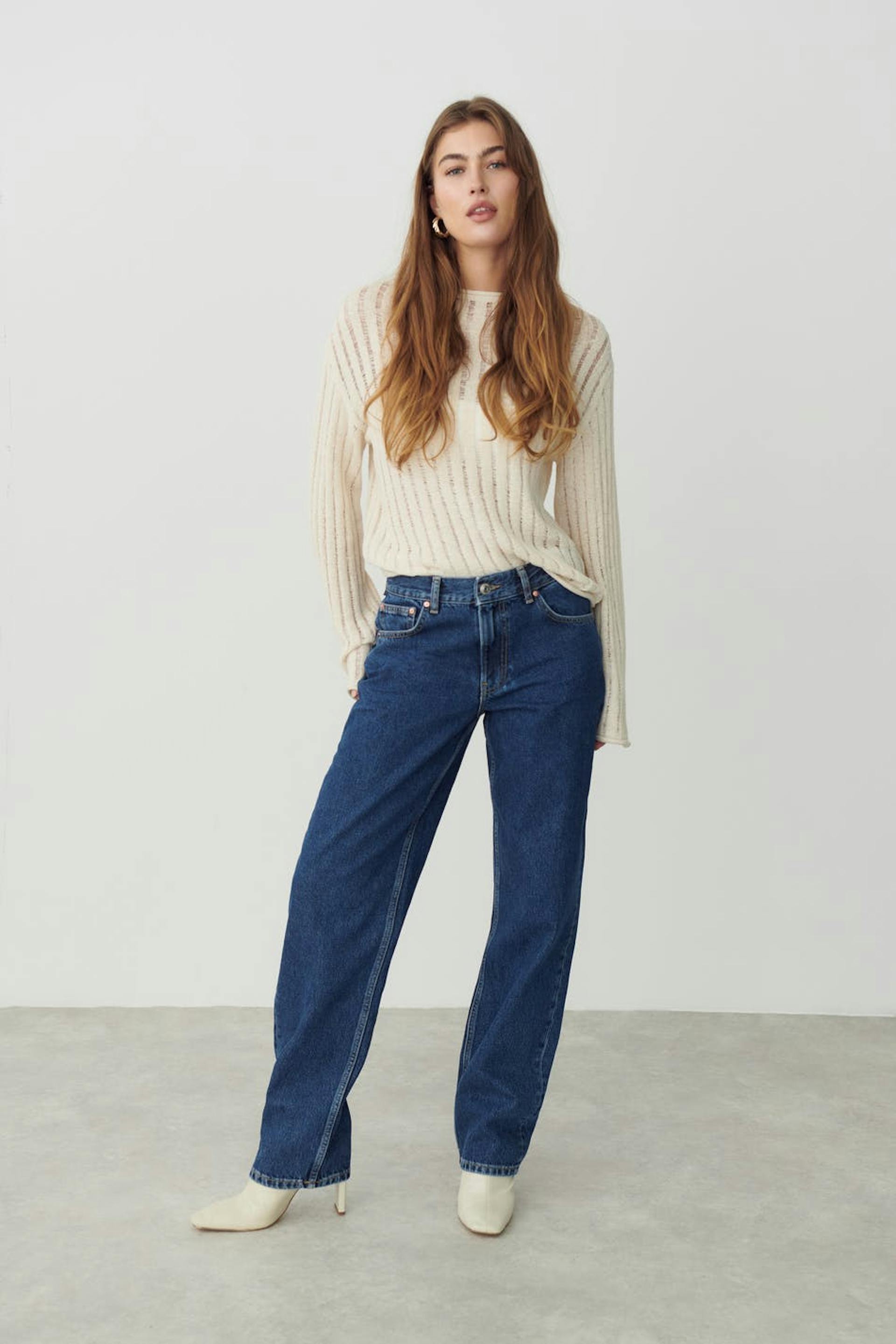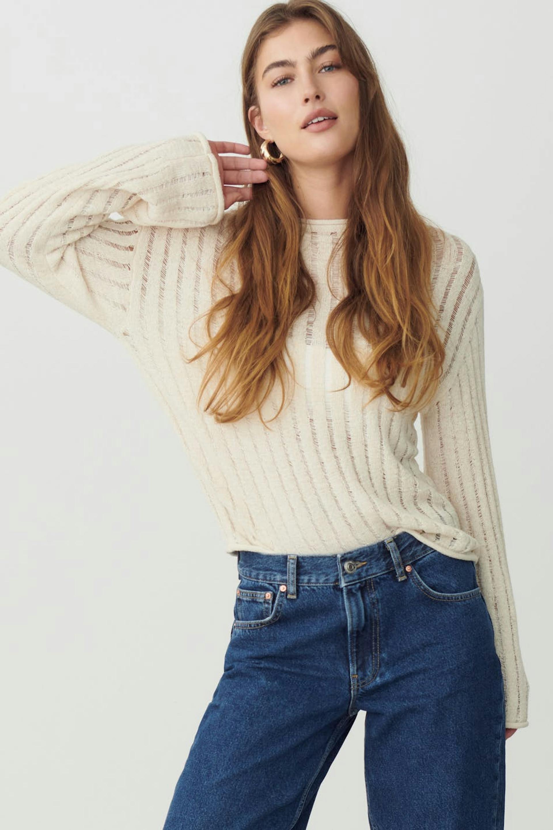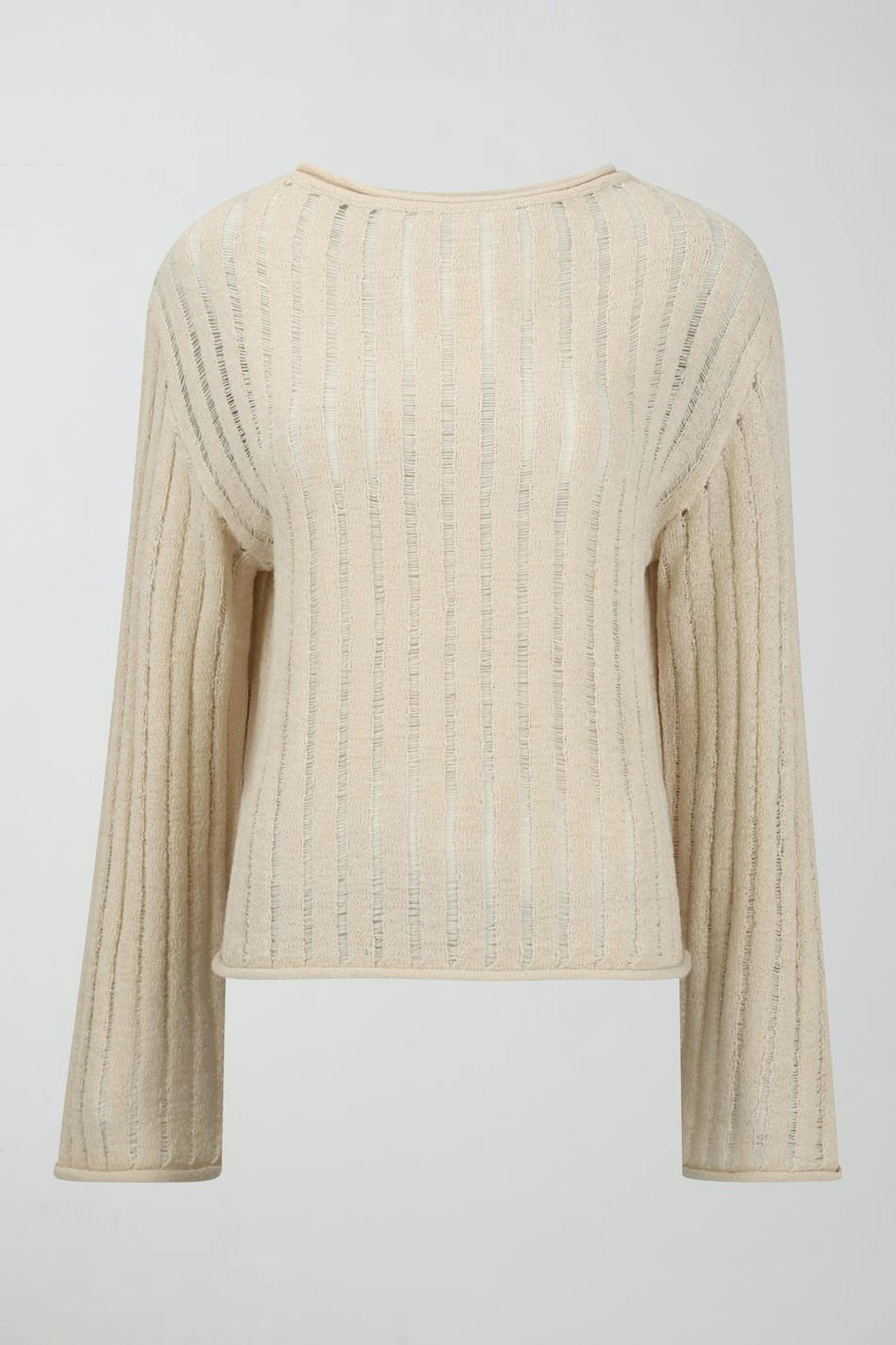 Gestrickter Pullover mit einer Oversize-Passform. Der Pullover ist beige und hat U-Boot-Ausschnitt.