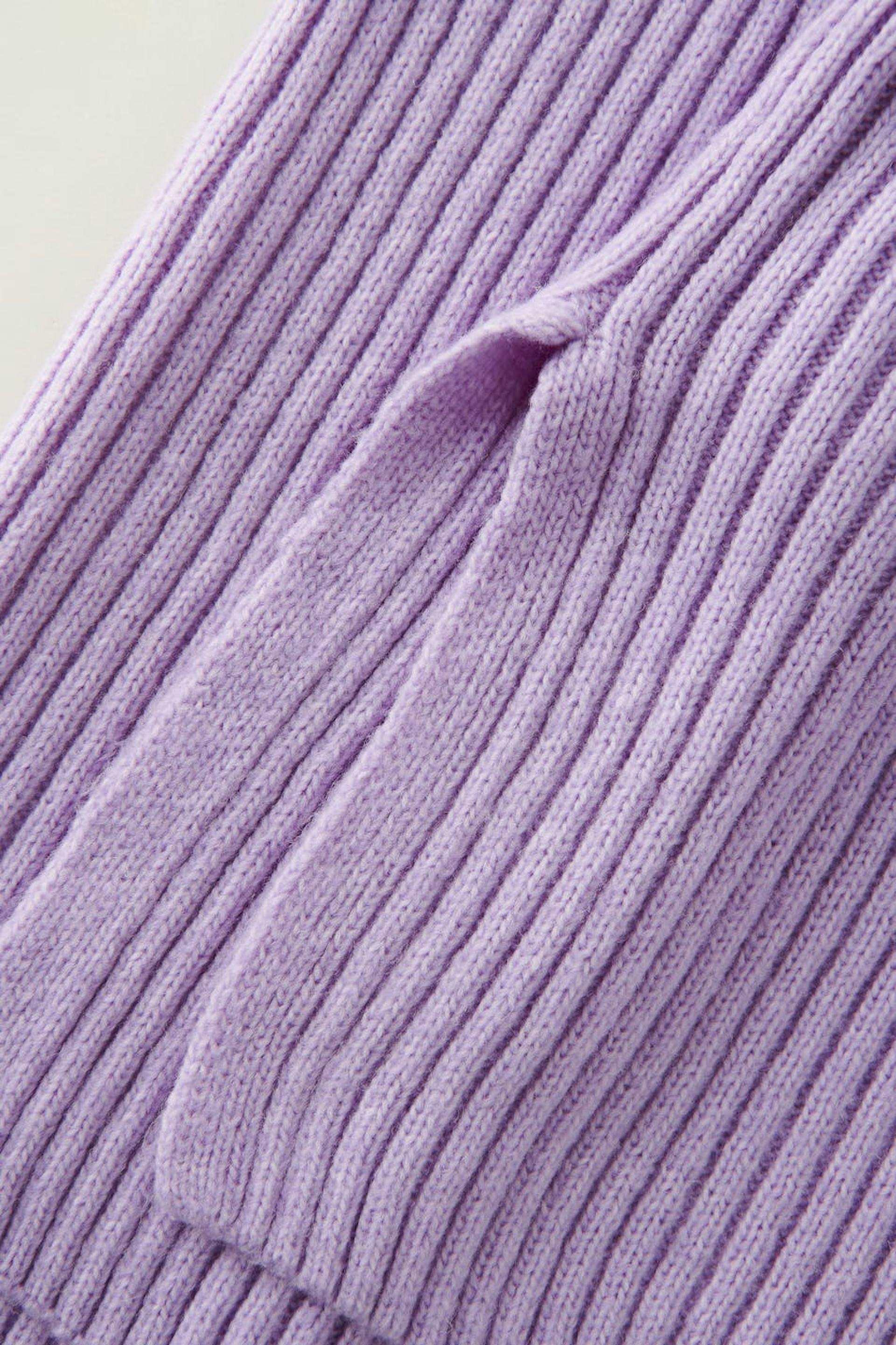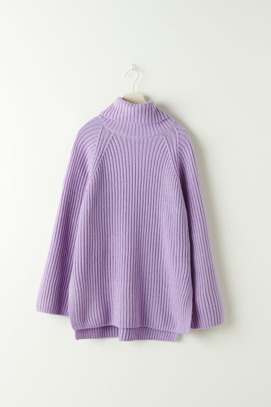 Gestrickter Pullover aus weicher Qualität mit Rollkragen mit einem Umlegekragen. Der Pullover ist lila und hat boxy Passform. Er hat Raglanärmel und Schlitz in den Seiten.