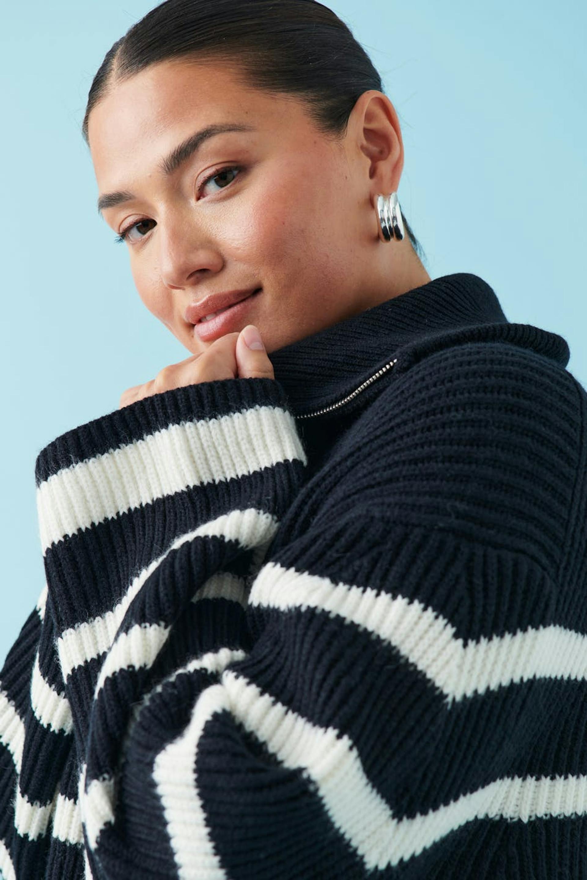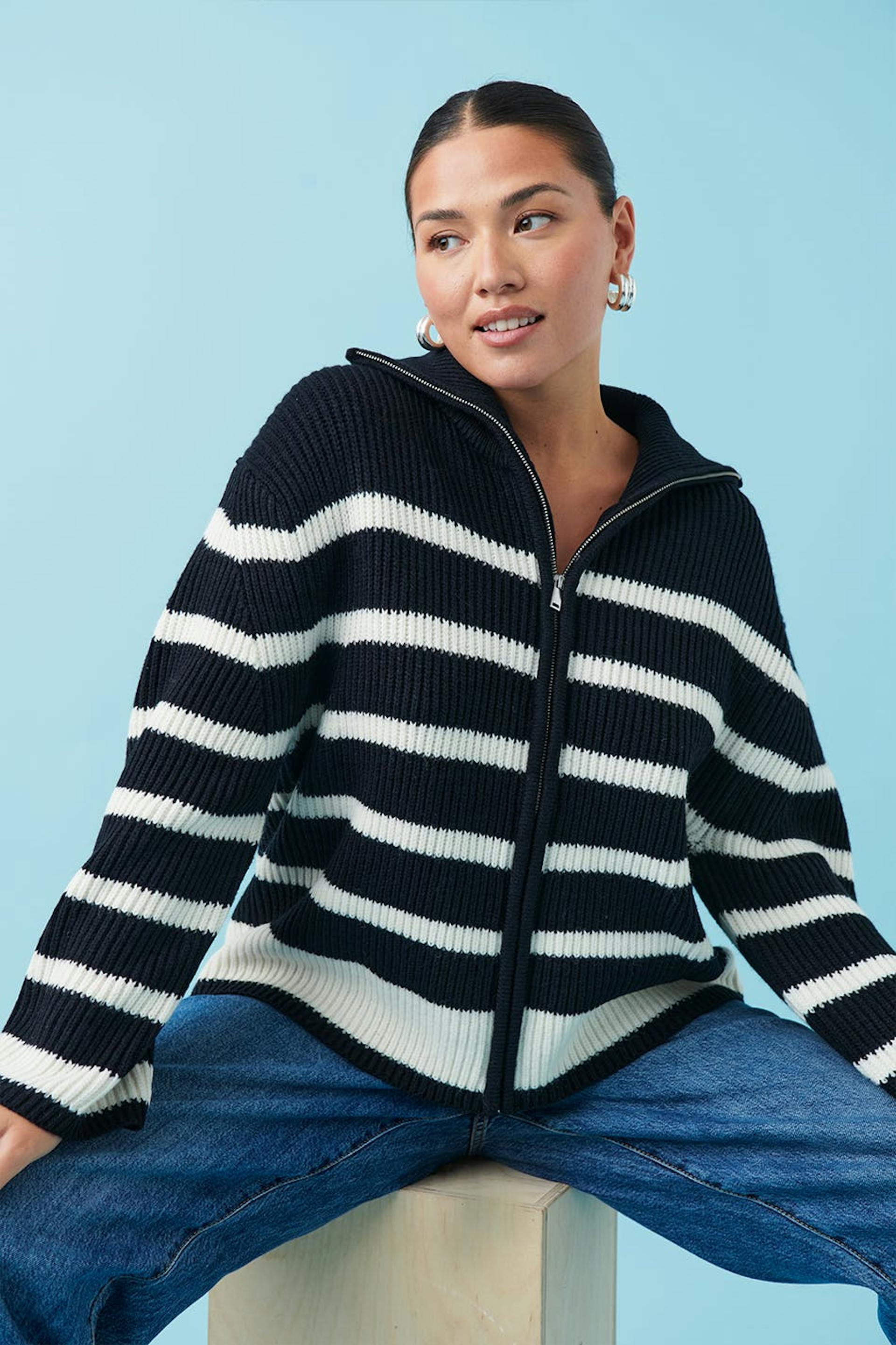 Gestreifter Cardigan mit Hoher Kragen. Der Cardigan ist blau, weiβ und gestrickt. Er hat Reißverschluss vorne und boxy Passform.