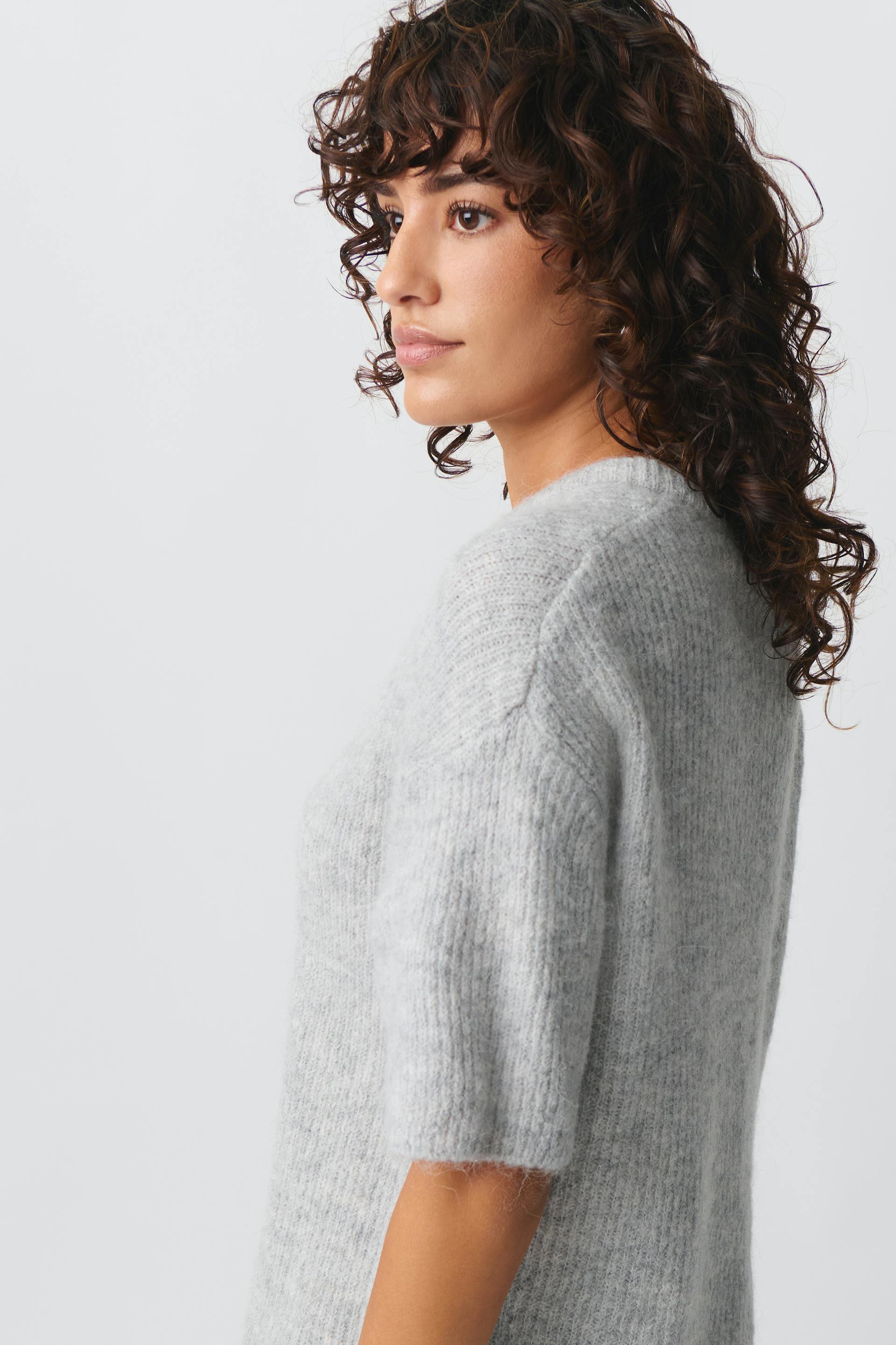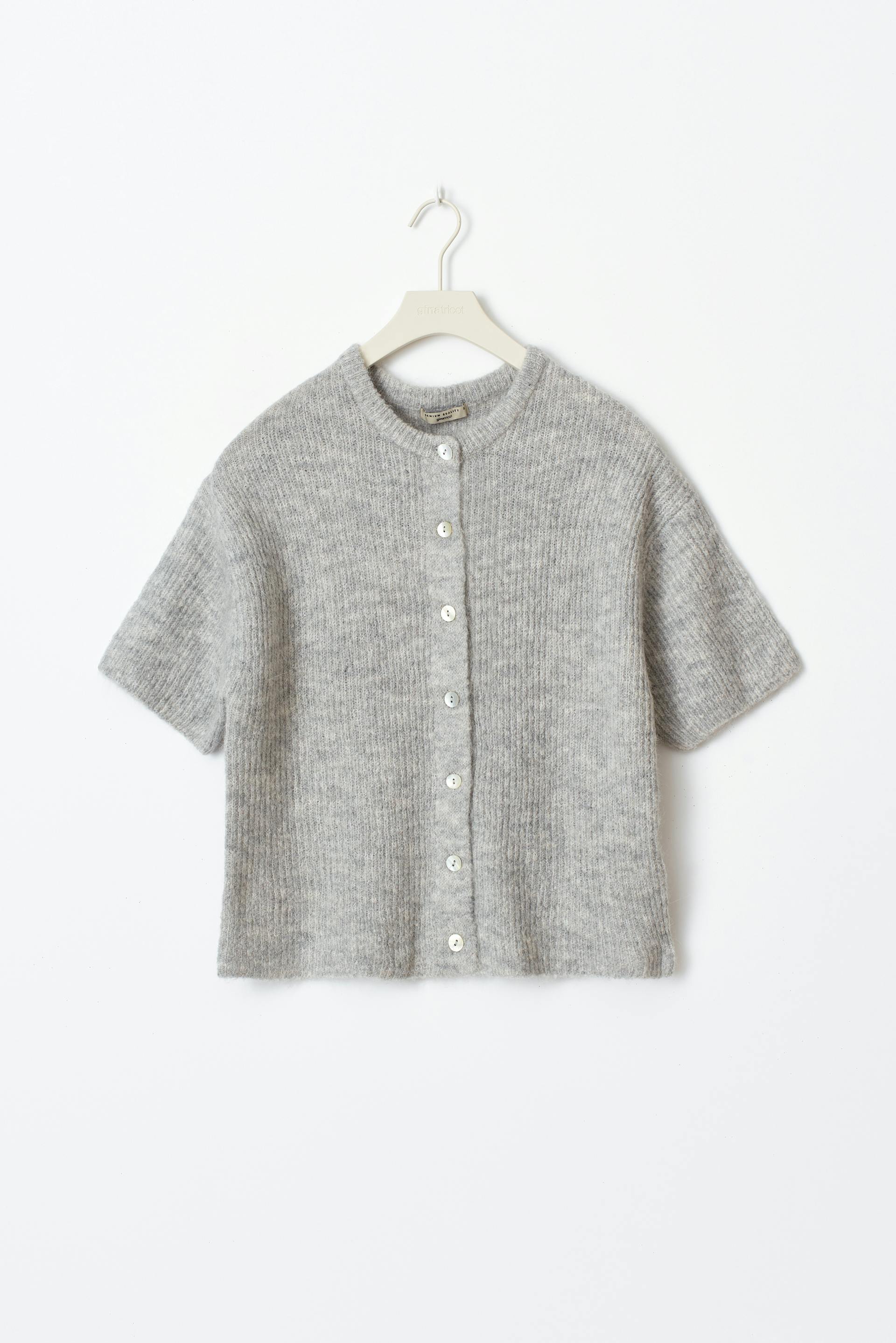 Strickjacke mit kurzem Ärmel. Der Cardigan ist grau und hat Knöpfe vorne. Er hat Rundhalsausschnitt und Oversize-Passform.