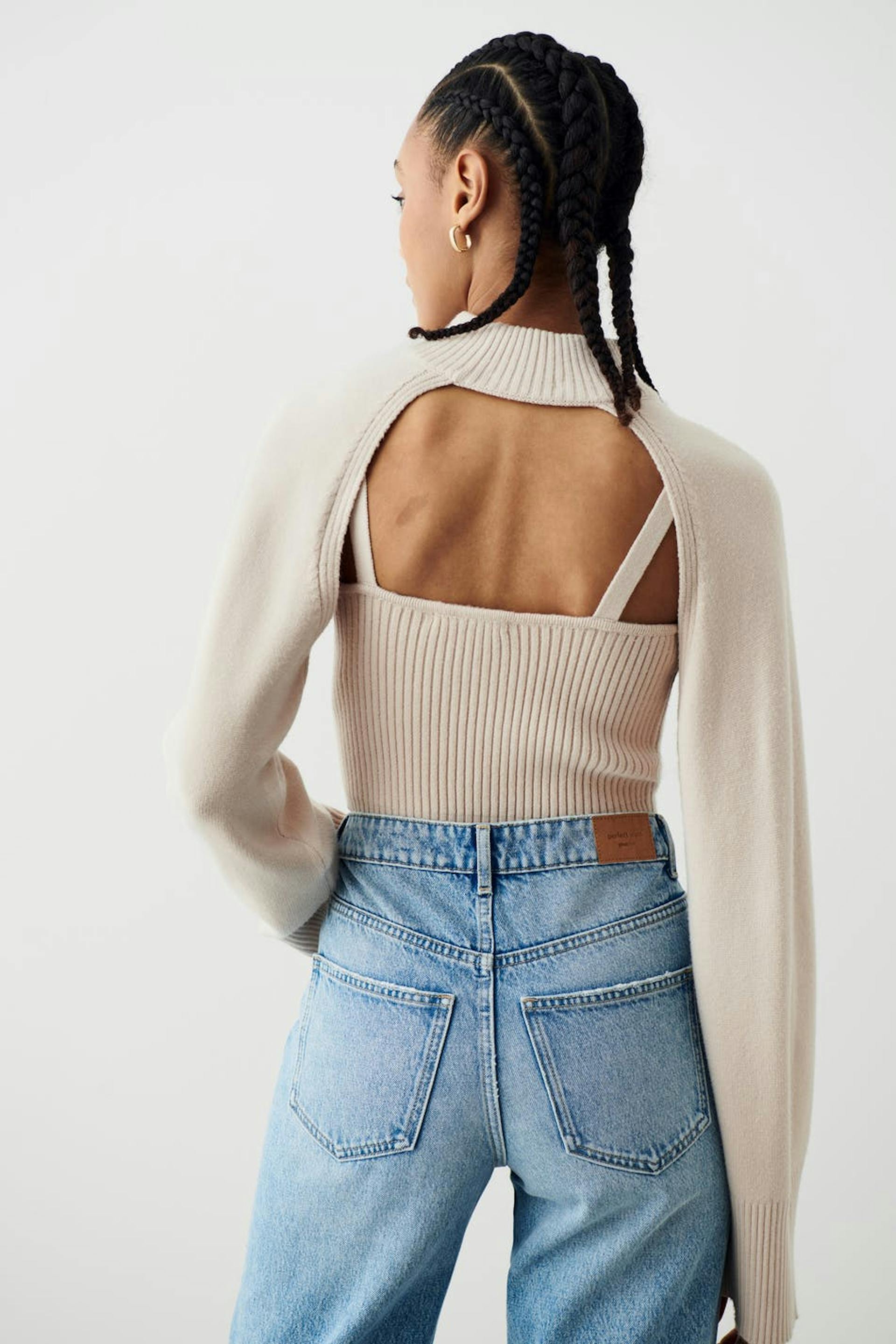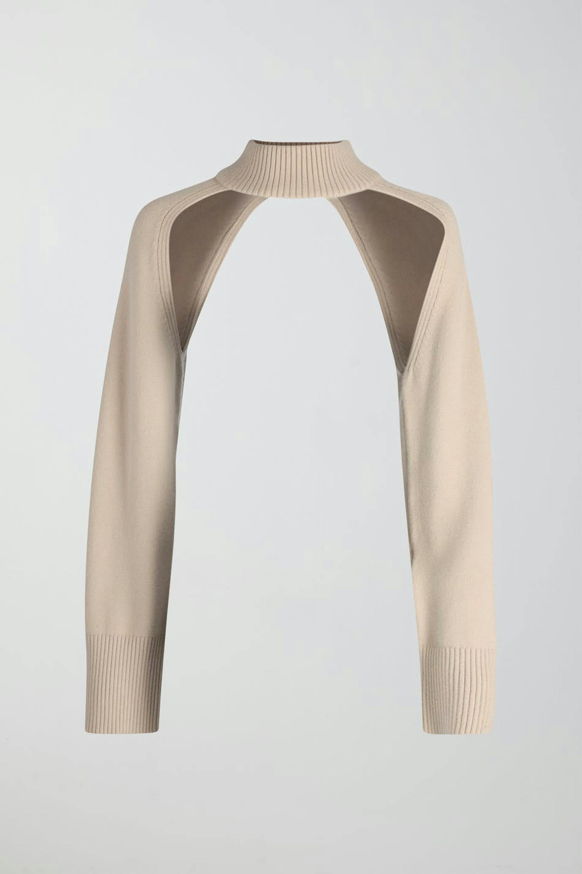 Weich gestricktes Bolero mit Rollkragen. Das Bolero ist beige und hat gerade Ärmel.