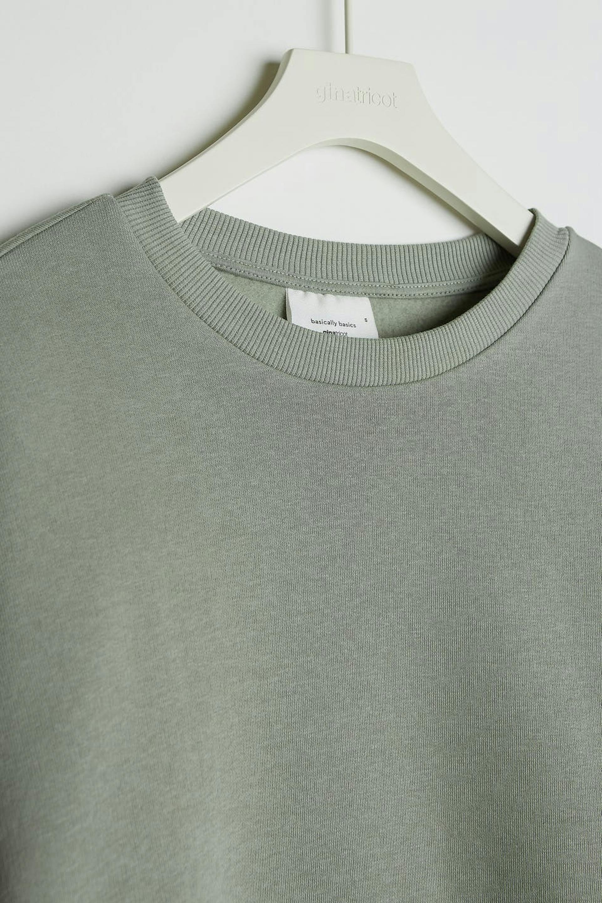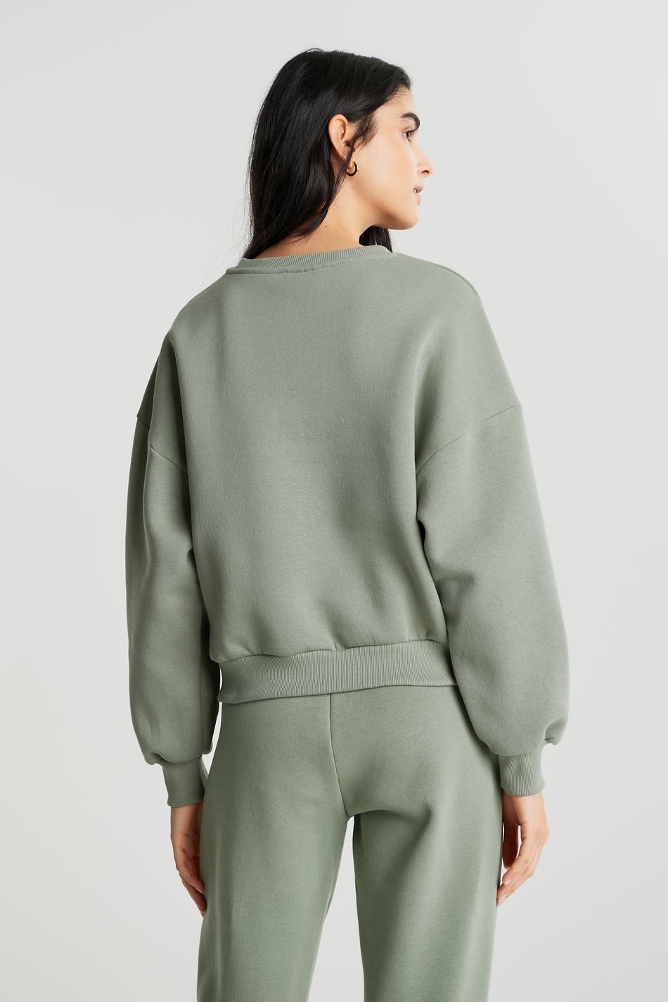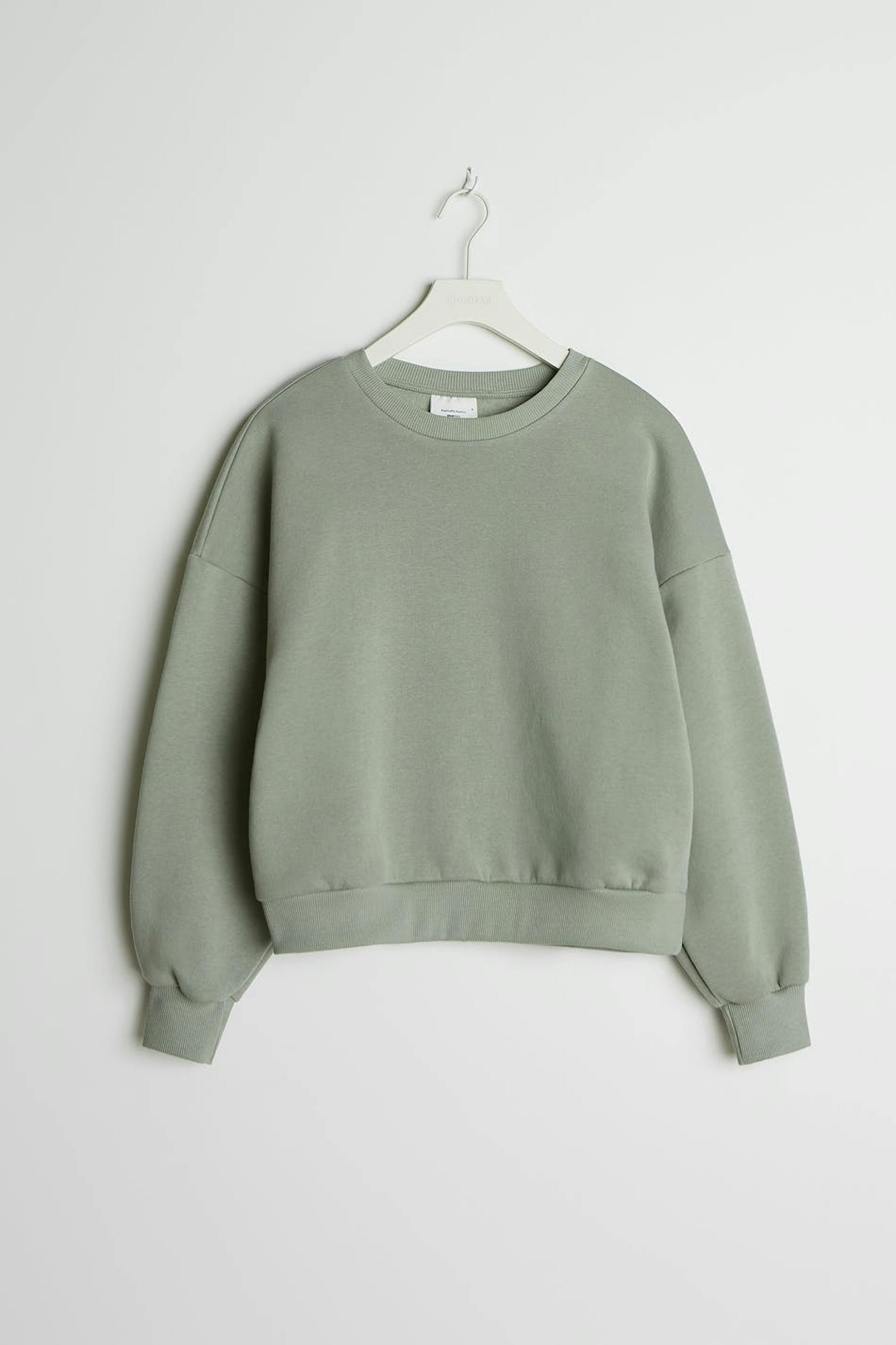 Weiches Sweatshirt mit einer Oversize-Passform. Das Sweatshirt ist staubiges Grün und langärmlig. Es ist hergestellt aus Trikot.