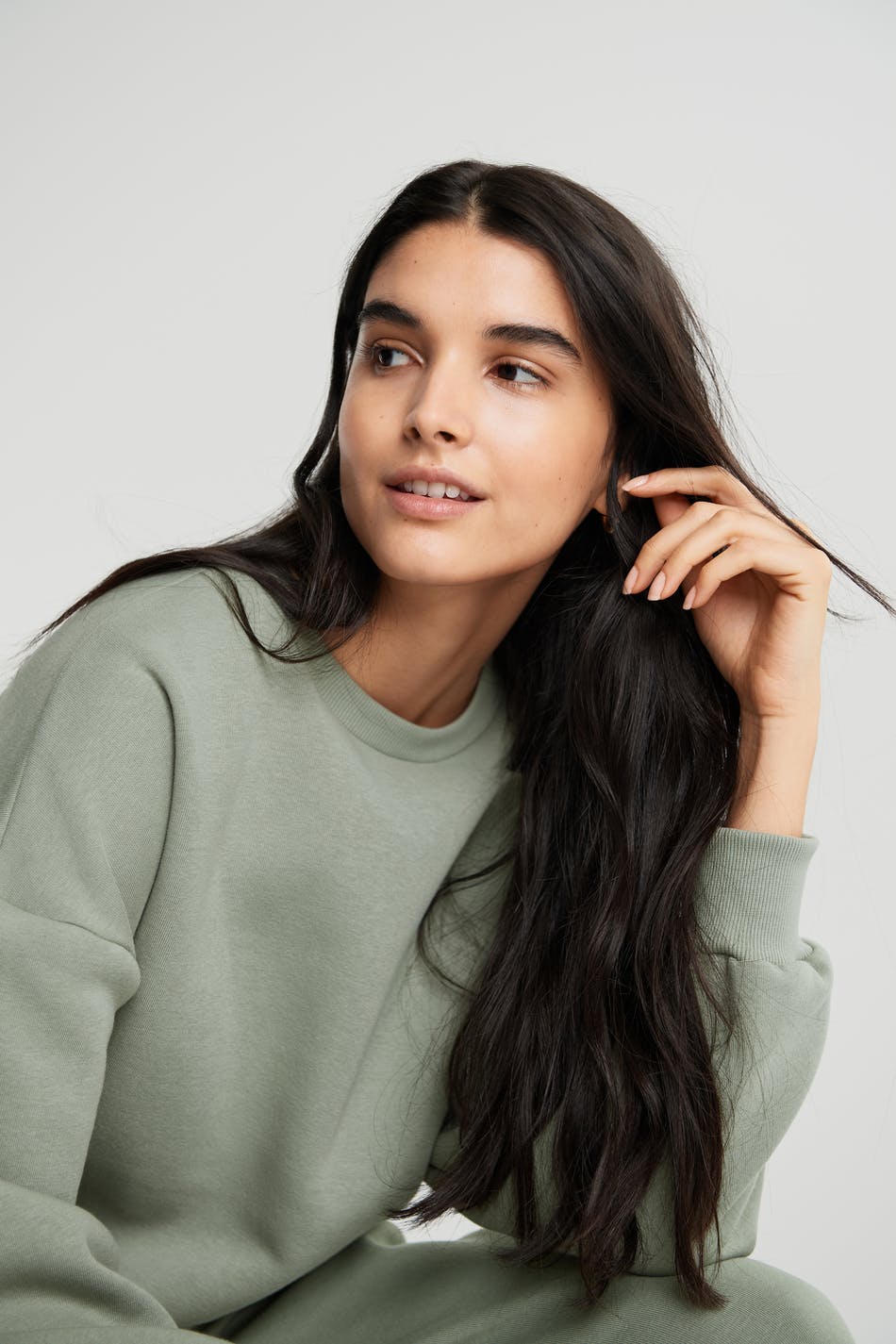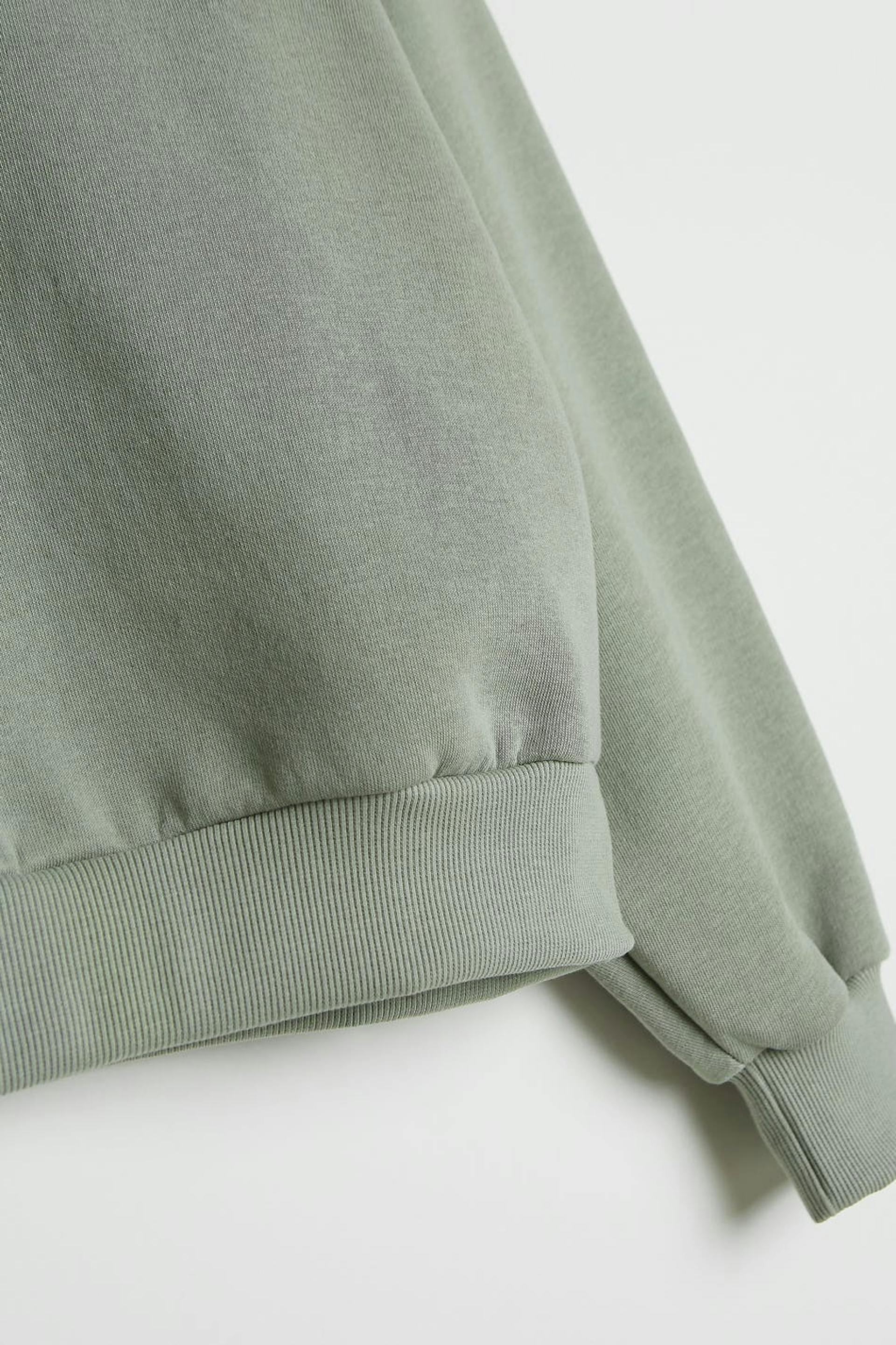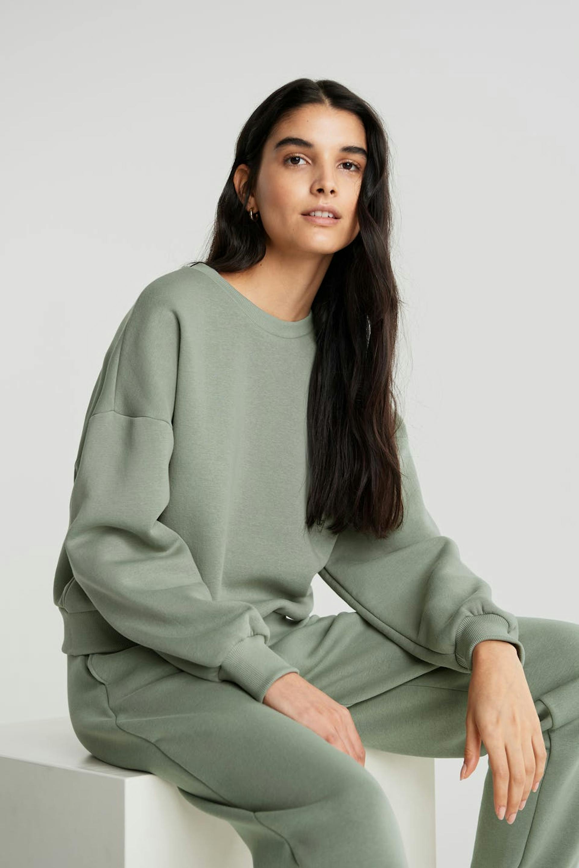 Weiches Sweatshirt mit einer Oversize-Passform. Das Sweatshirt ist staubiges Grün und langärmlig. Es ist hergestellt aus Trikot.