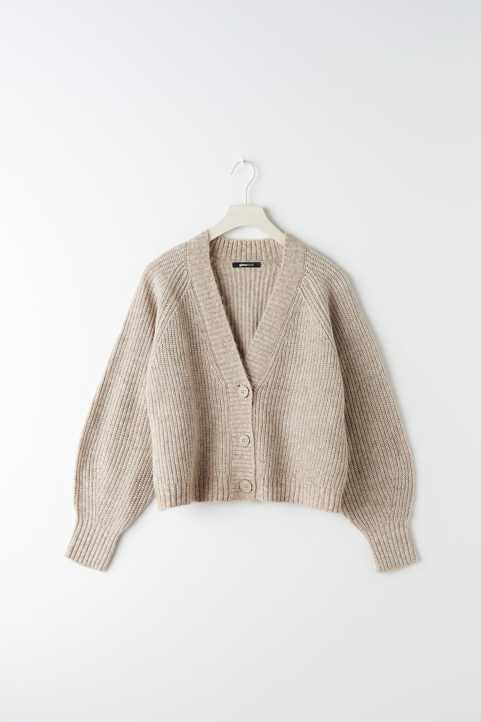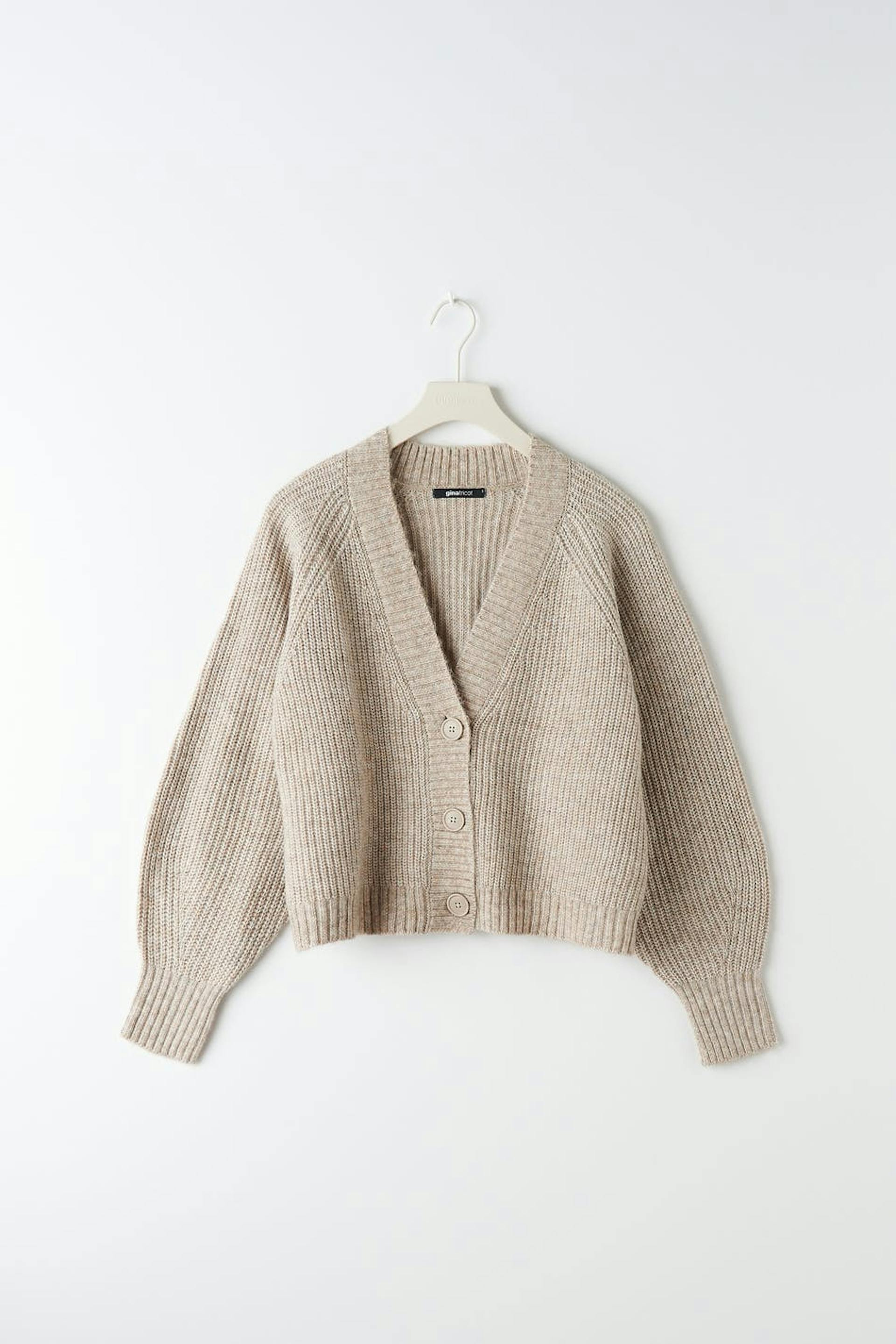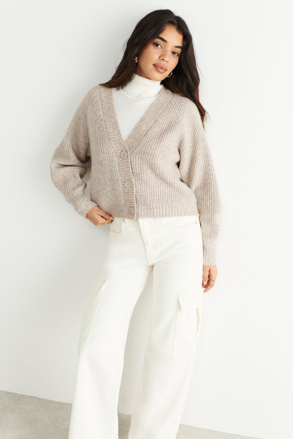 Gestrickter Cardigan mit boxy Passform. Der Cardigan ist beige und hat Knopfleiste vorne. Er hat V-Ausschnitt, abgeschnittene Länge und gerippten Saumabschluss.