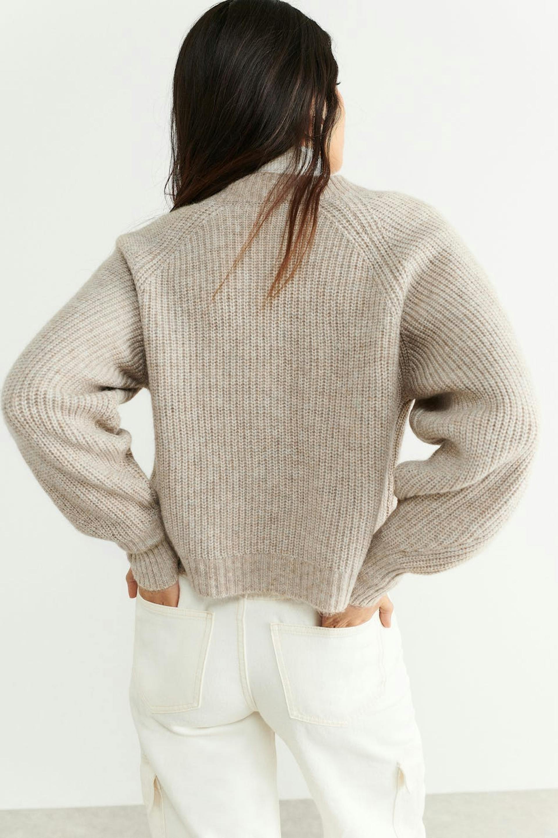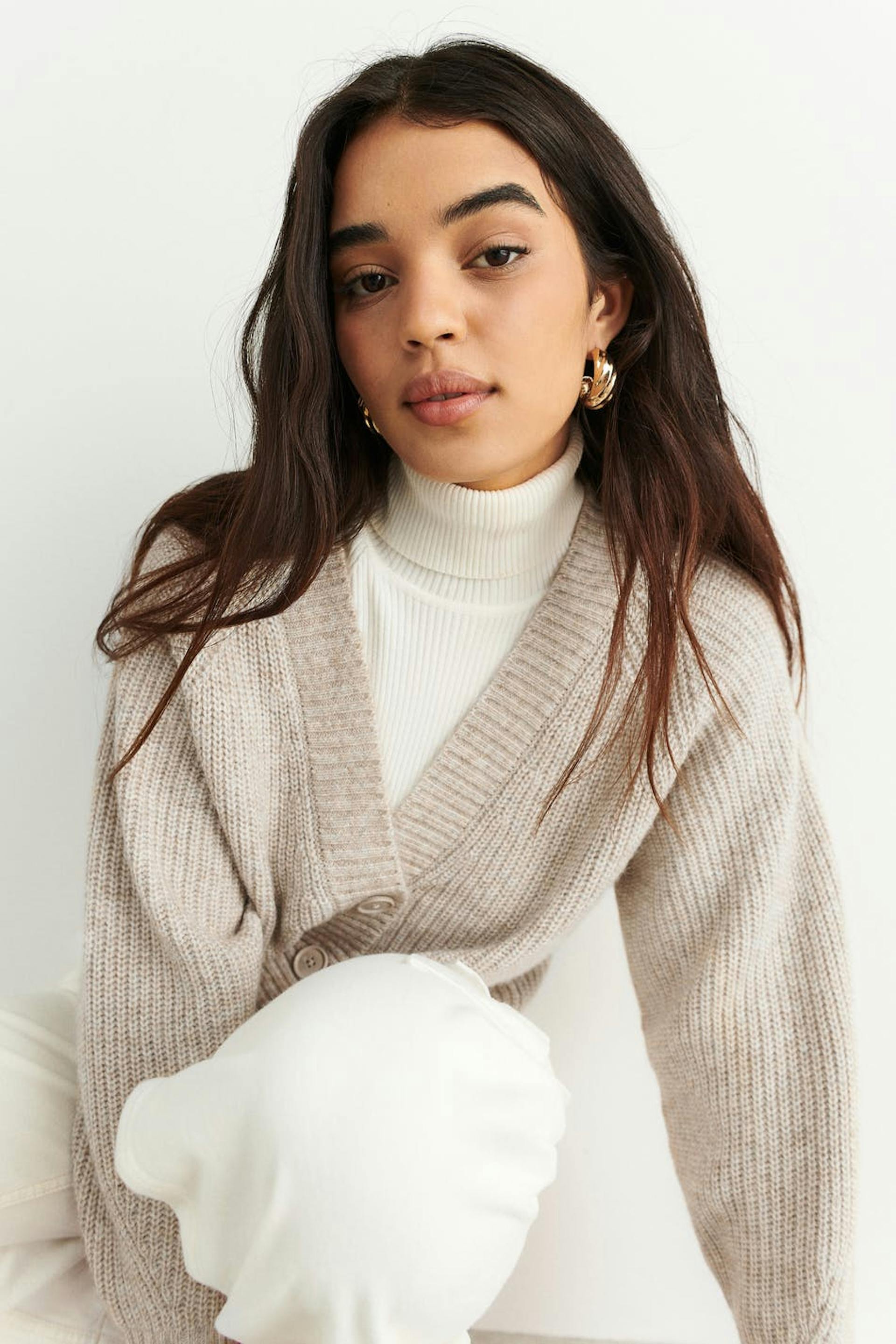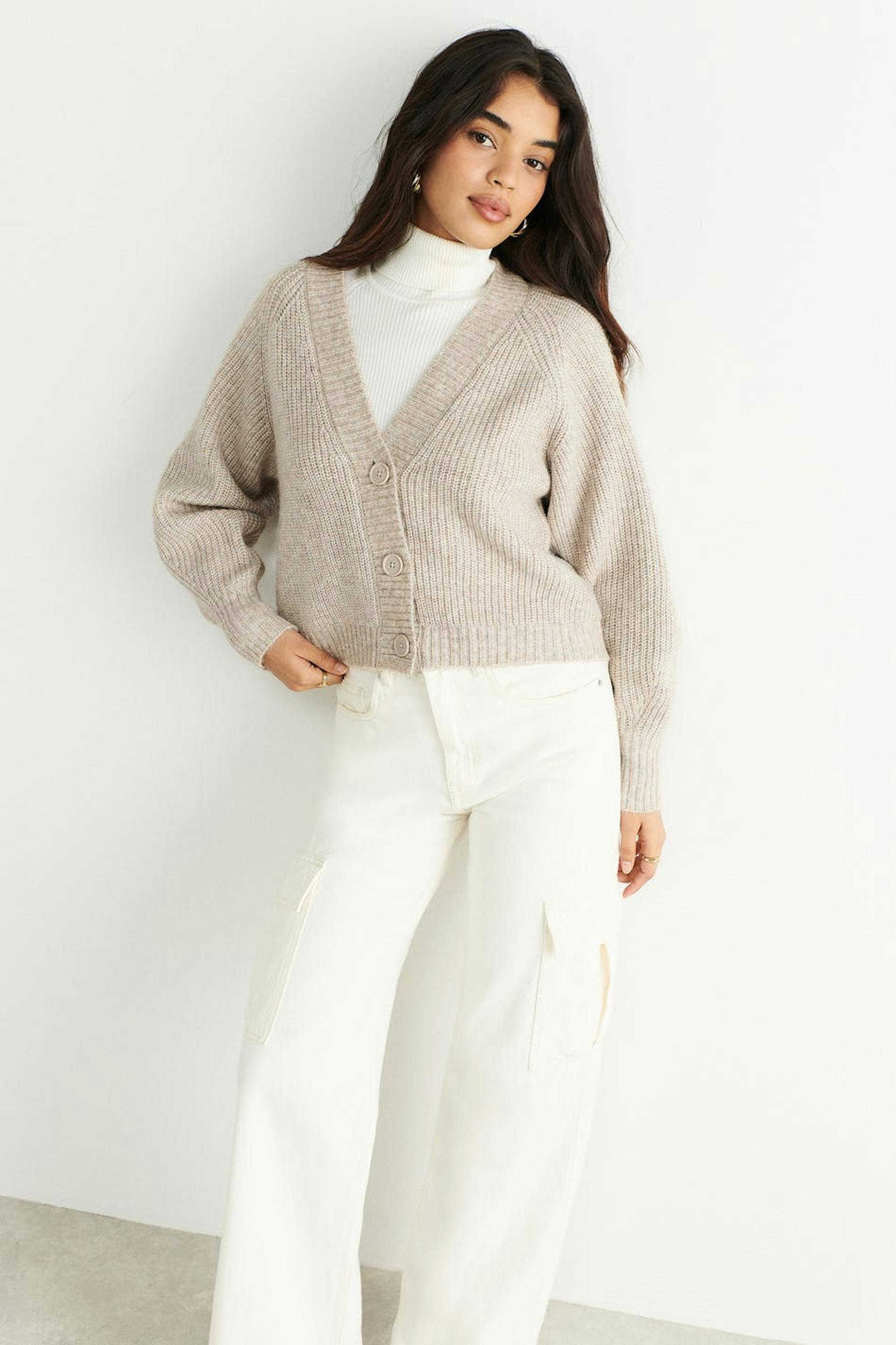 Gestrickter Cardigan mit boxy Passform. Der Cardigan ist beige und hat Knopfleiste vorne. Er hat V-Ausschnitt, abgeschnittene Länge und gerippten Saumabschluss.
