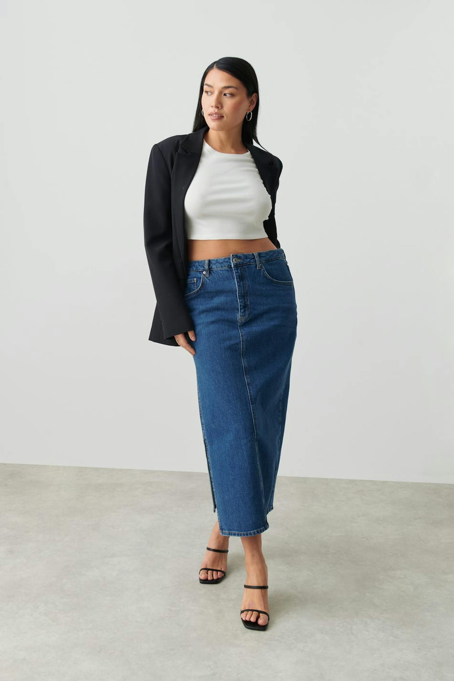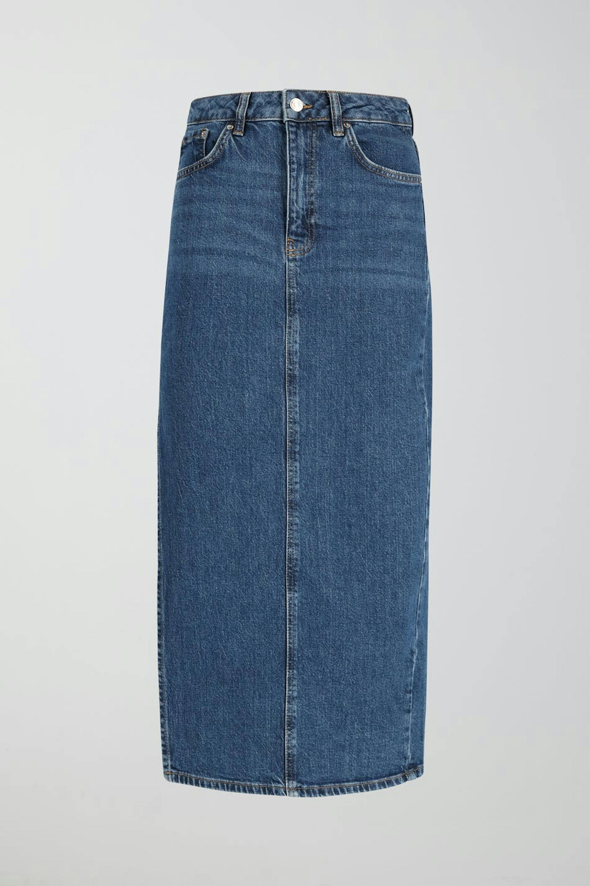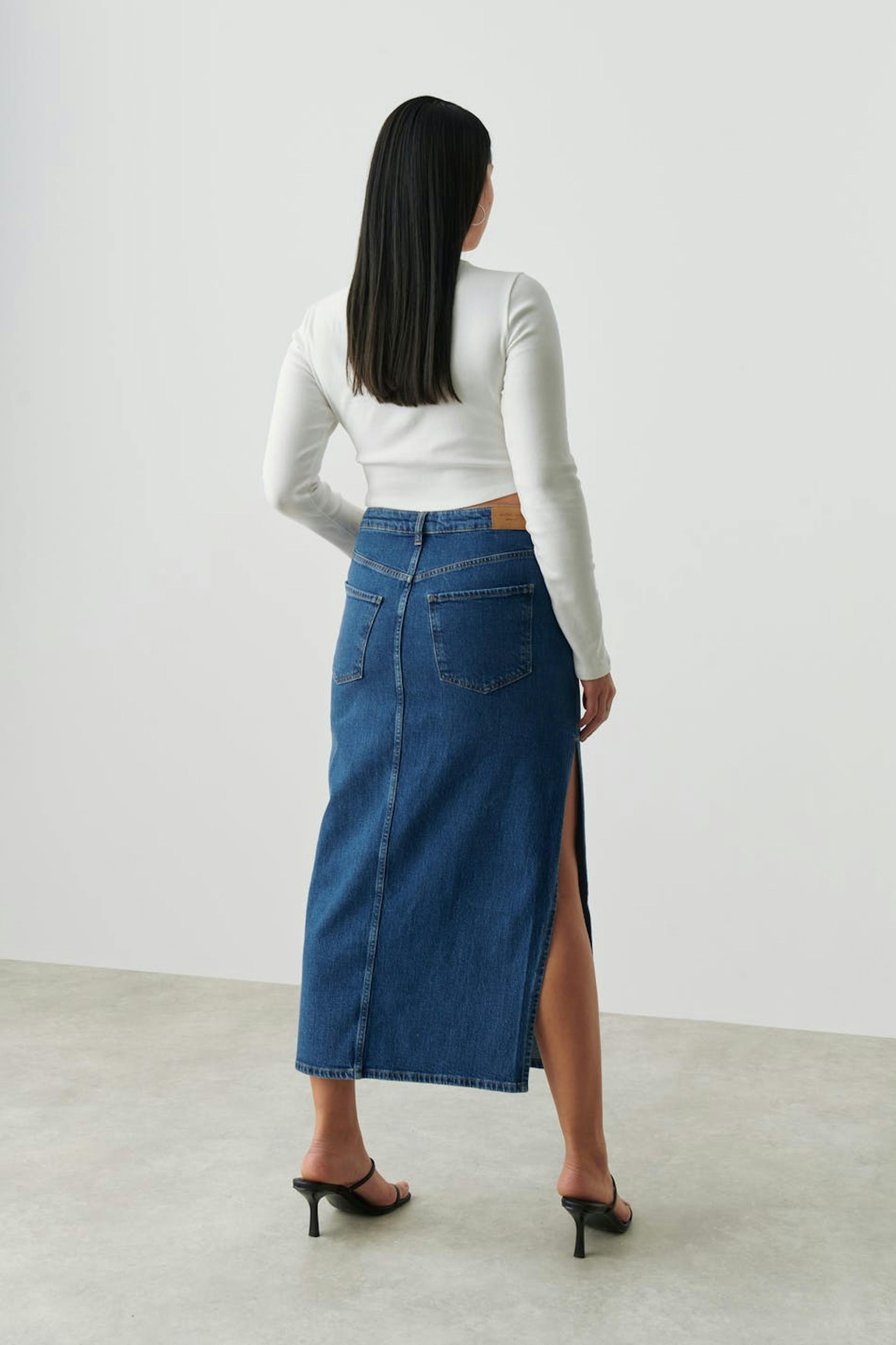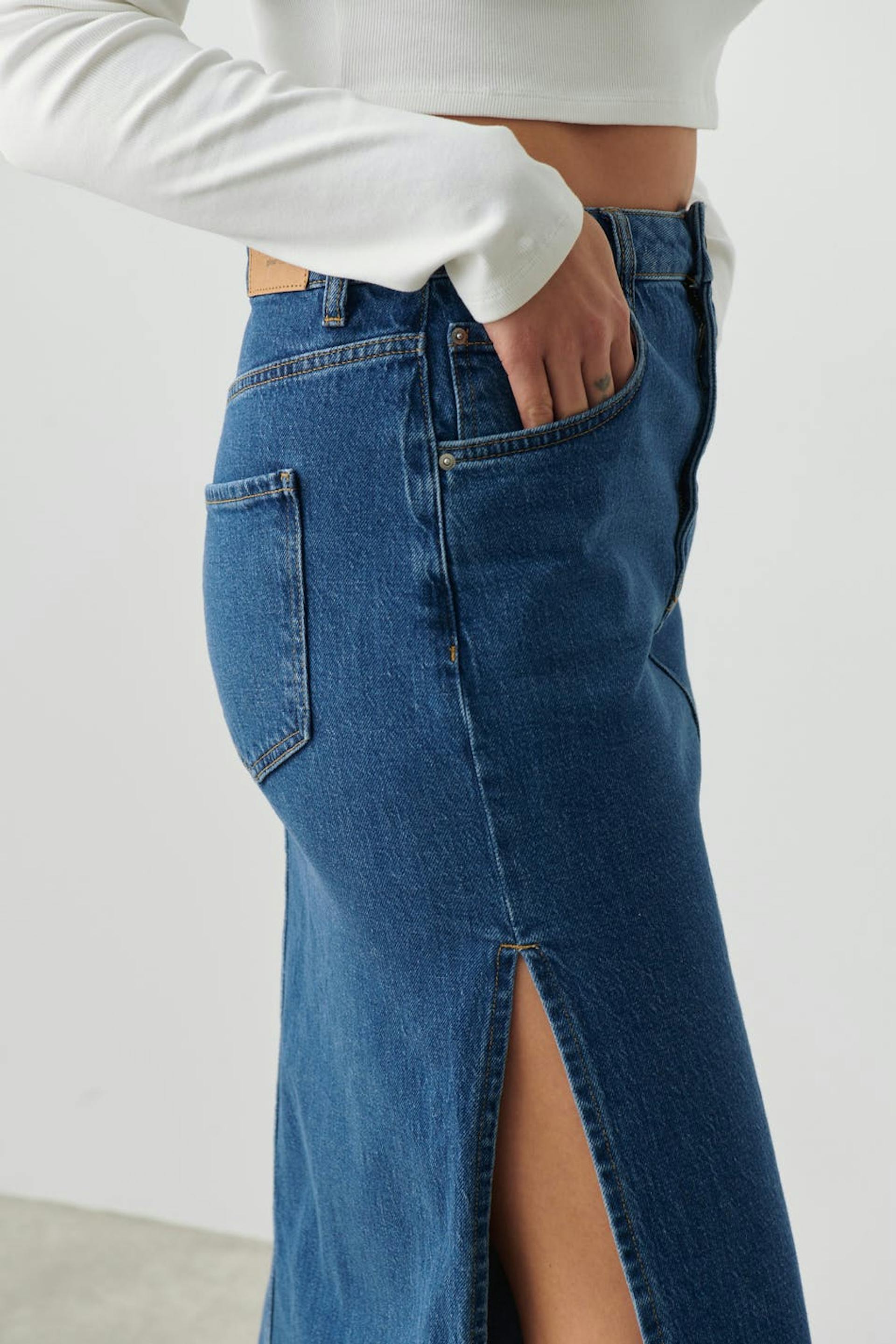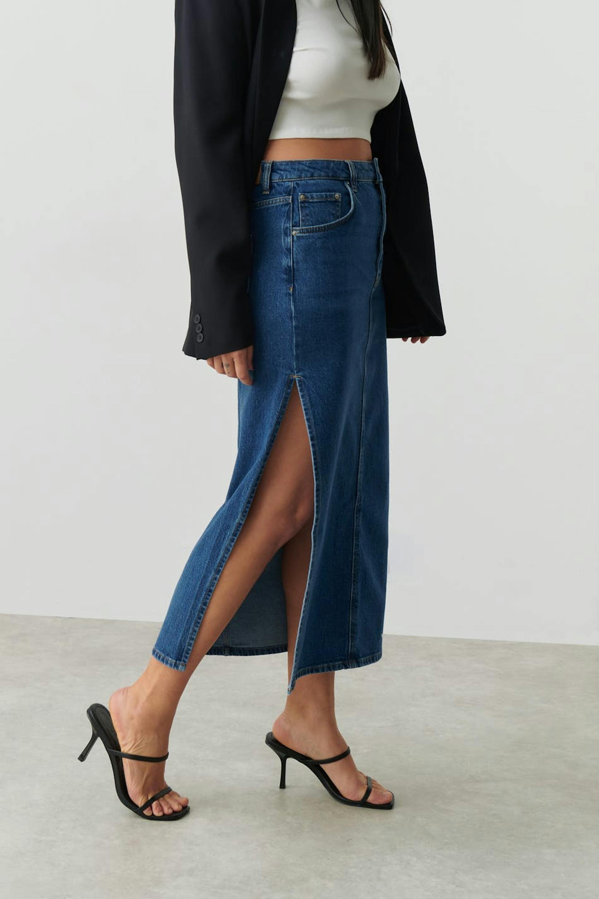 Langer Jeansrock mit hohem Schlitz an der Seite. Der Rock ist dunkelblau und hat leichten Stretch. Er hat Reißverschluss und Taschen vorne und hinten.