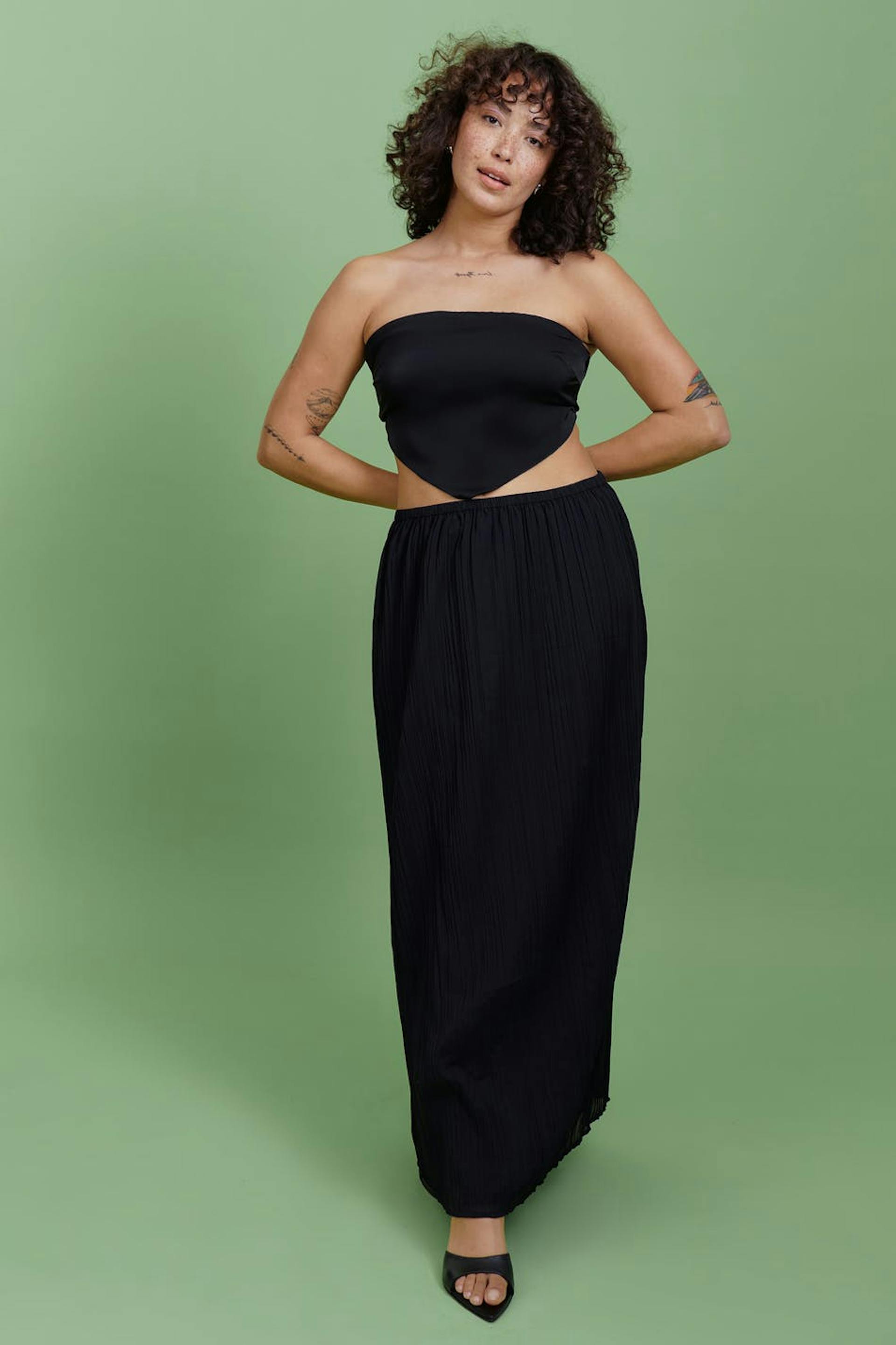 Maxirock mit Gummiband in der Taille. Der Rock ist schwarz und hat ein zerknittertes Material.