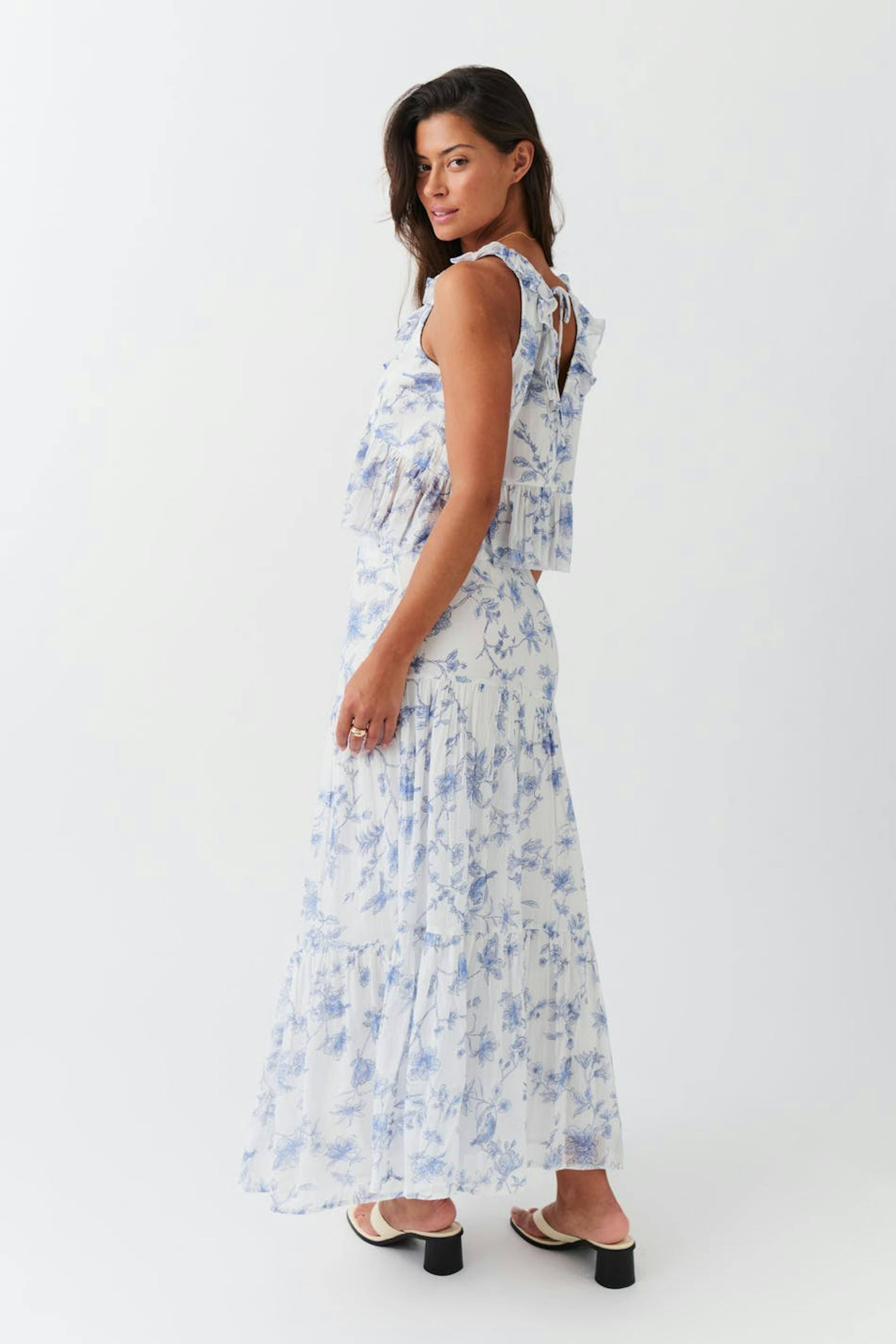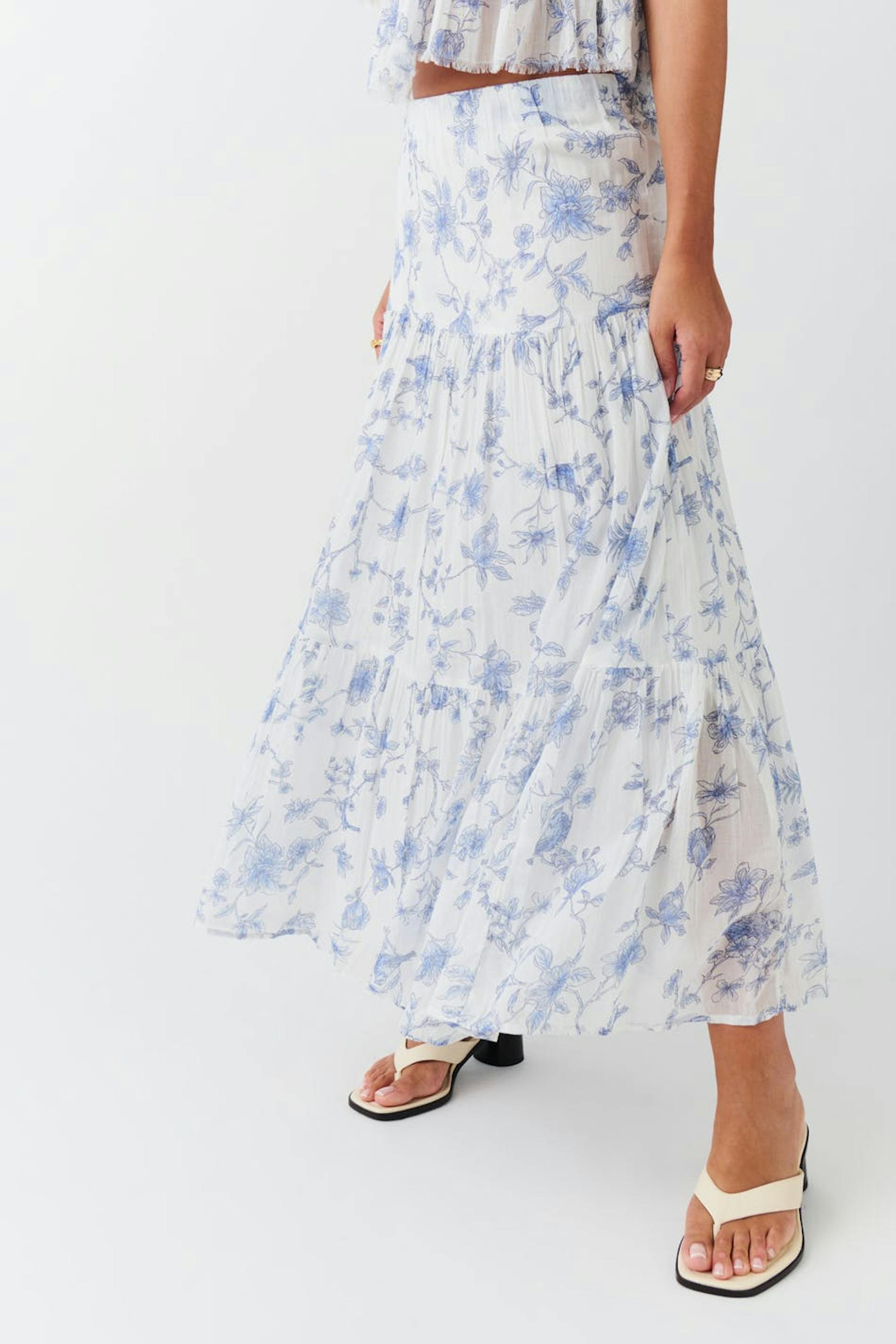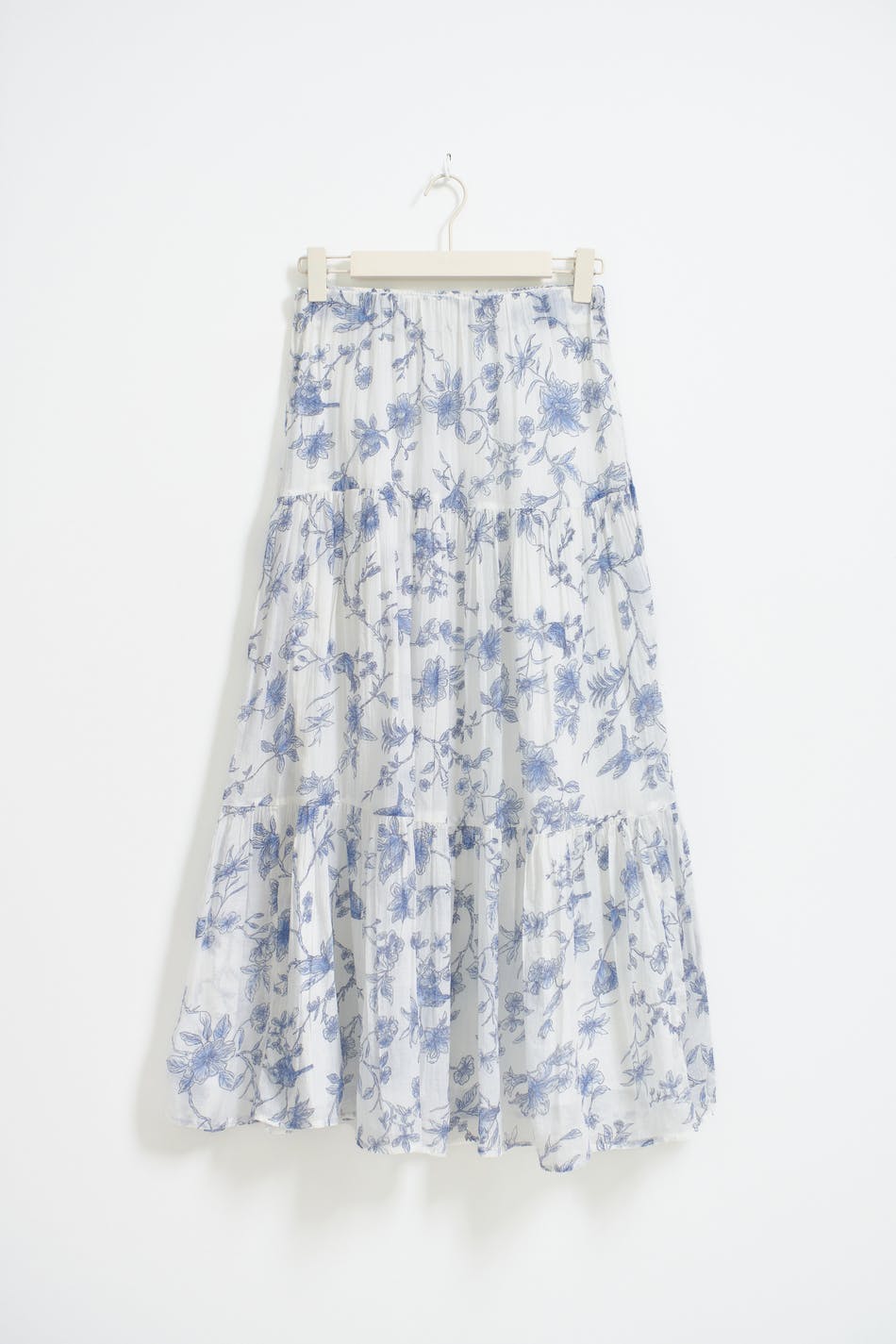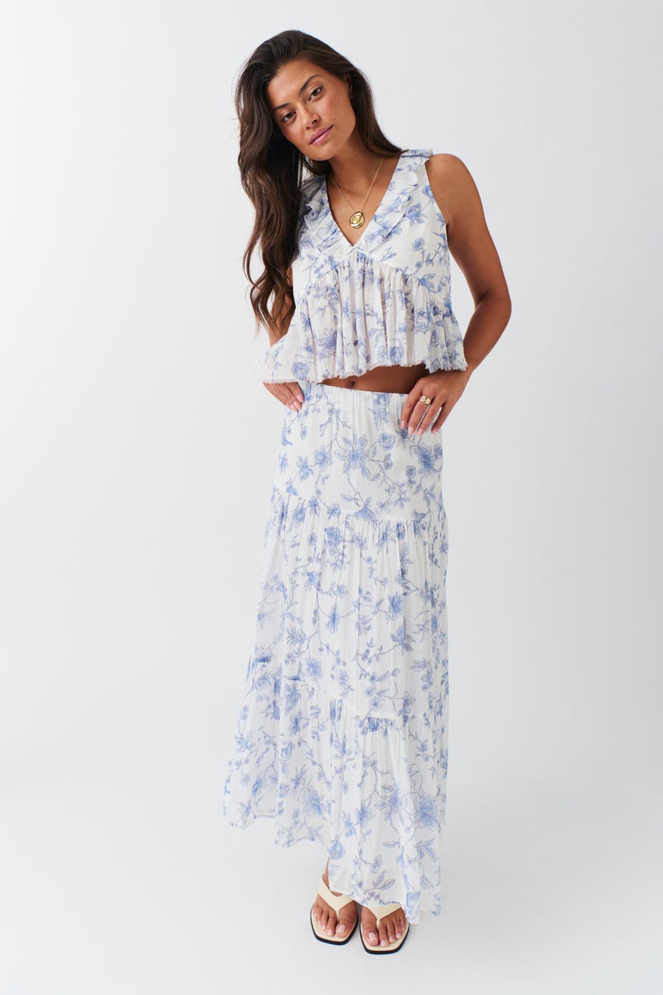 Blumiger Maxirock aus Baumwolle mit Gummiband in der Taille. Der Rock ist blau und hat Volants mit gerüscht Säumen.