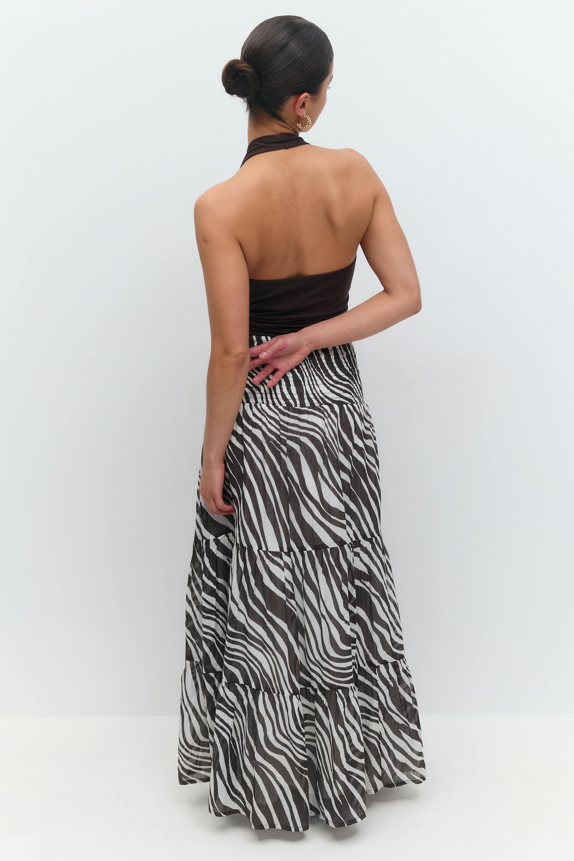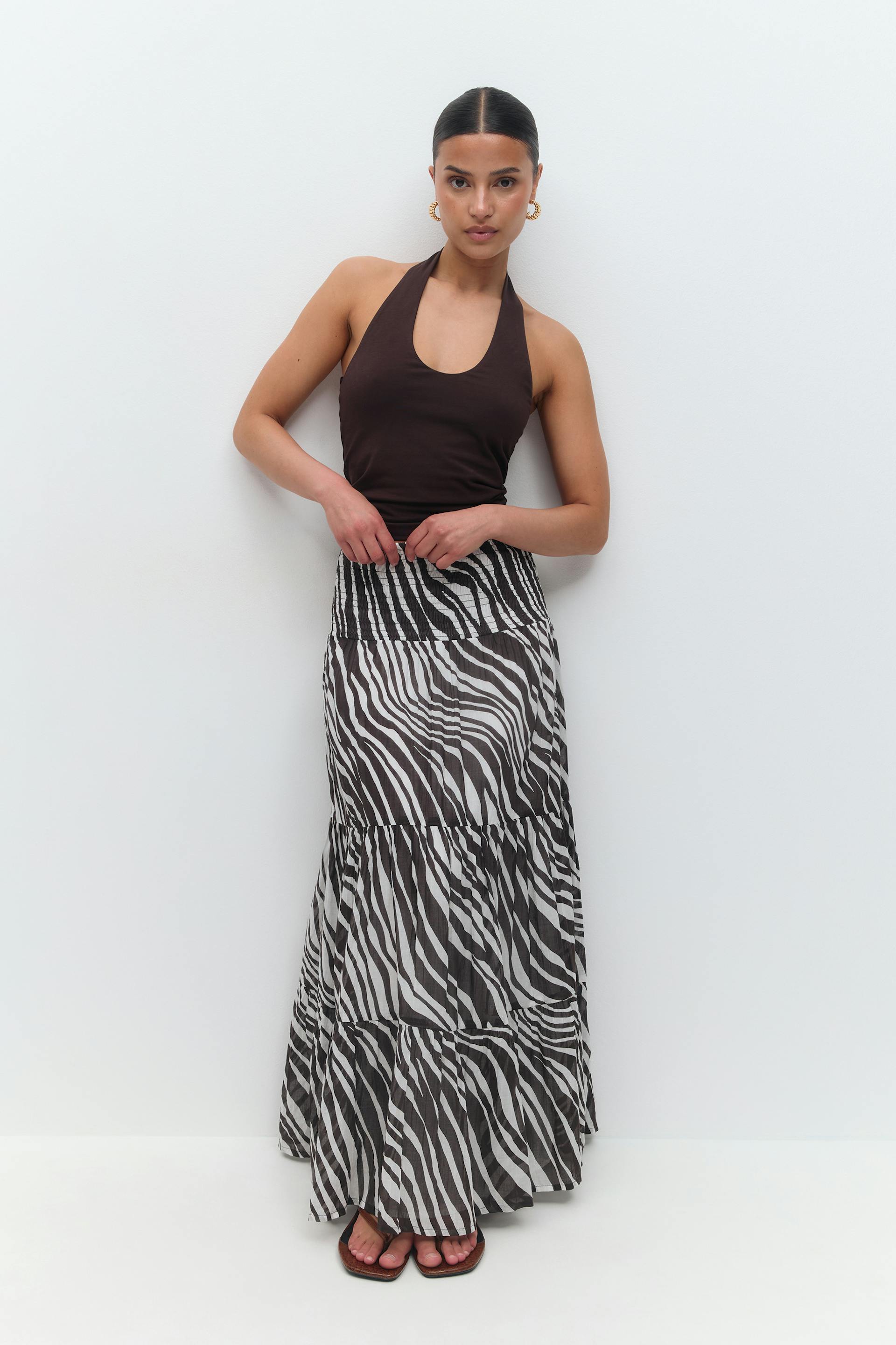 Zebra-gemusterter Maxirock mit Volantbesätzen. Der Rock hat elastischen Smoking in der Taille. Er hat eine normale Passform. Gefüttert.