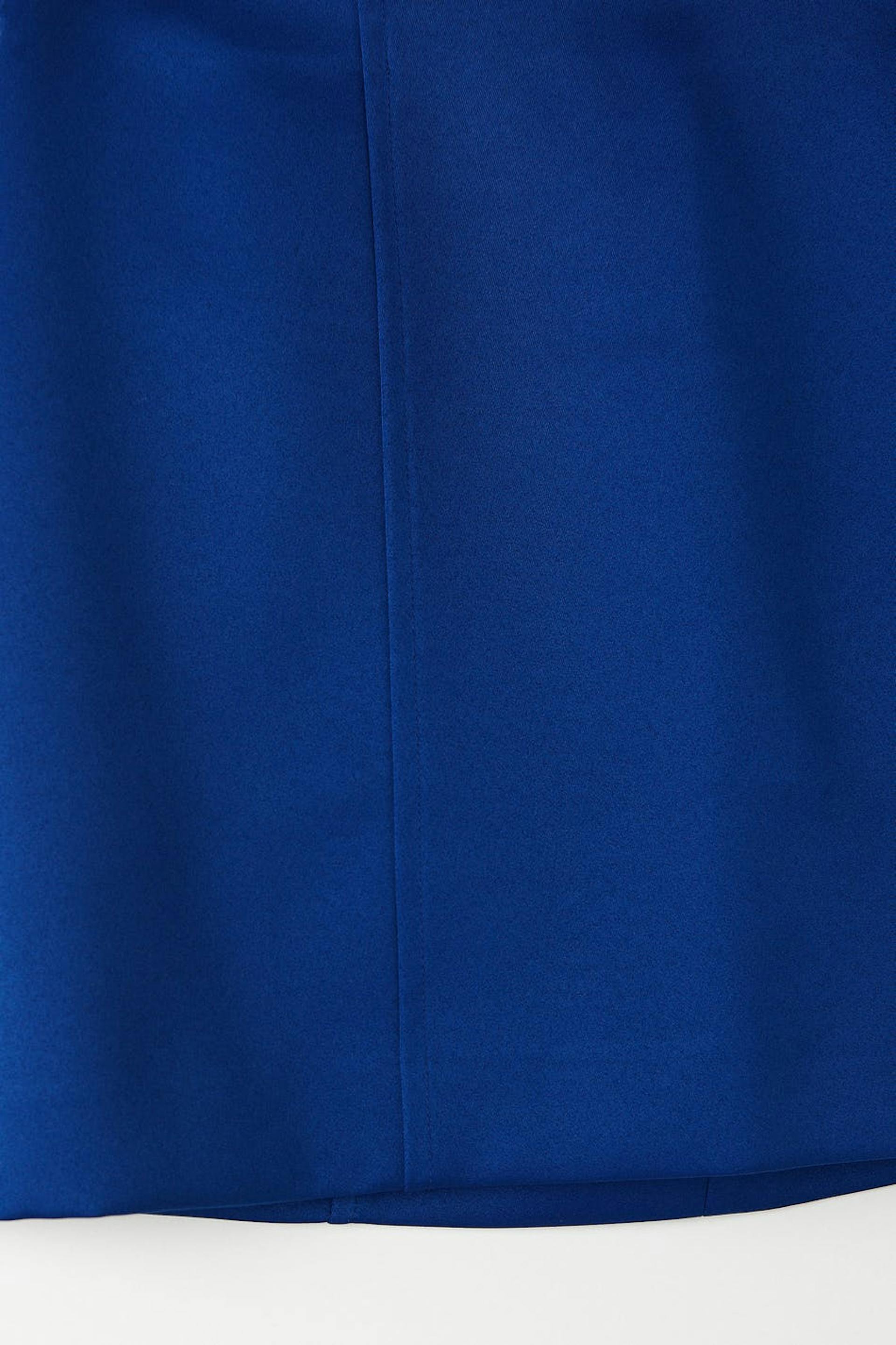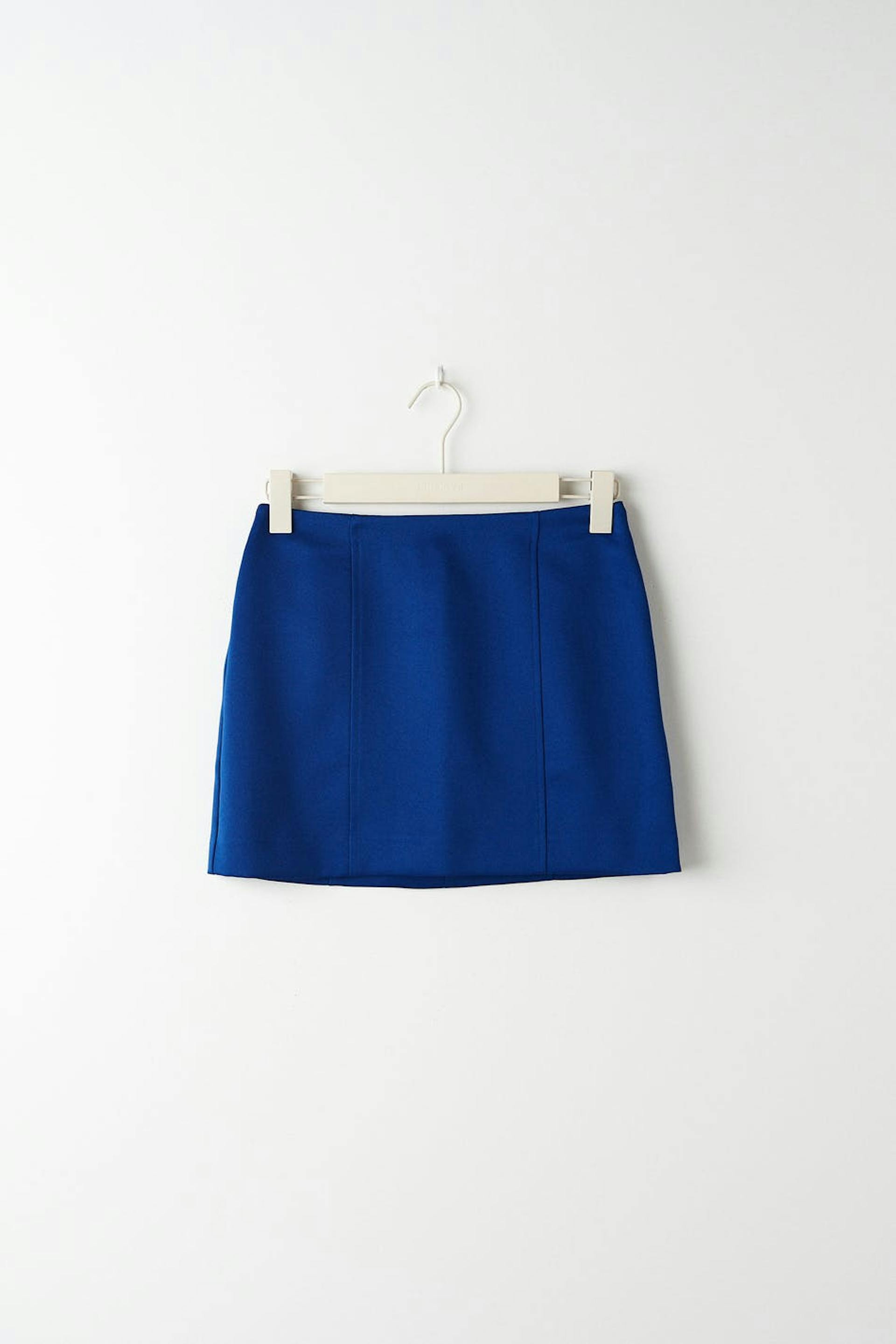 Minirock mit tiefer Taille. Der Rock ist blau und hat eine figurbetonte Passform. Er hat einen versteckten Reißverschluss auf der Rückseite und Naht-Details auf den Seiten.