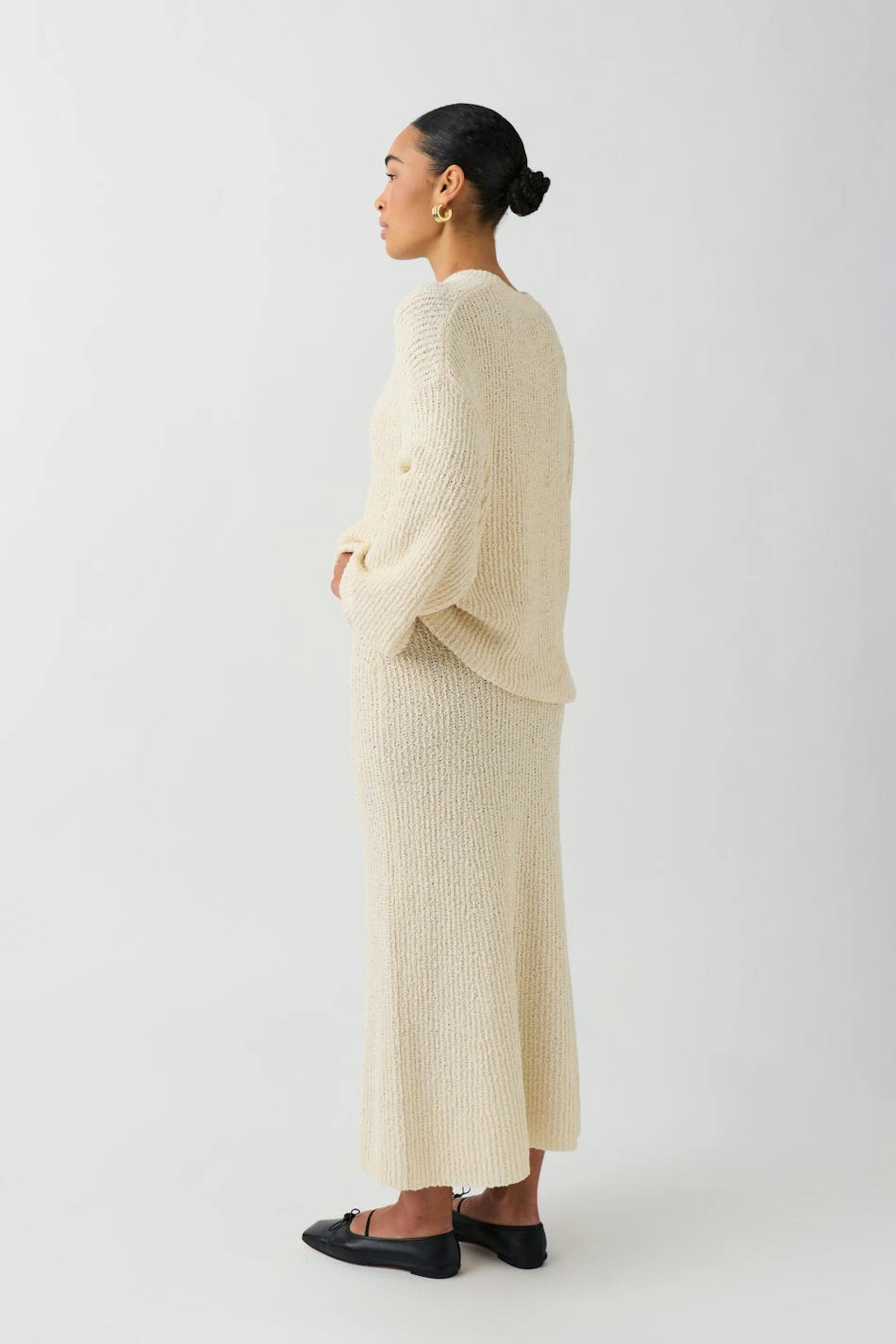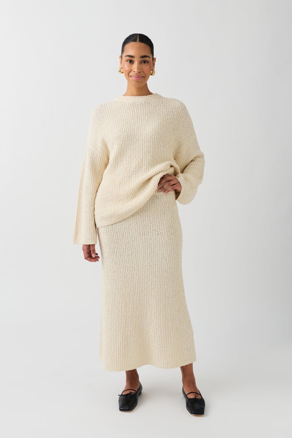 Gestrickter Rock mit Gummiband in der Taille. Der Rock ist weiβ.