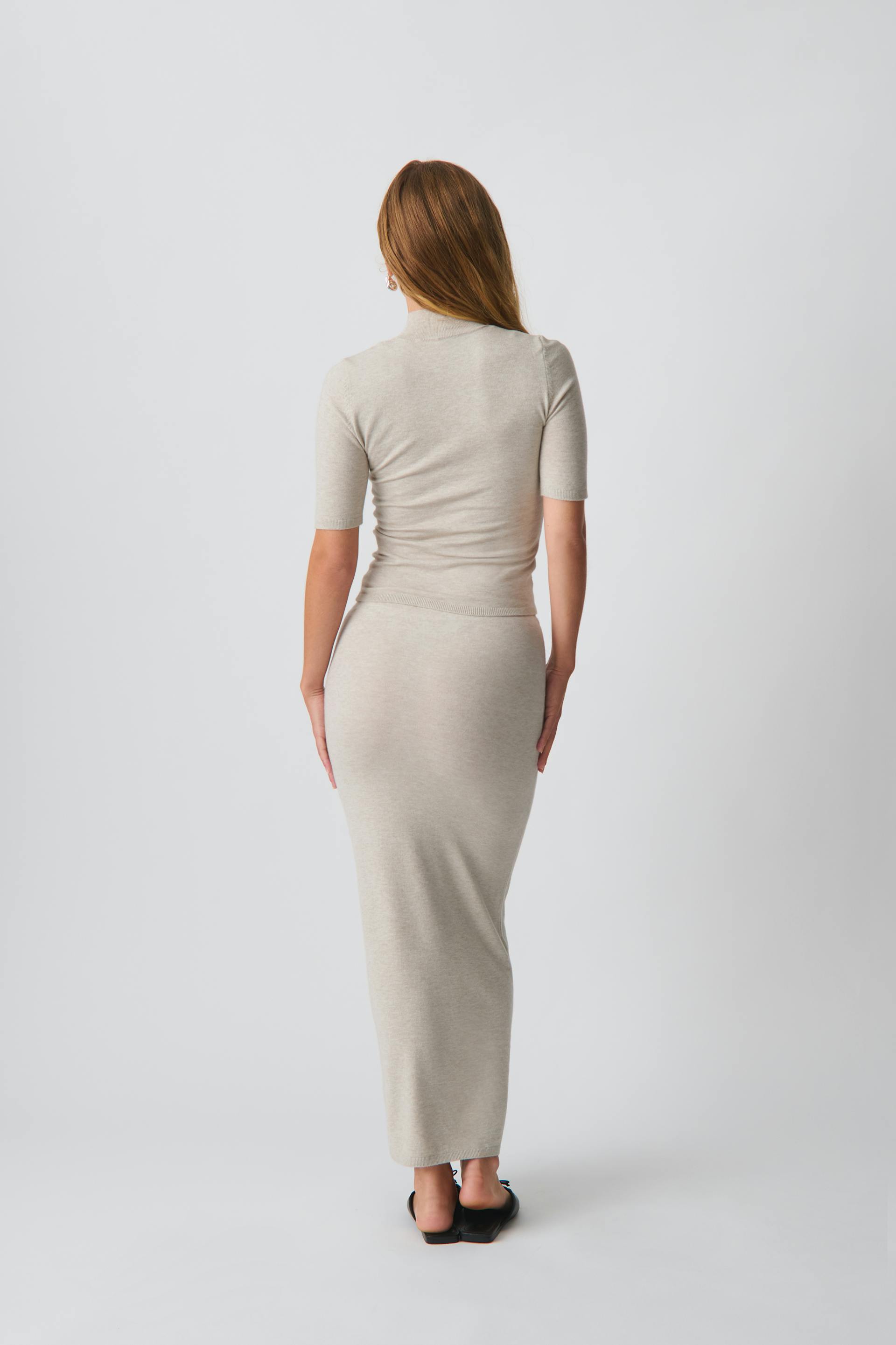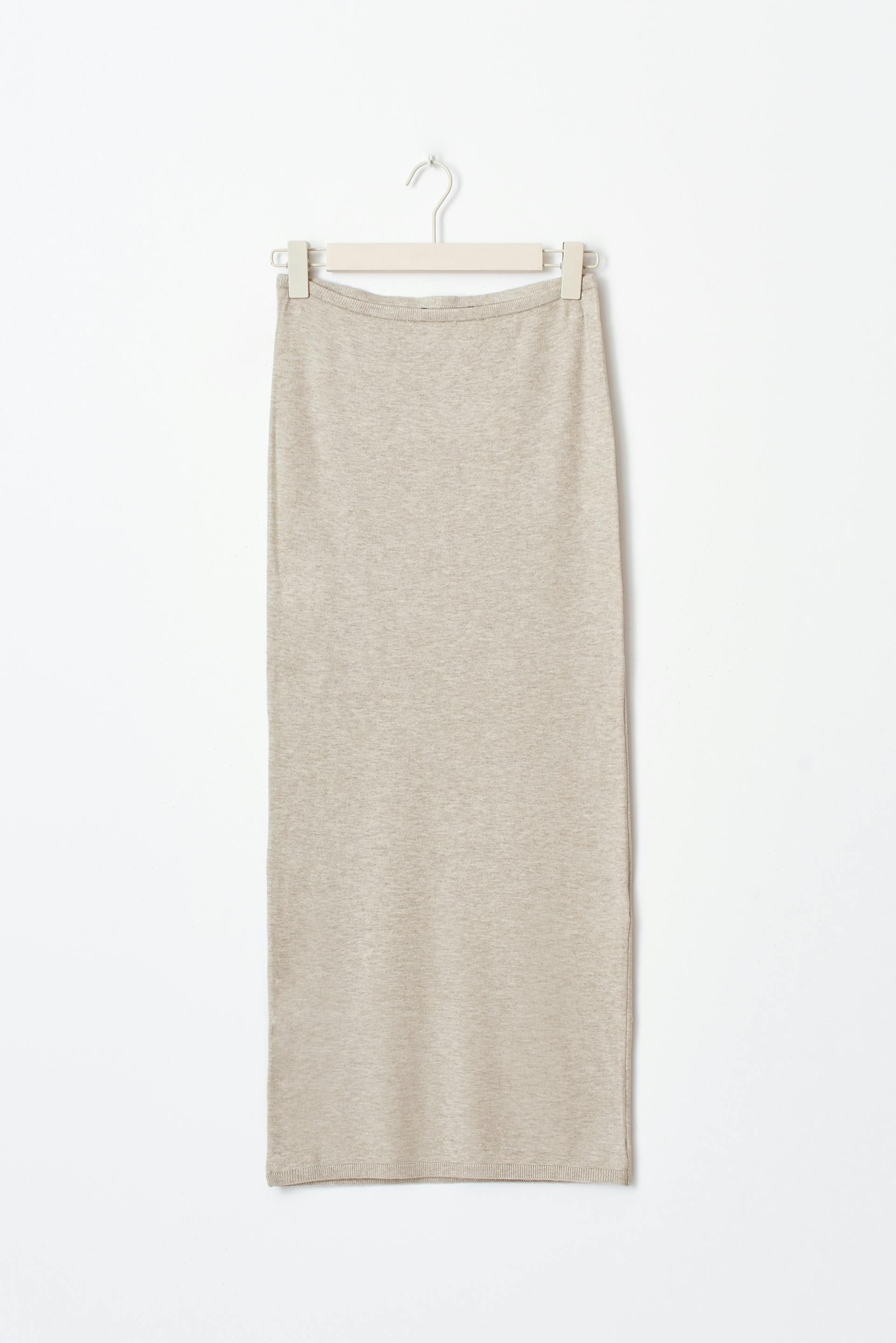 Gestrickter Maxirock mit tiefer Taille. Der Rock ist beige und hat normale Passform. Er hat Gummiband in der Taille.