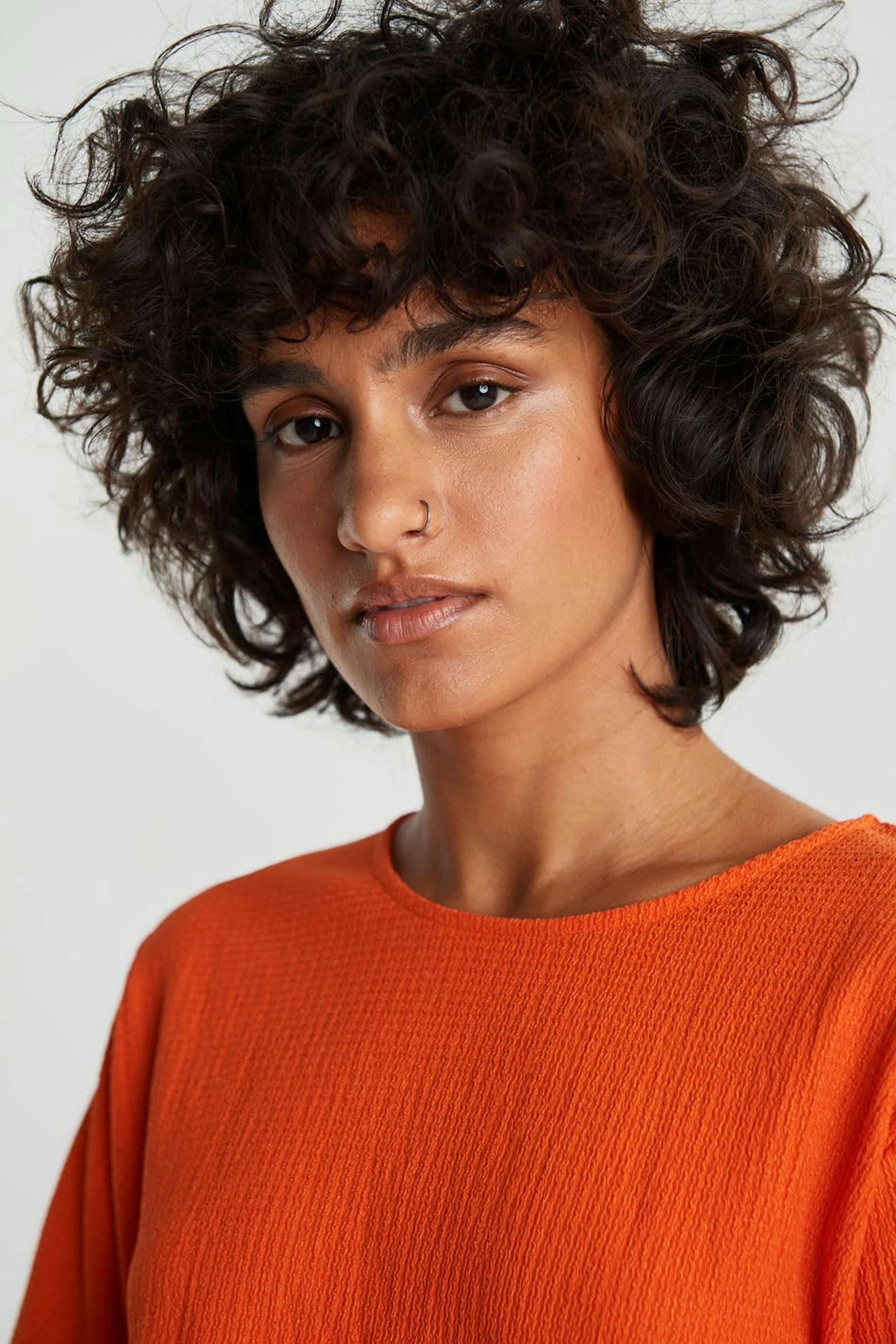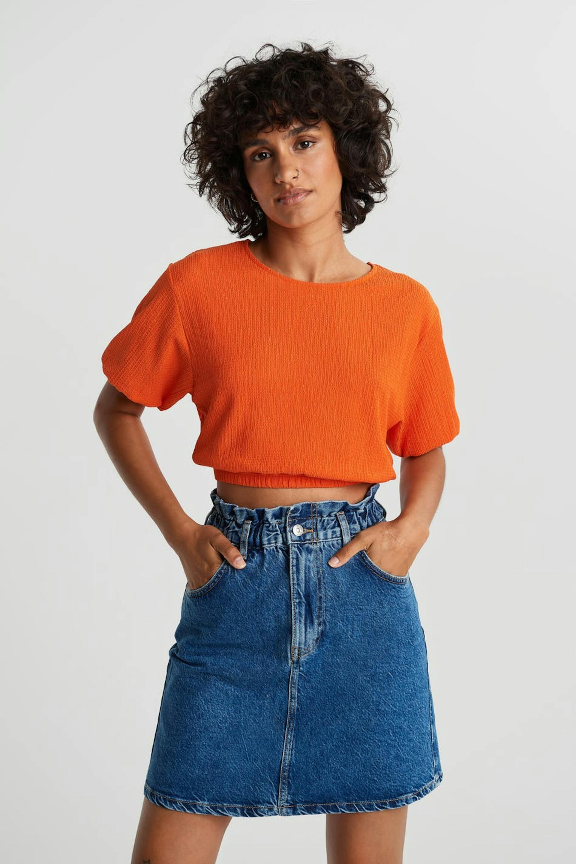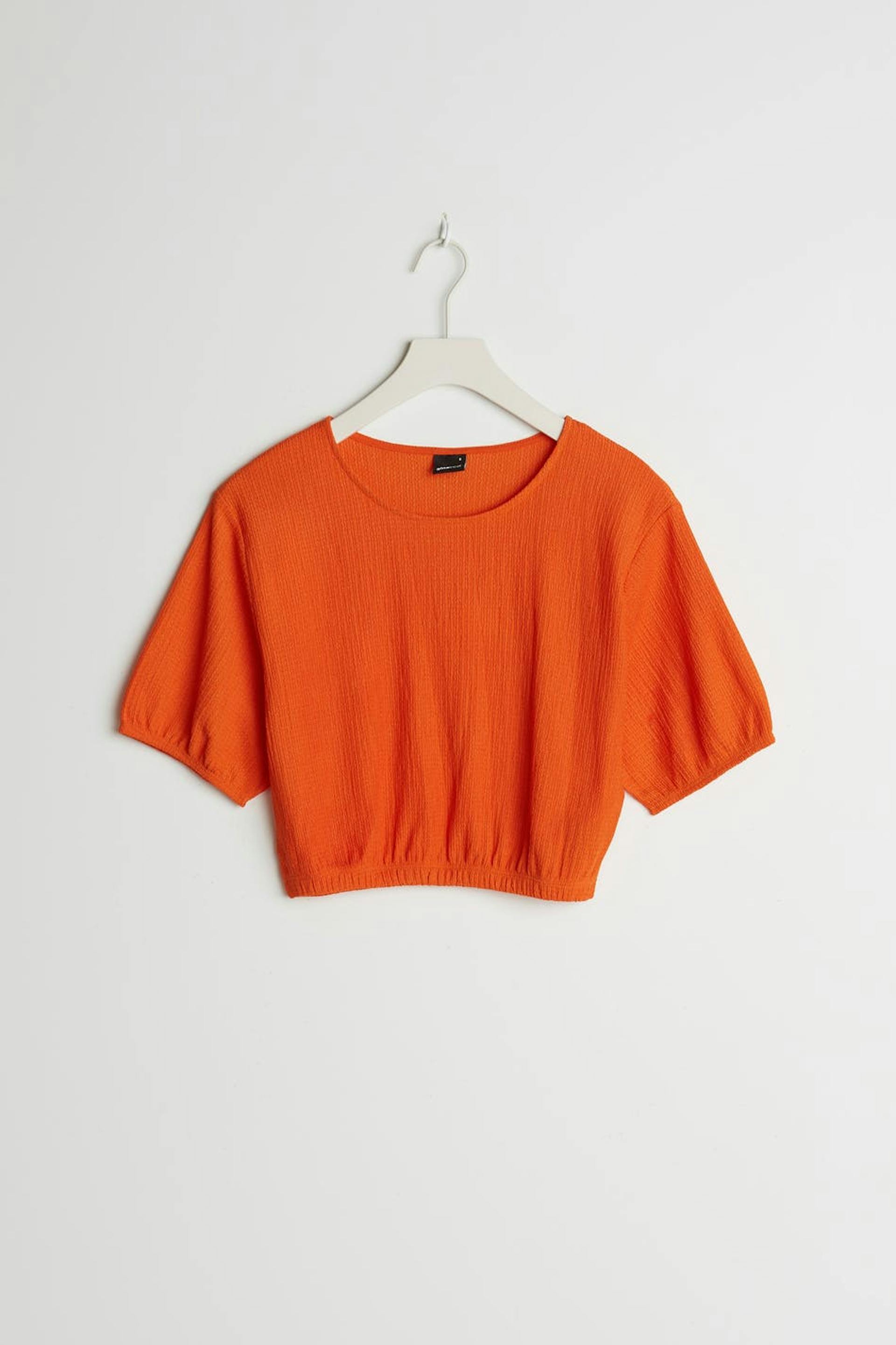 Kurzärmliges Top mit einer normaler Passform. Das Top ist orange und kurz und hat ein Gummiband an den Ärmelenden und am Saum.
