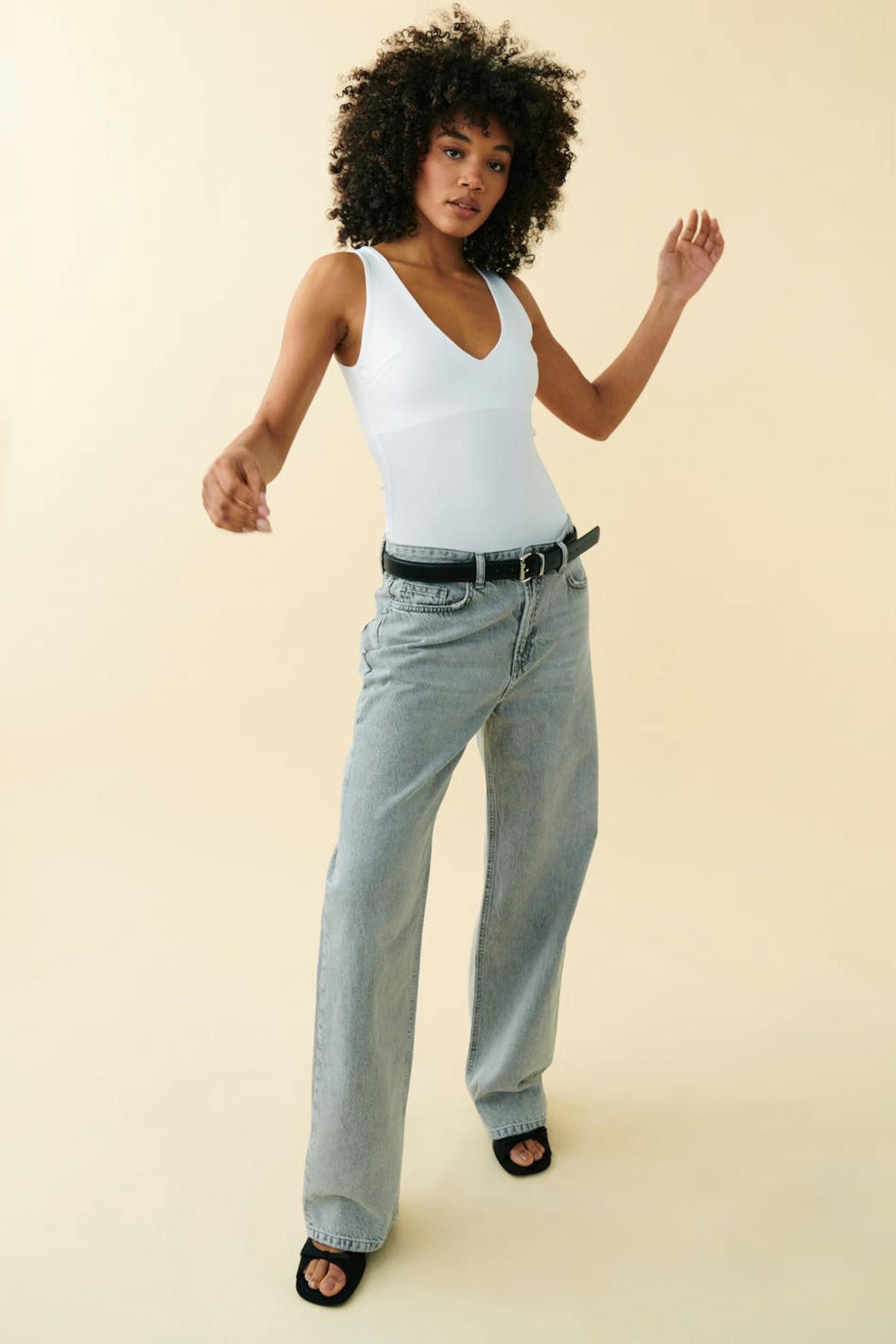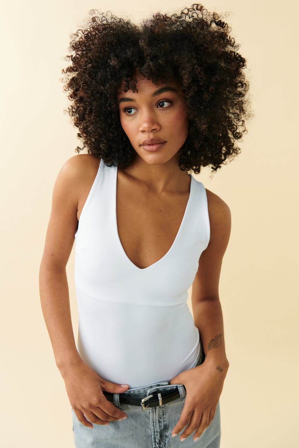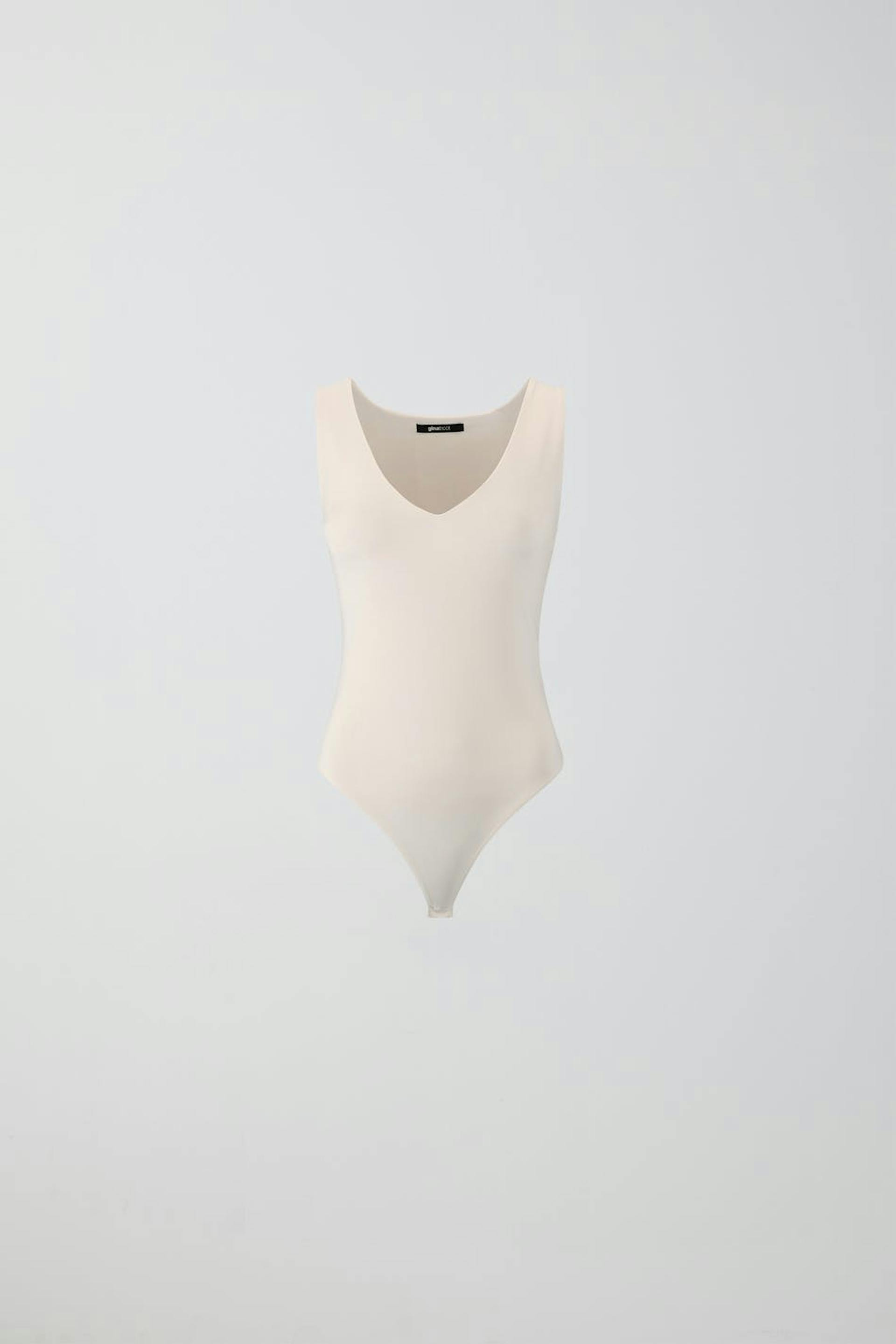 Ärmelloser Body aus Jersey mit tiefem Ausschnitt. Der Body ist weiβ, gefüttert und elastisch. Er hat figurbetonte Passform und Knopfleiste im Schritt.