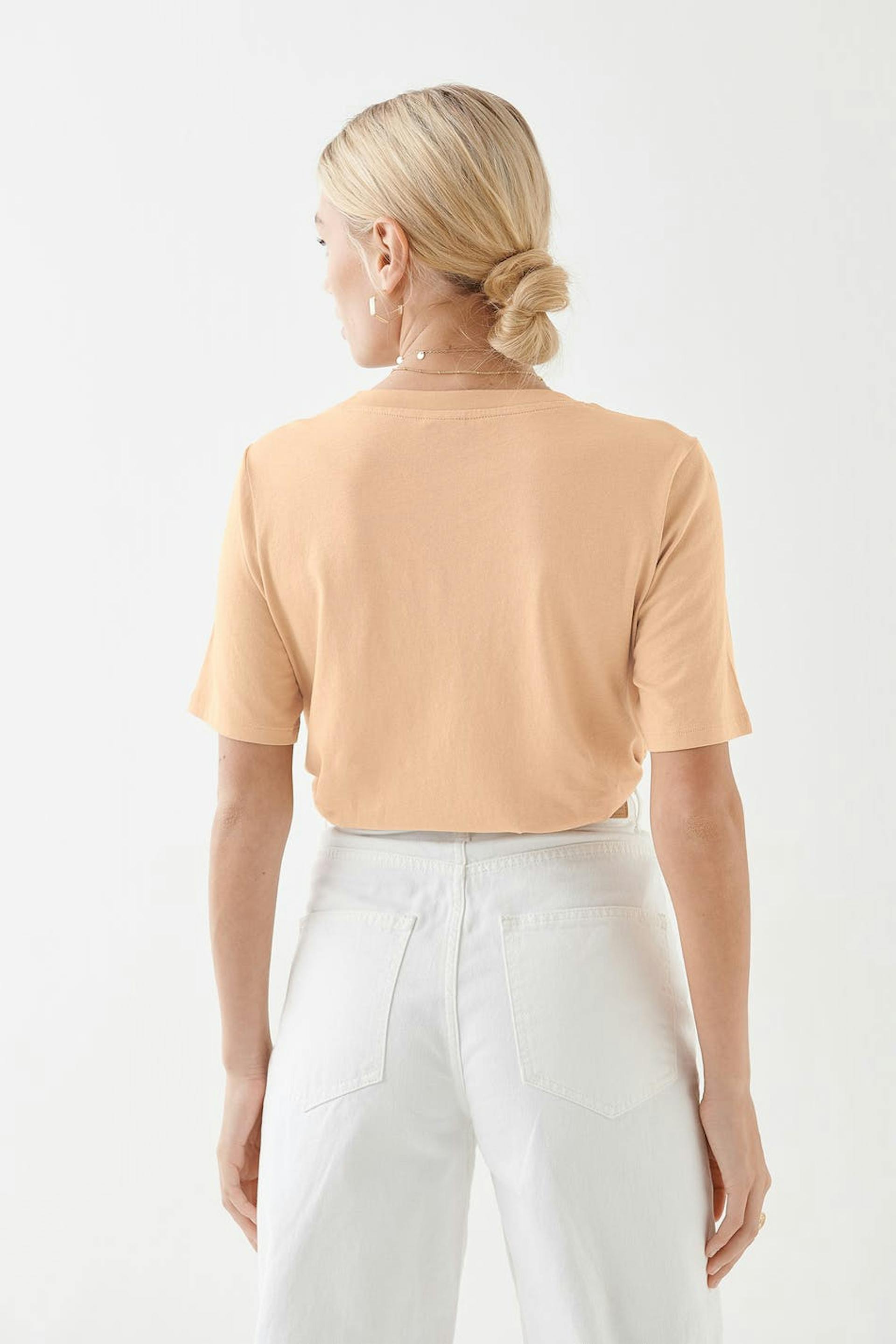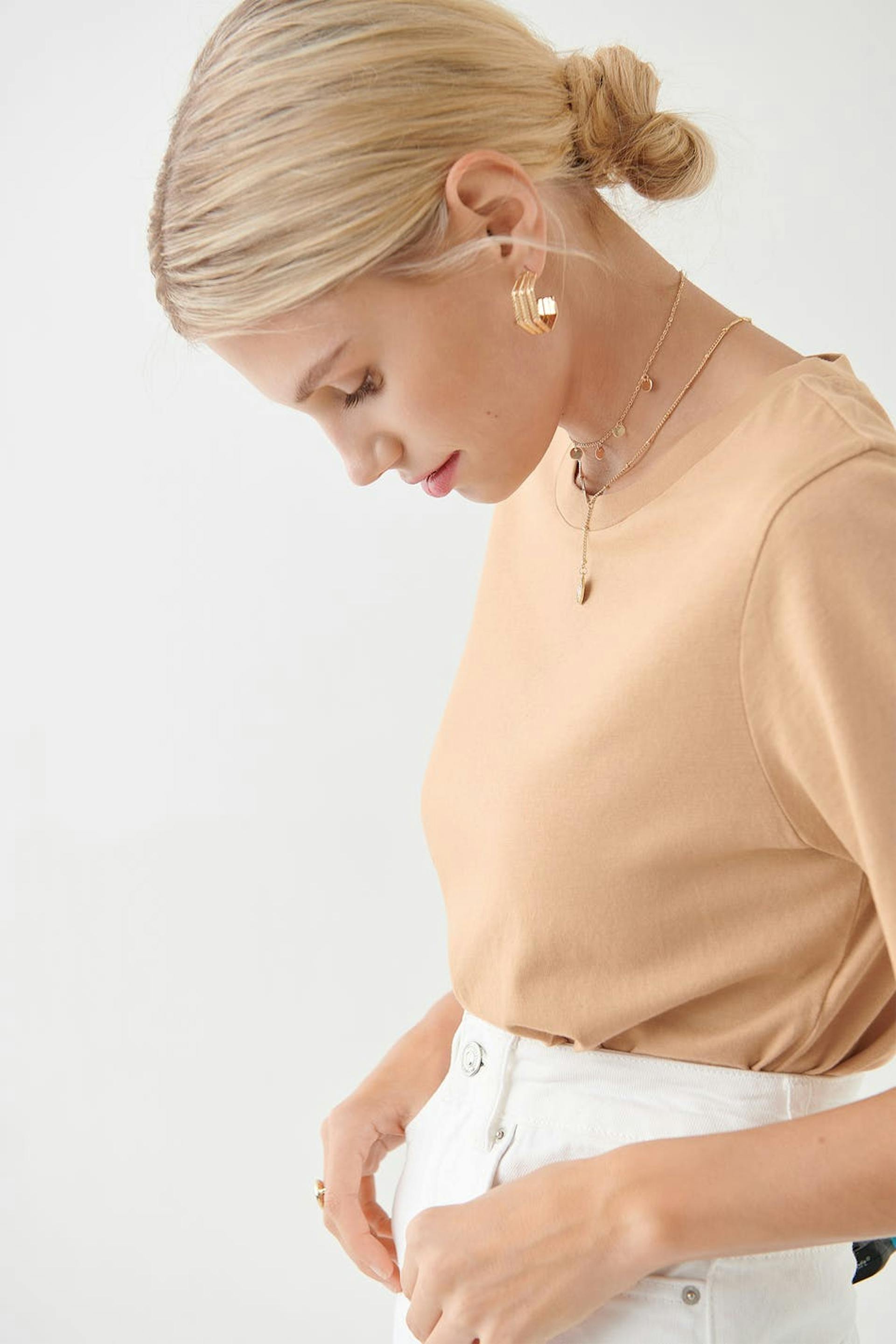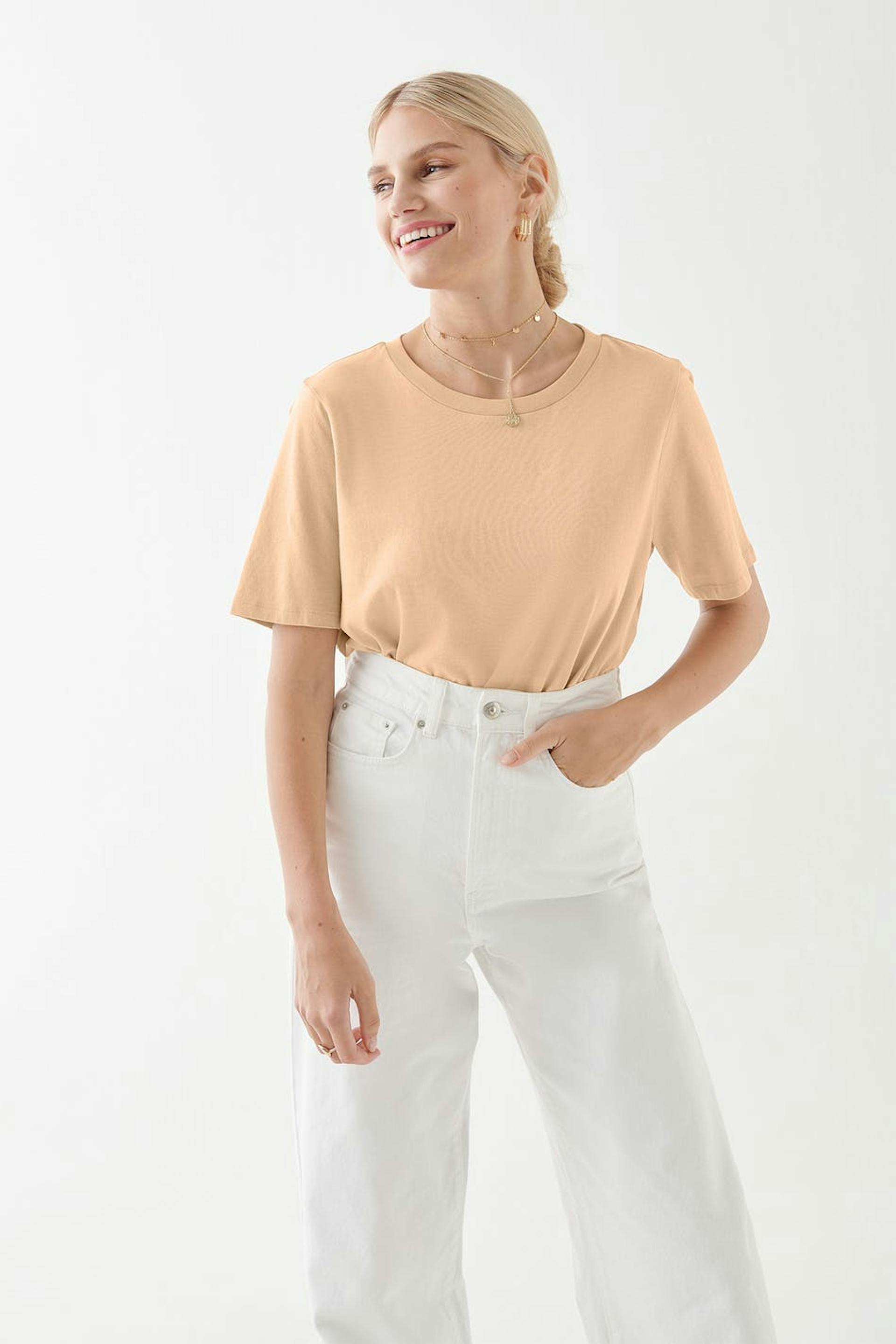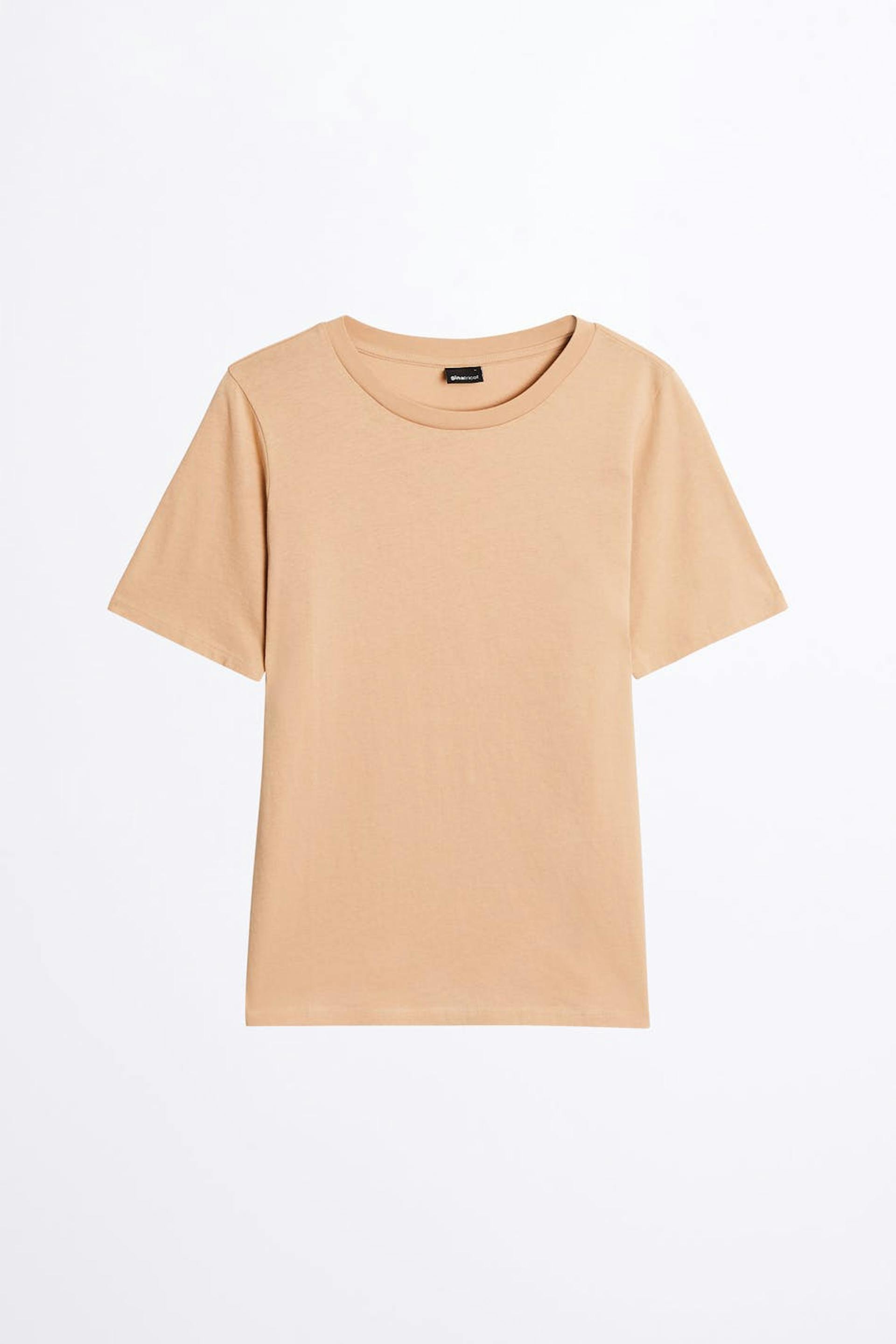 Kurzärmliges T-Shirt mit einer großzügigen Passform. Das T-Shirt ist beige.