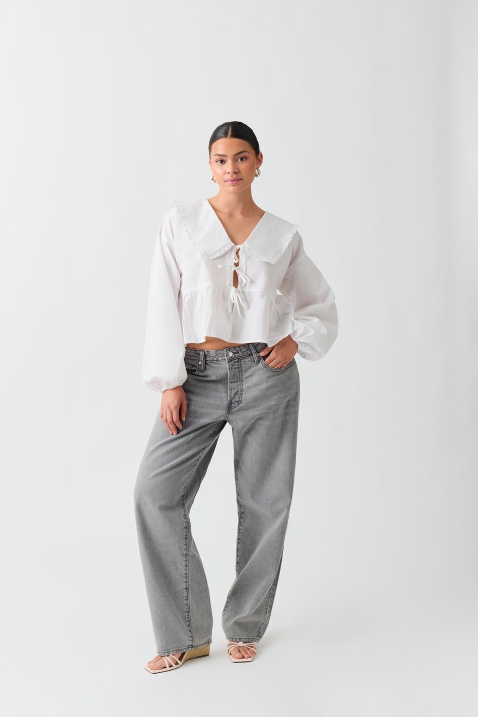 Bluse mit großem Kragen. Die Bluse ist weiβ und hat Schnürverschluss vorne. Sie hat eine Oversize-Passform, langen Ärmel mit elastischer Manschette und Rüschenrock am Kragen und an der Unterkante.