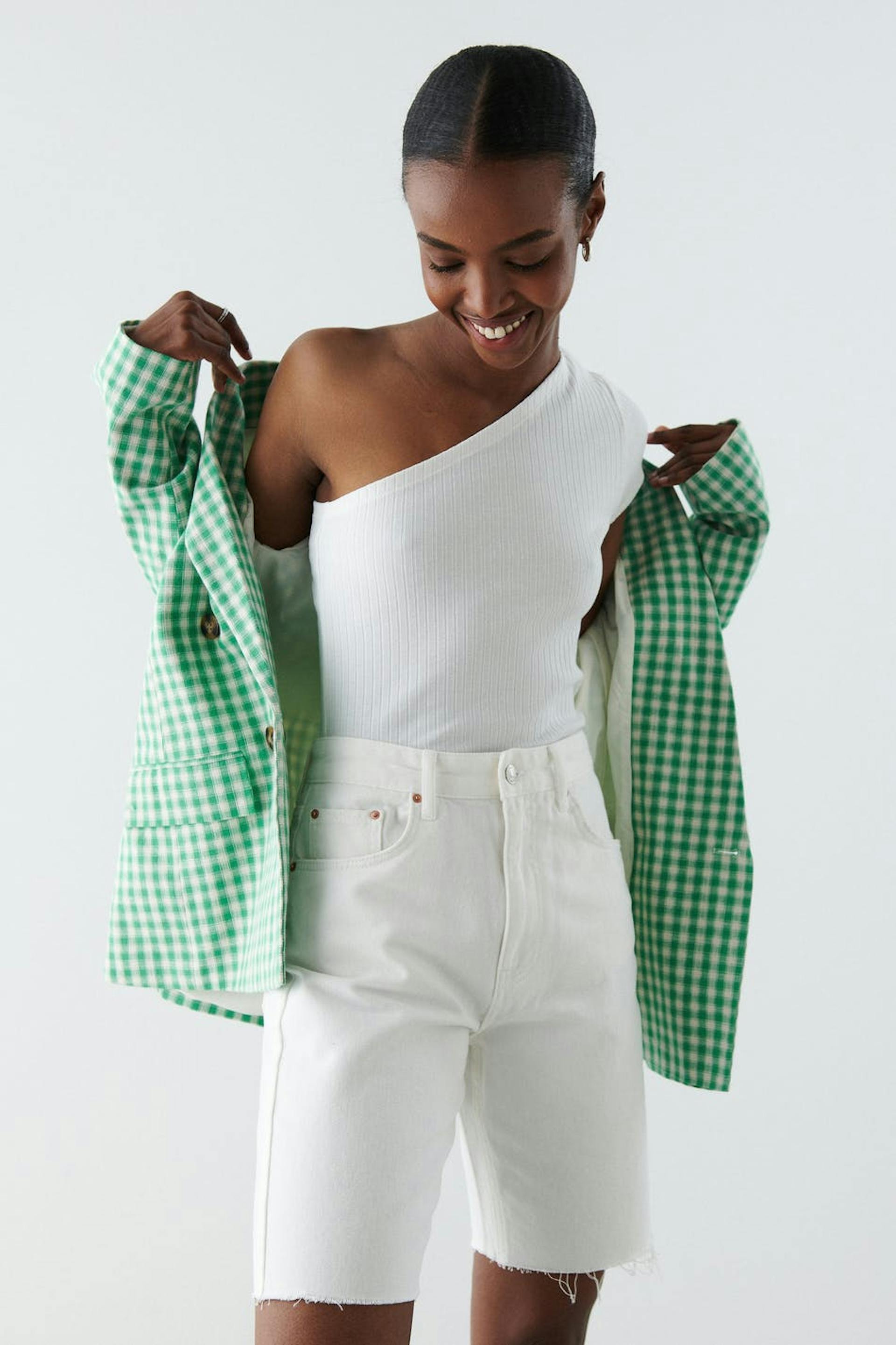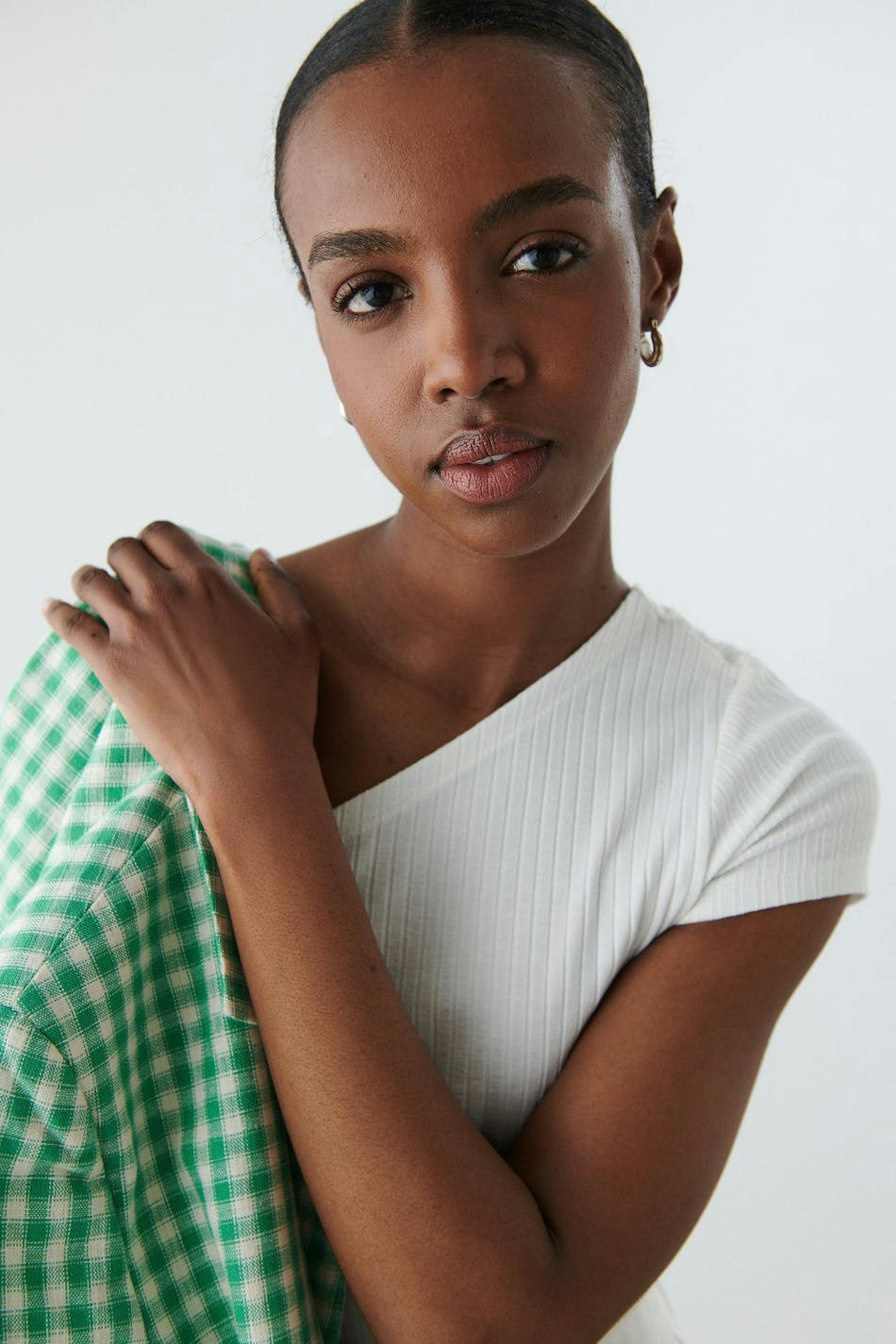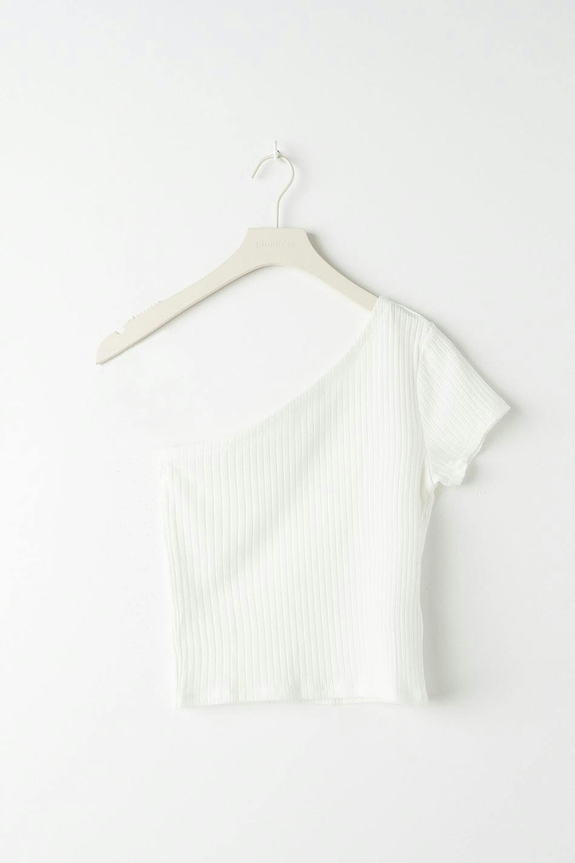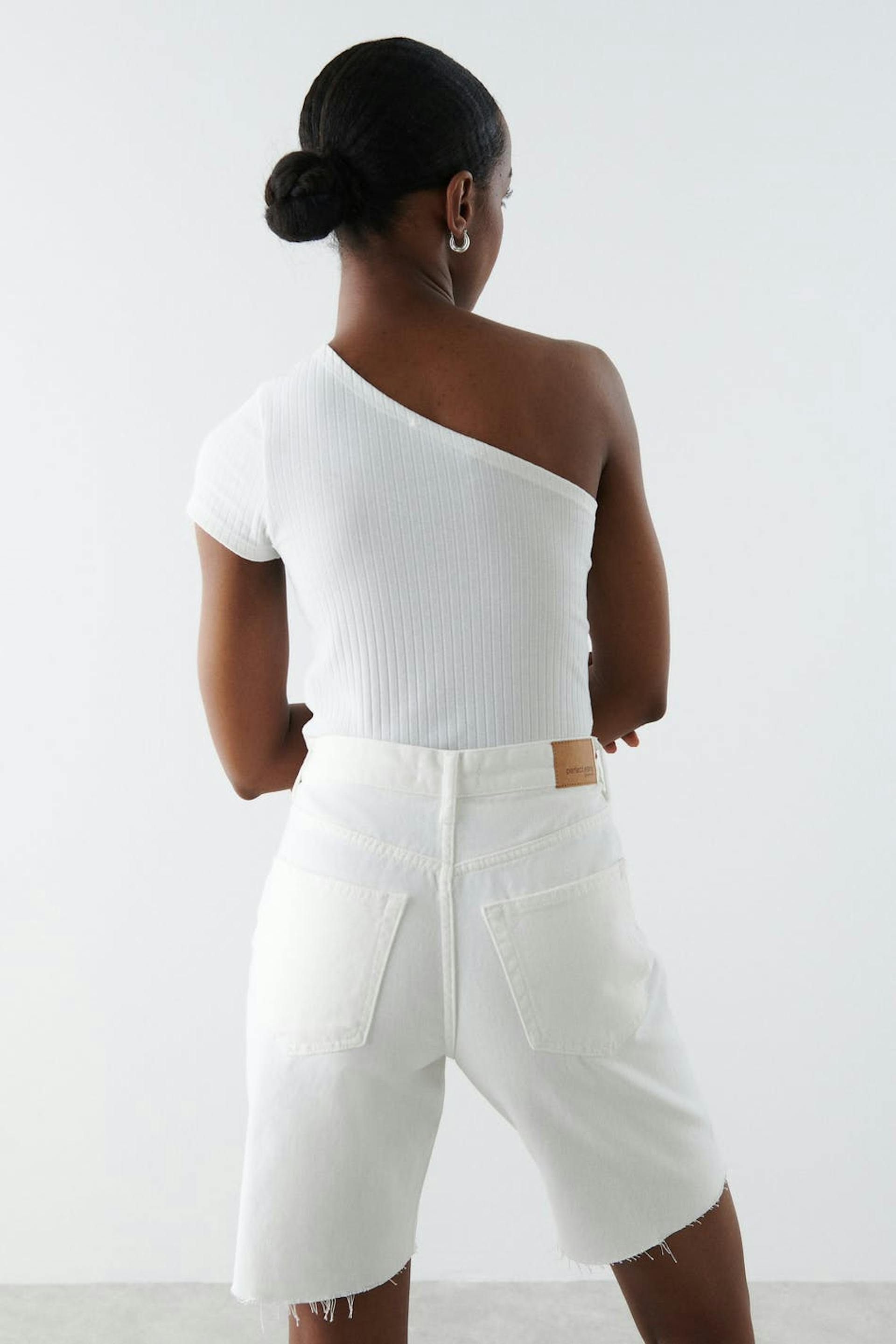 Geripptes One-Shoulder-Top aus Jersey mit einer figurbetonten Passform. Das Oberteil ist weiβ und kurzärmlig.