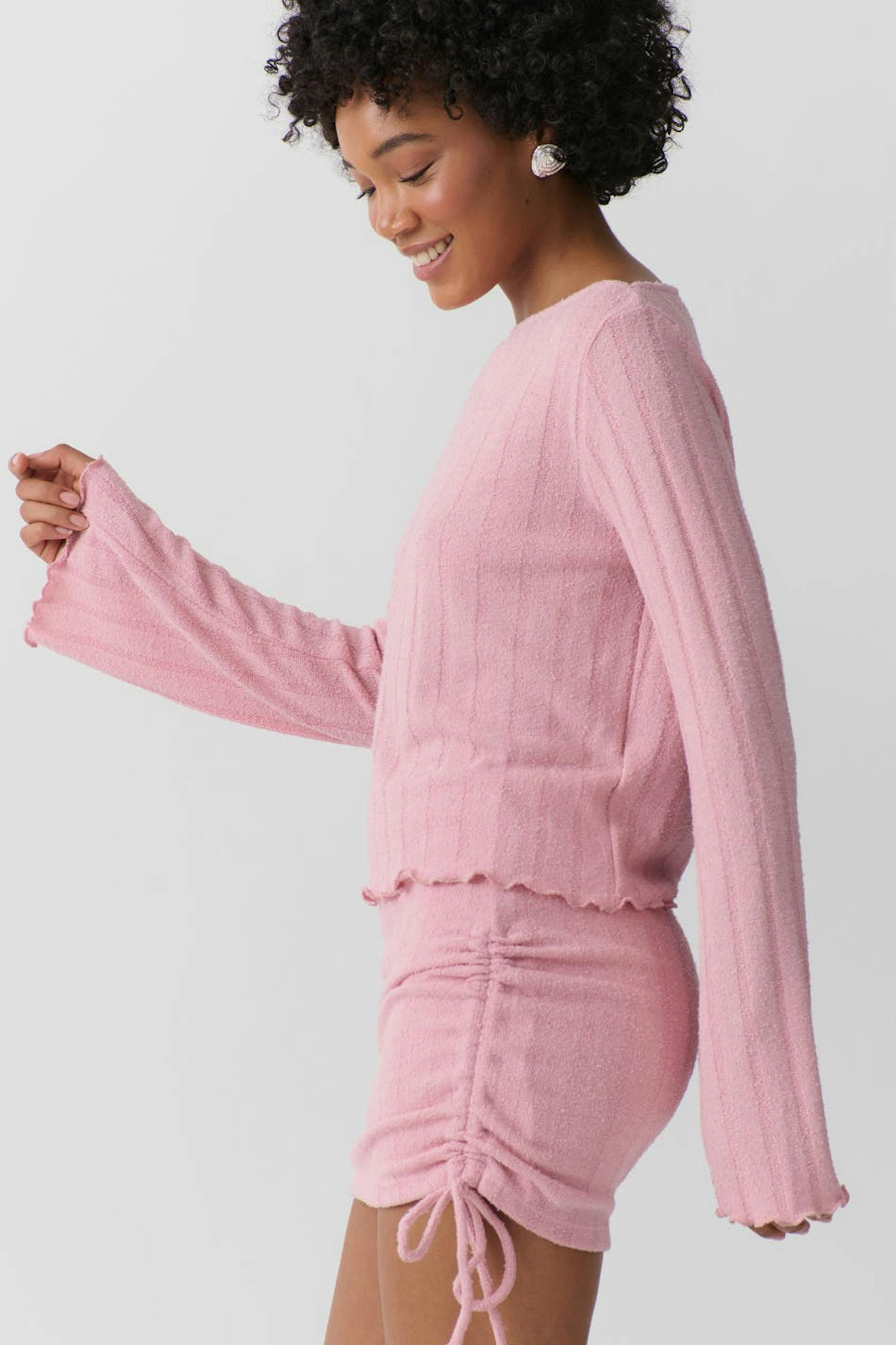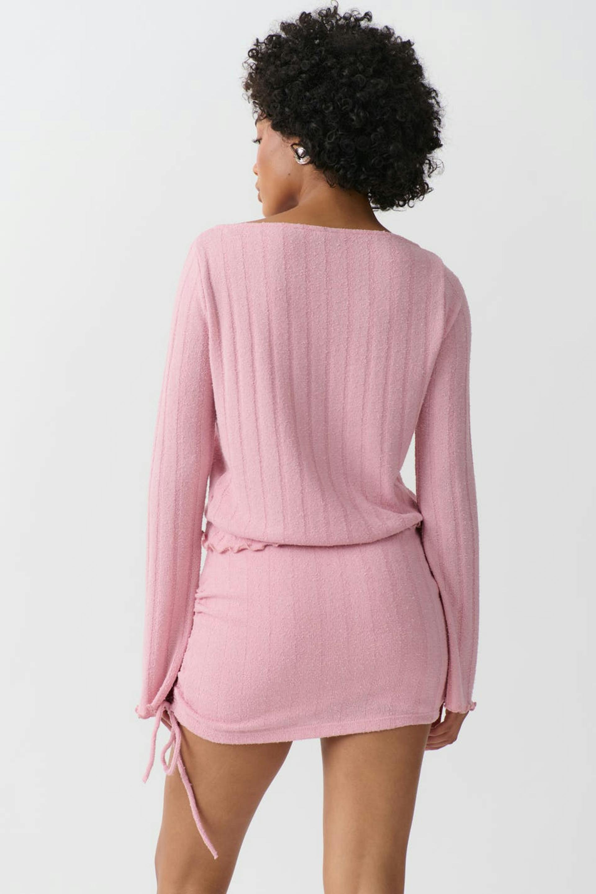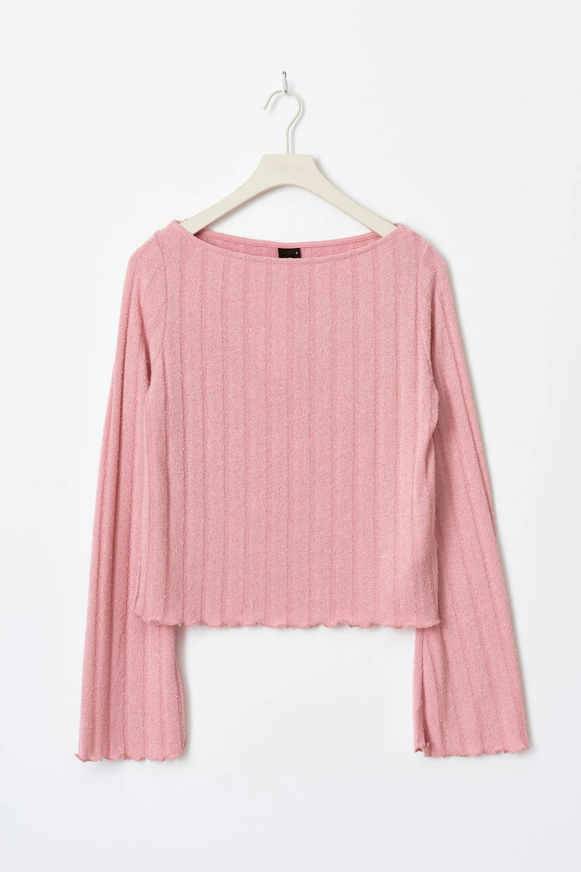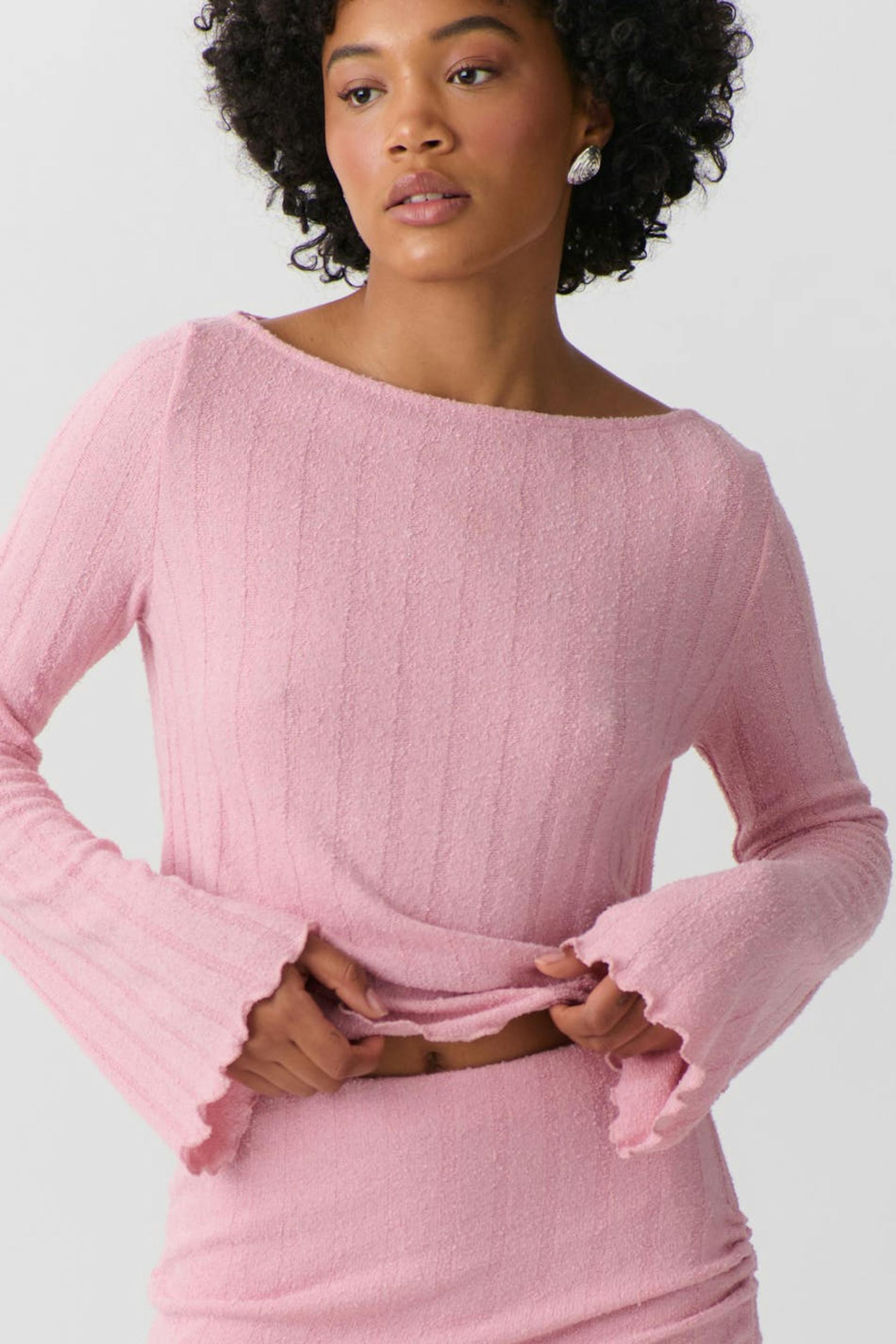 Geripptes Oberteil mit U-Boot-Ausschnitt. Das Oberteil ist rosa und hat eine Oversize-Passform. Es hat langen, ausgestellten Ärmel und gekräuselten Saum.