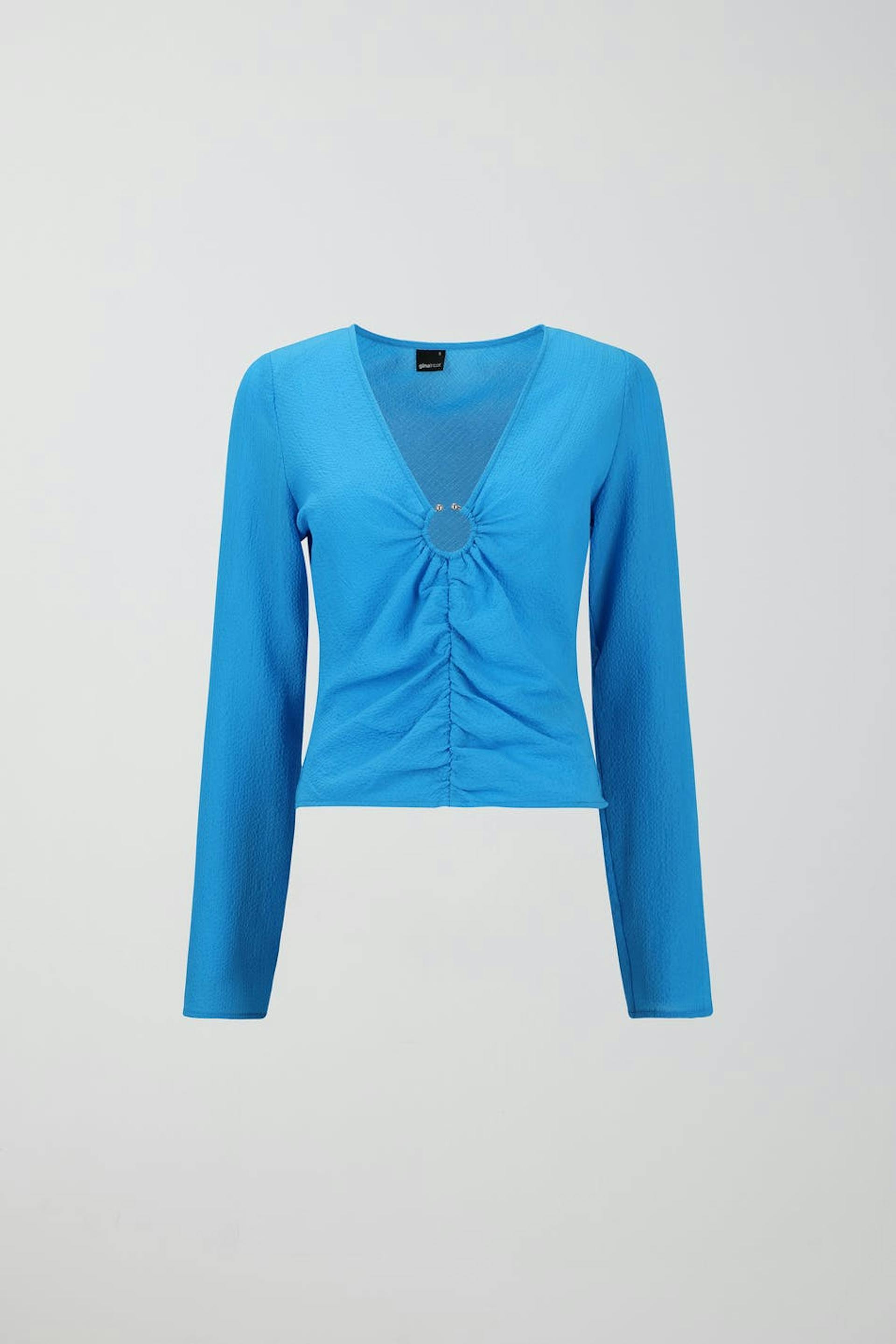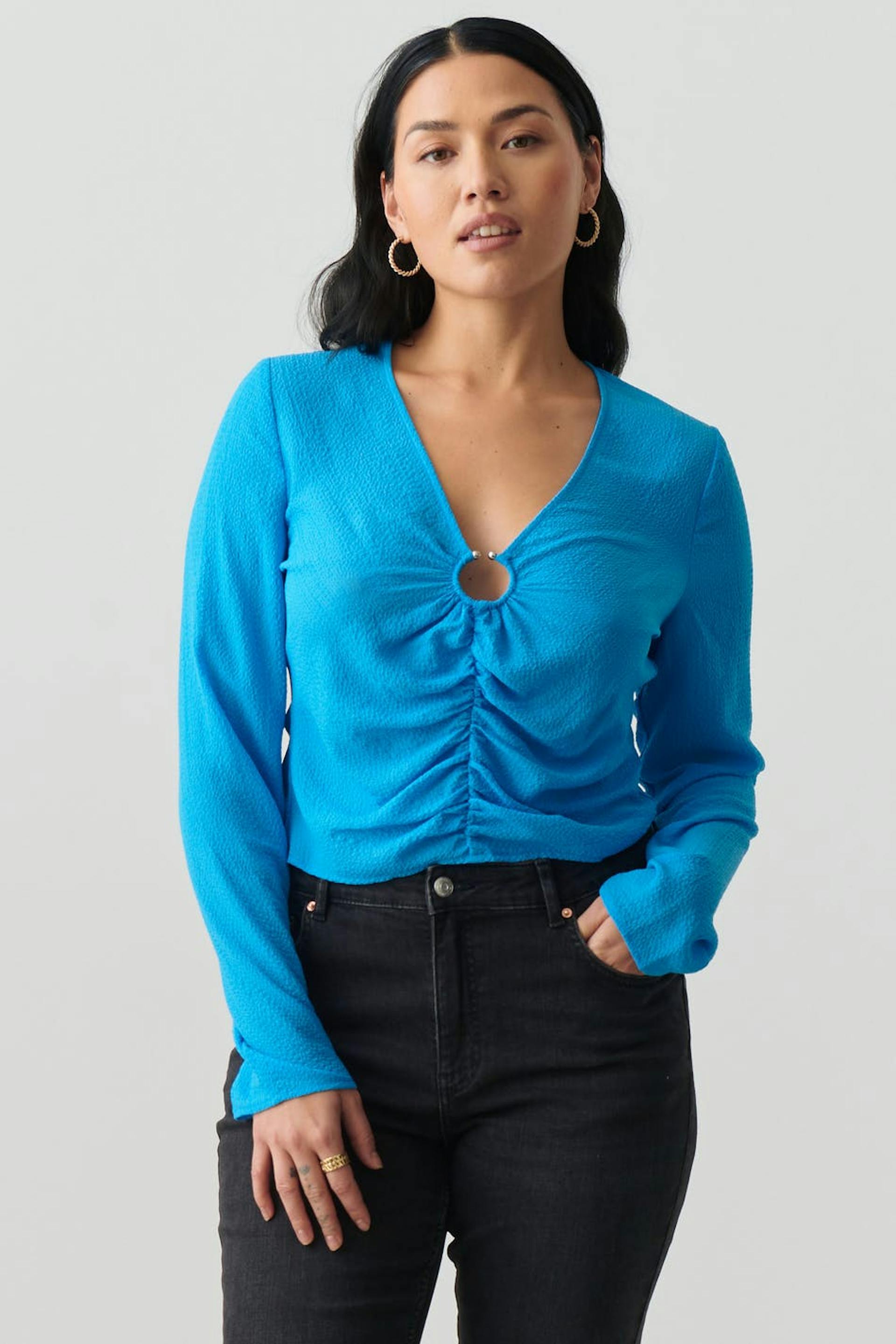 Langärmliges Oberteil aus Seersucker mit Raffungseffekt vorne. Das Oberteil ist blau und hat V-Ausschnitt mit dekorativem Metallring. Es hat eine gewebte, elastische Qualität.