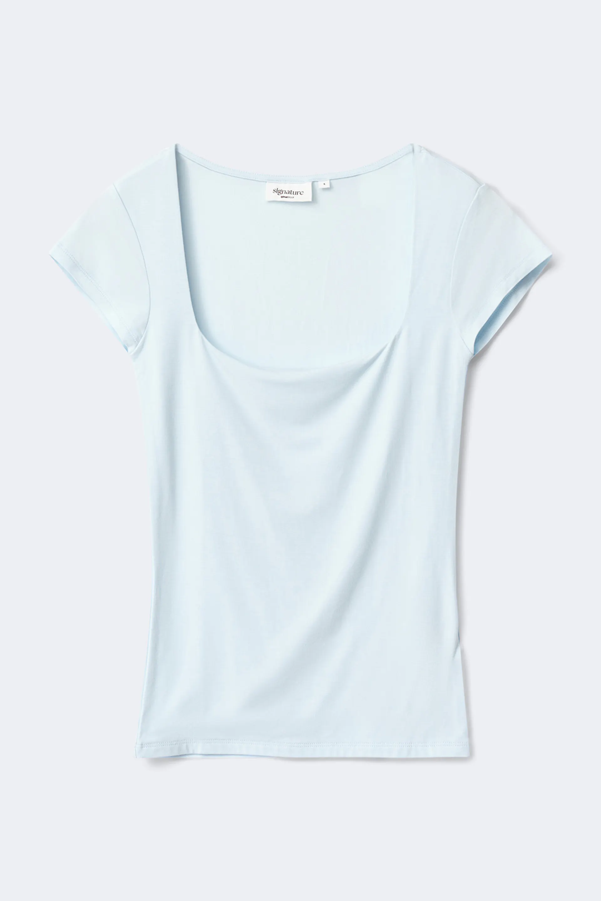 Kurzärmliges Oberteil mit Ausschnitt mit quadratischer Spitze. Das Oberteil ist hellblau und hat weiches, elastisches Material. Es hat figurbetonte Passform, normale Länge und gefütterte Vorderseite.