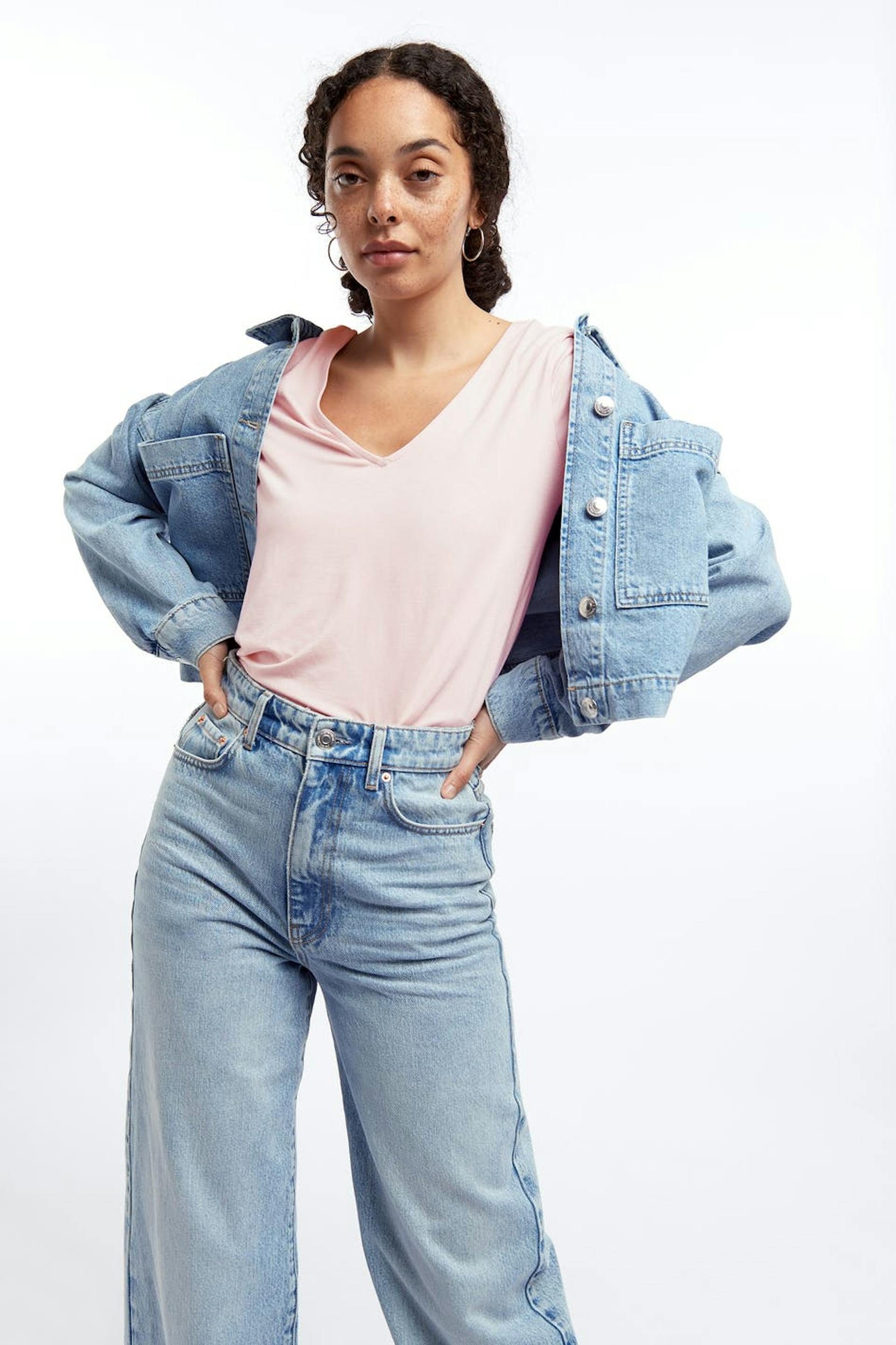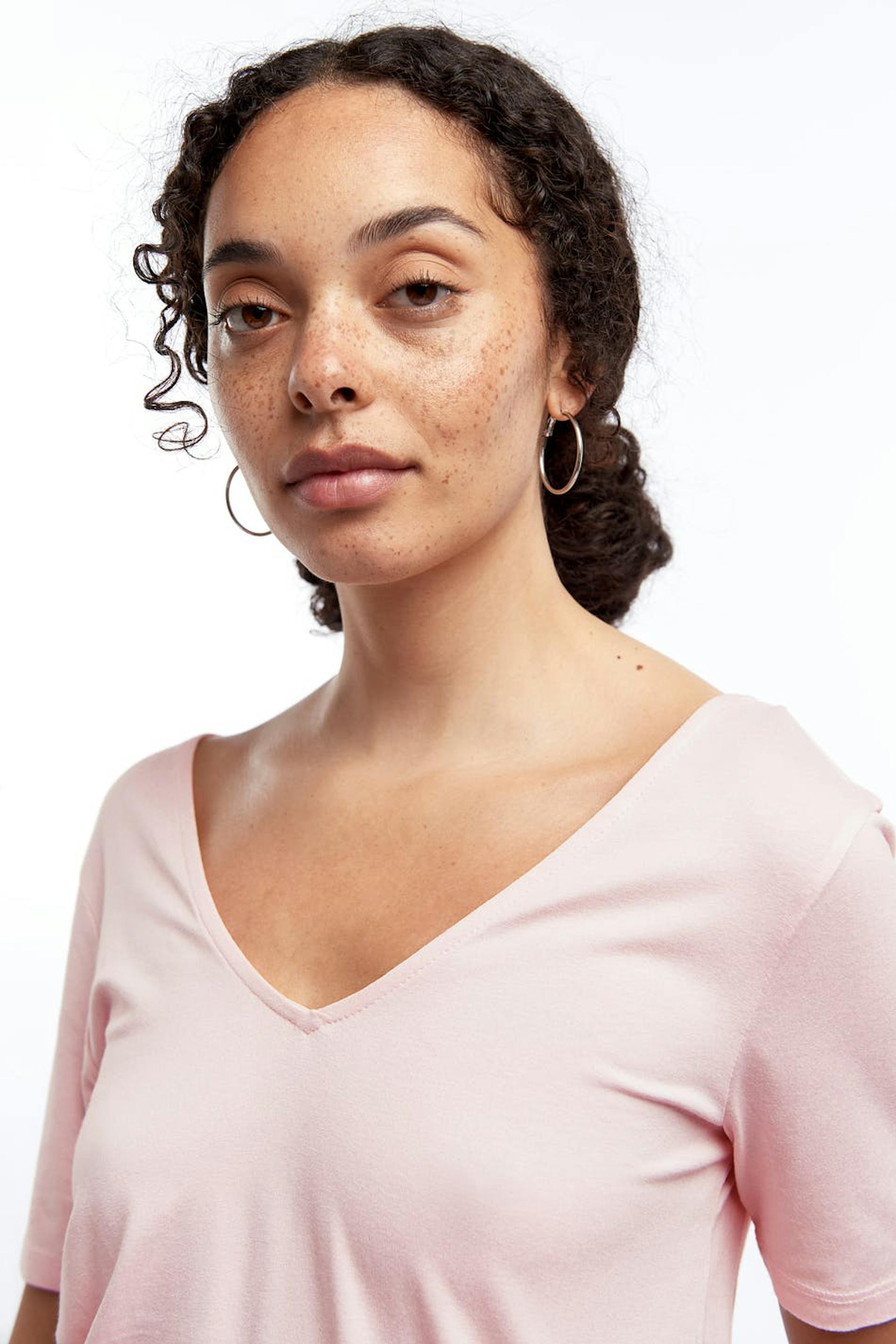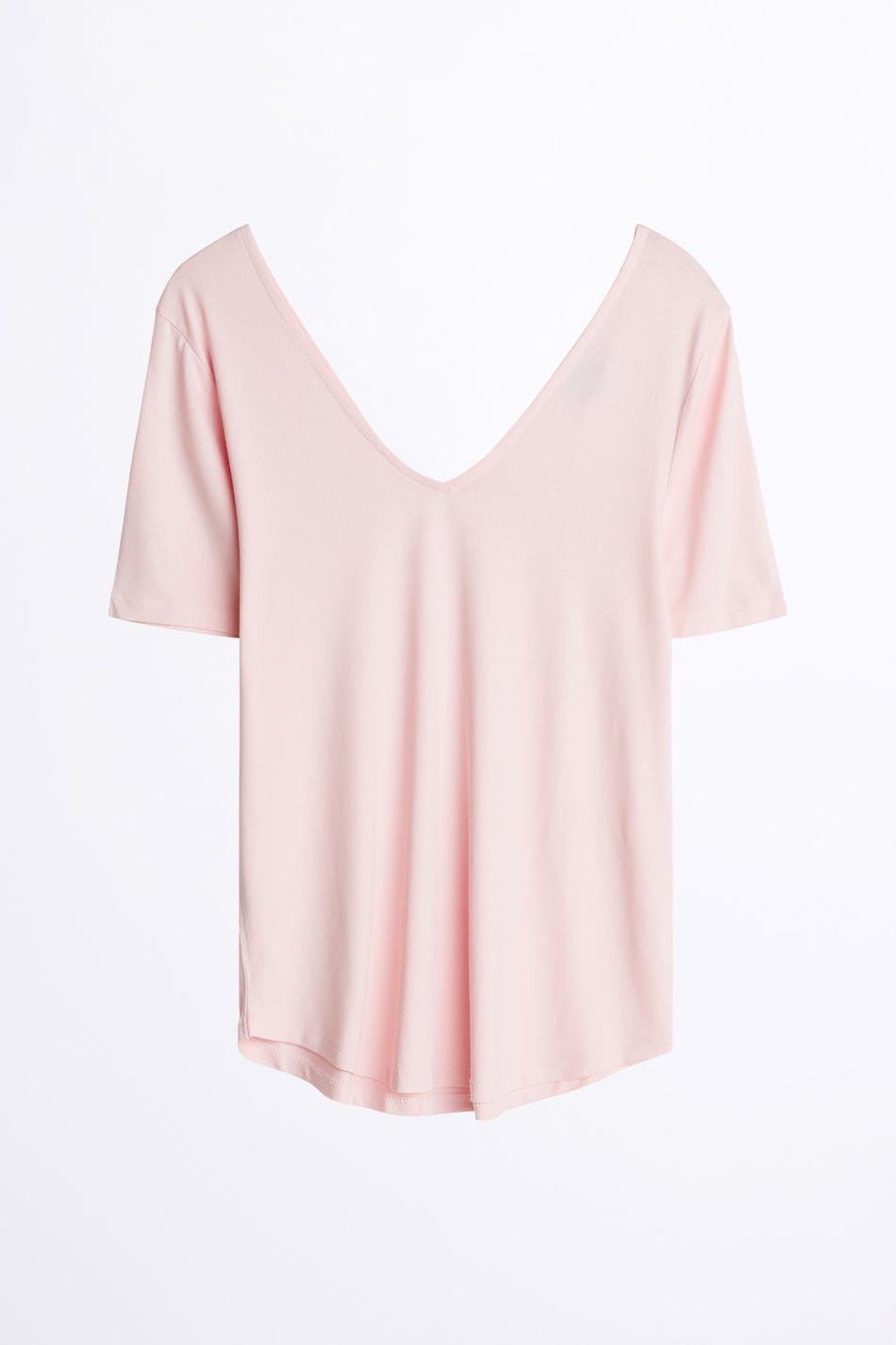 Weiches Top mit einer normaler Passform. Das Top ist hellrosa und hat einen V-Ausschnitt.