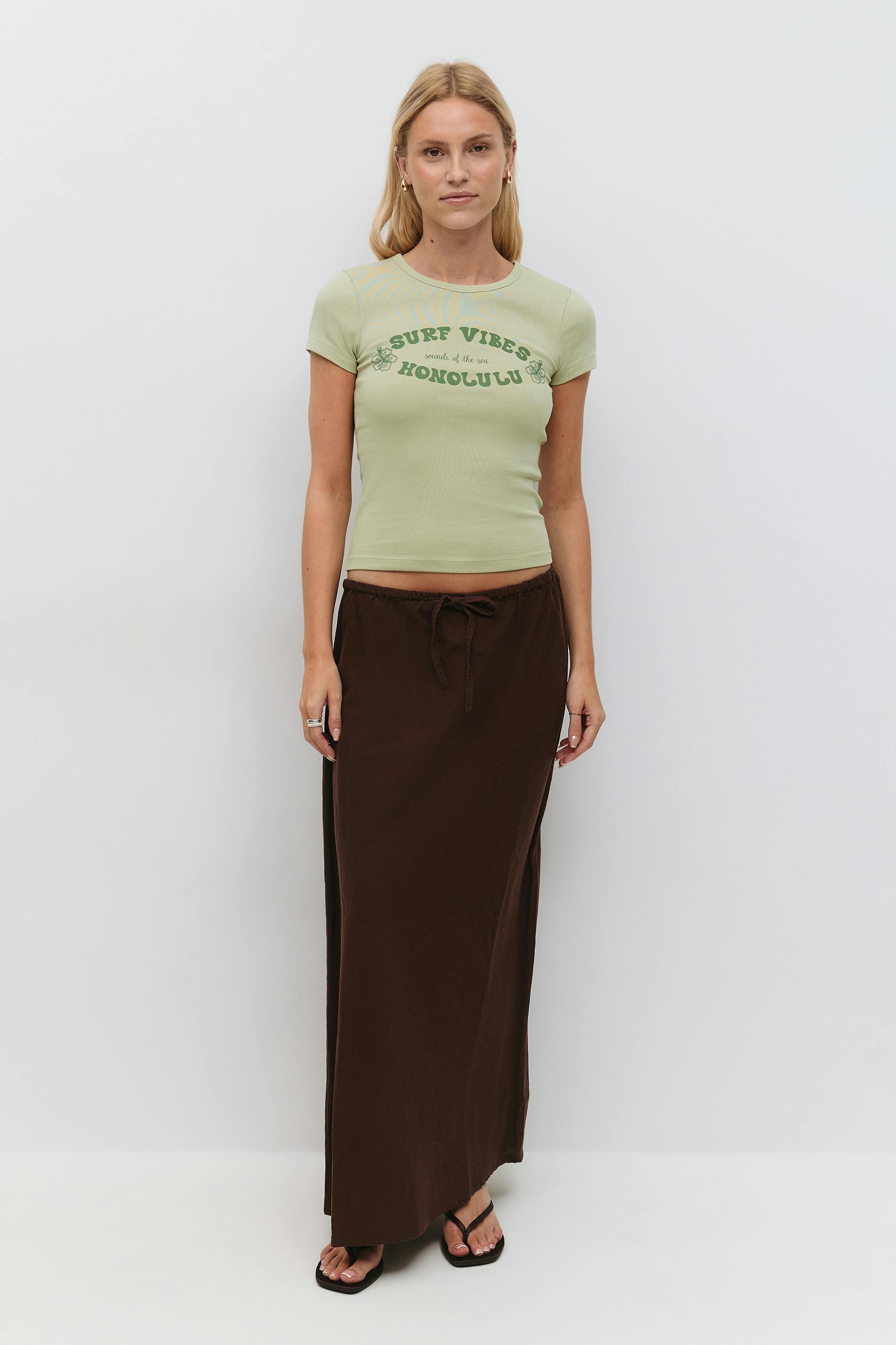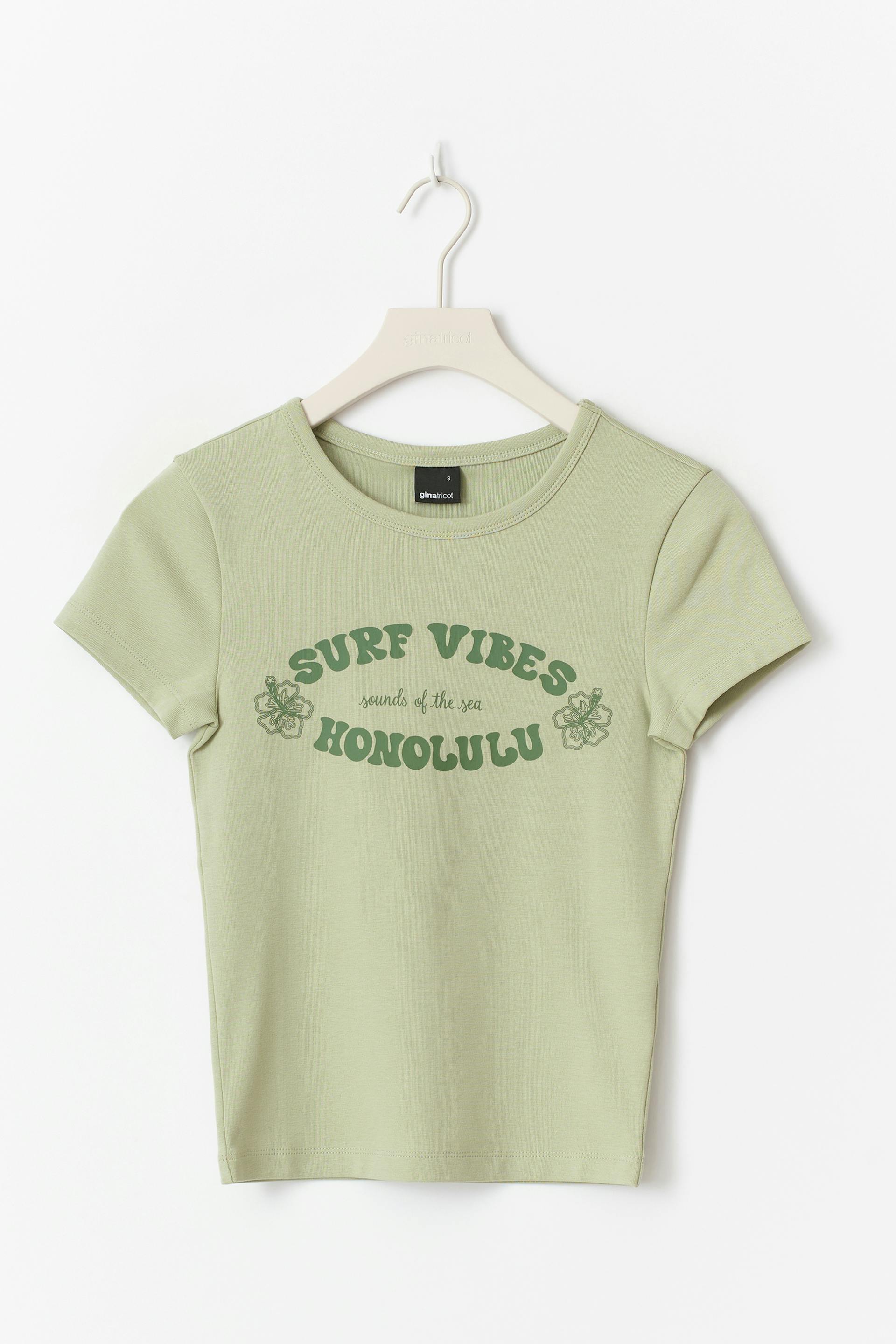 Kurzärmeliges Top mit Druck vorne. Das Oberteil ist grün und hat figurbetonte Passform. Es hat Rundhalsausschnitt und abgeschnittene Länge. Druck: Surf vibes Honolulu.
