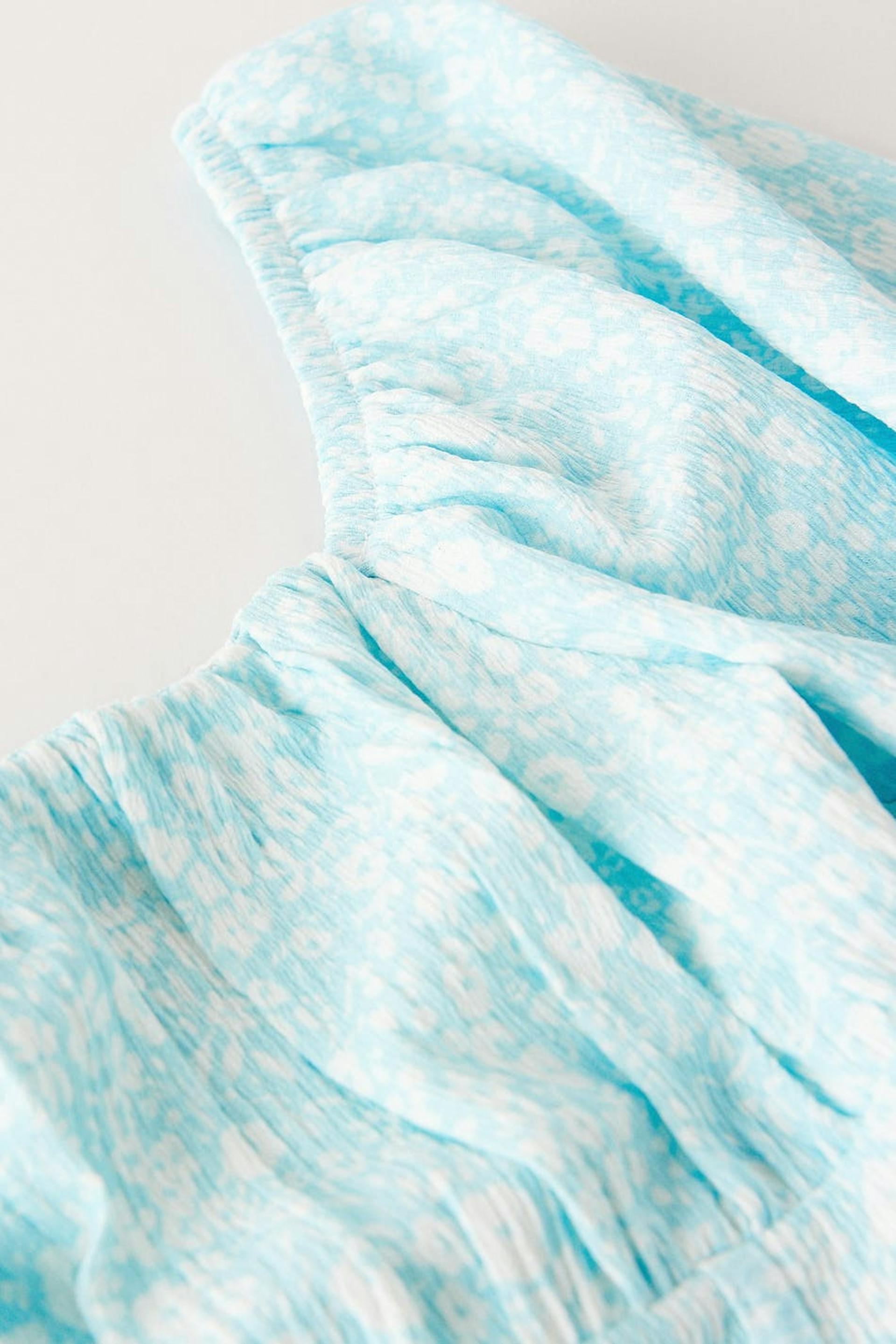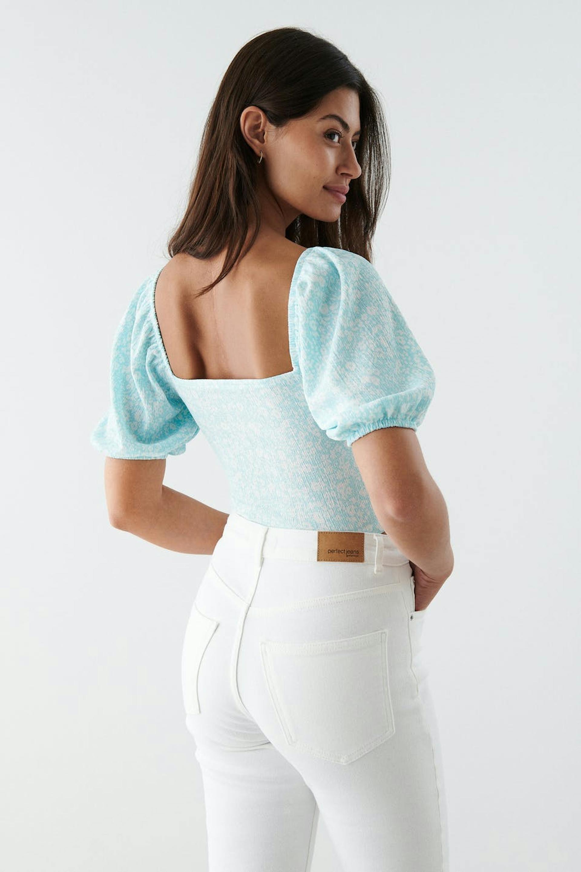 Gemustertes Korsett-Oberteil mit kurzen Puffärmeln. Das Oberteil ist blau und hat einen quadratischen Ausschnitt. Es hat ein strukturiertes Material und Raffungen unter der Büste.