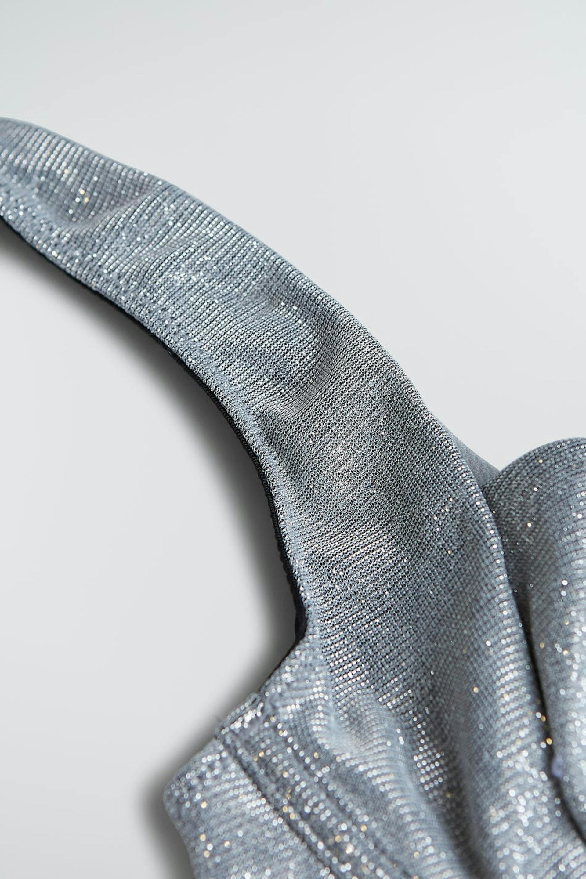 BH mit einem Bügel-BH. Der BH ist silbern und hat eine Knopfleiste hinten. Er hat breite, einstellbare Trägerbänder und einen glänzenden Stoff aus Metallfaser.