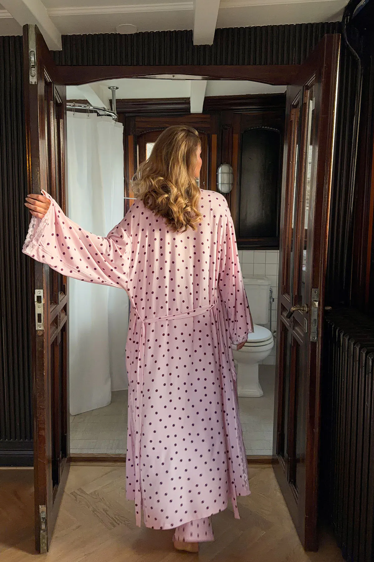 Gepunktete Robe aus modal mit Spitzendetails. Die Robe ist rosa und lang und hat Bindegürtel in der Taille. Sie hat lange Ärmel, weiches Material, Schlitz in den Seiten und Oversize-Passform.