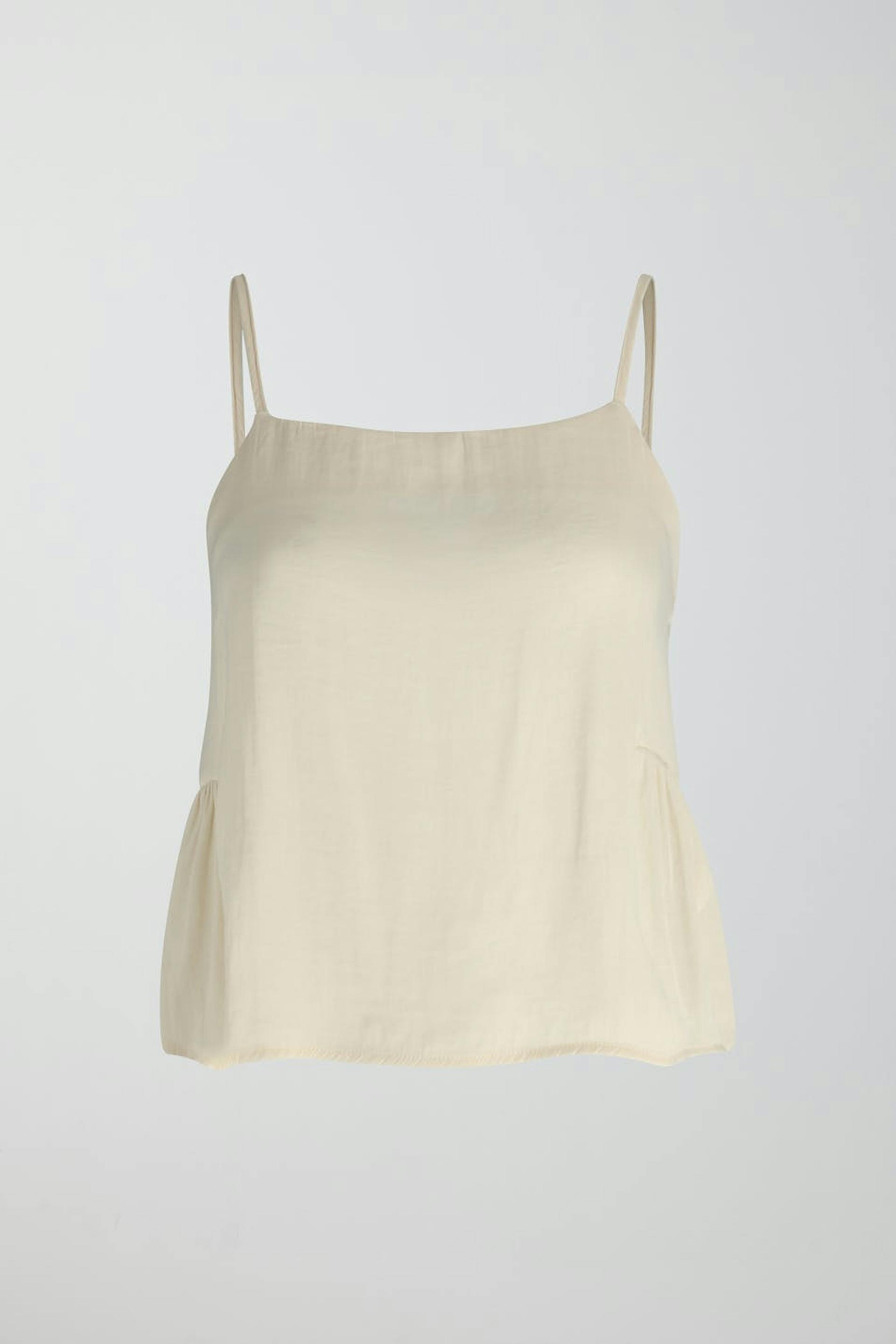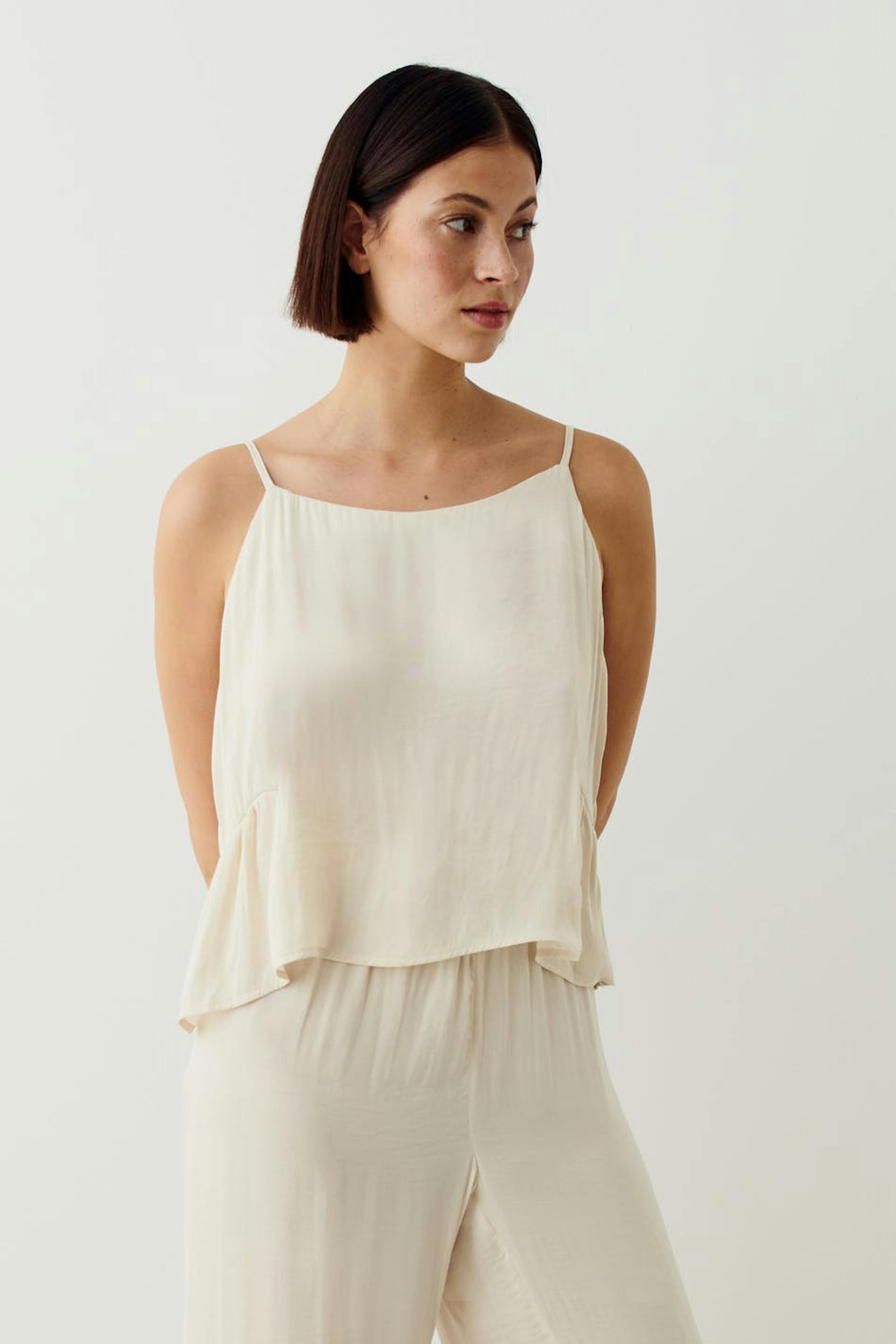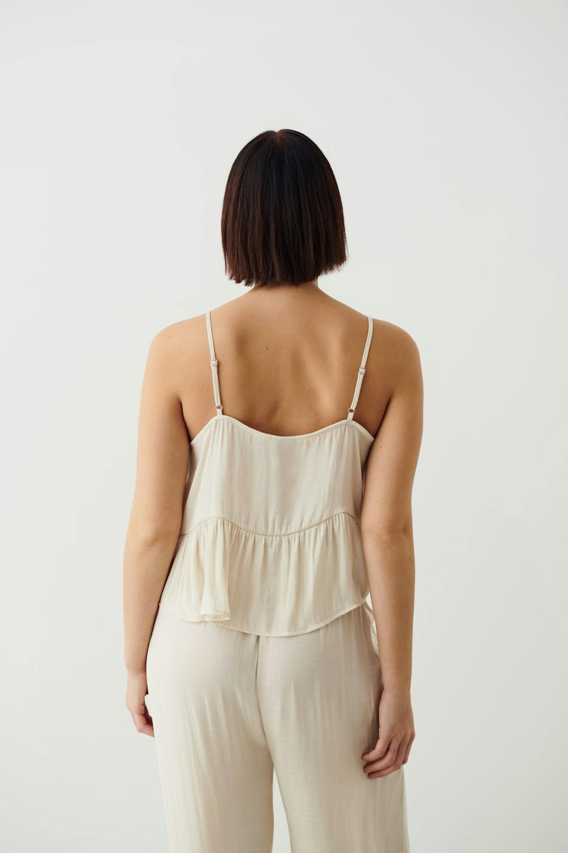 Pyjama-Unterhemd mit weit-geschnittenen Style. Das Damen-Unterhemd ist beige und hat ein Volant-Detail hinten. Es hat verstellbare Trägerbänder.