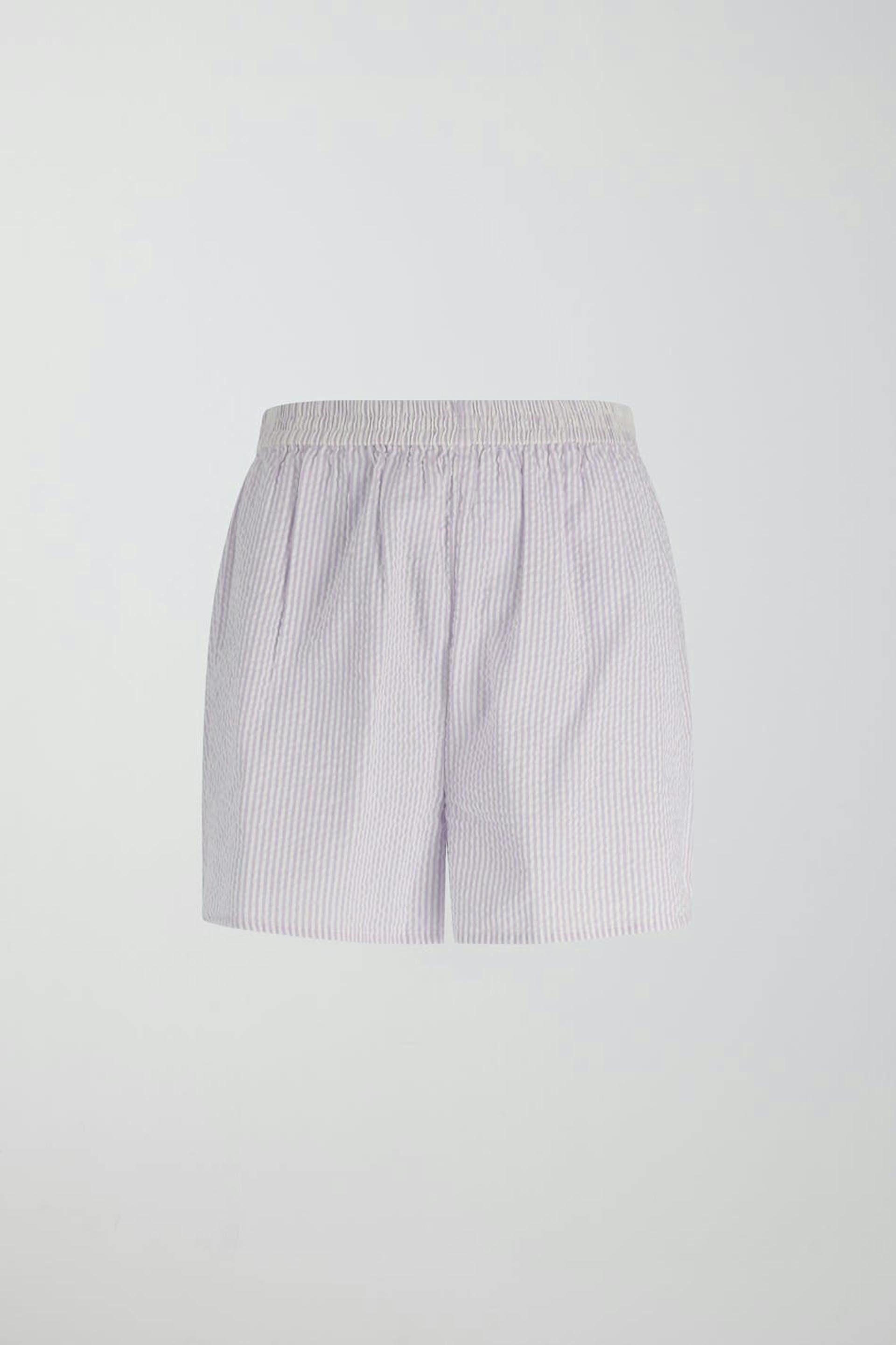 Gestreifte Pyjama-Shorts mit Gummiband in der Taille. Die Shorts sind lila und haben weiche Qualität mit Struktur.