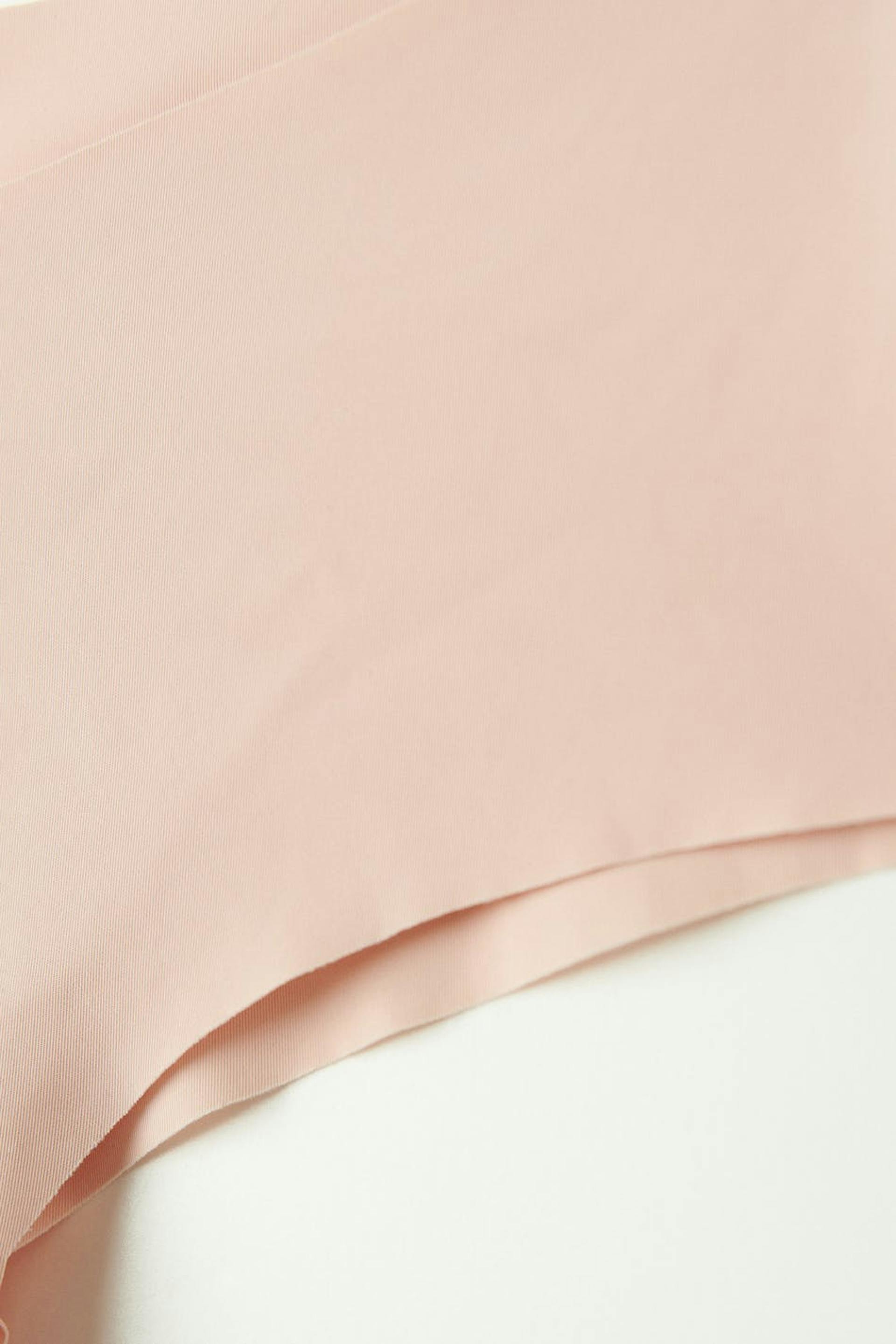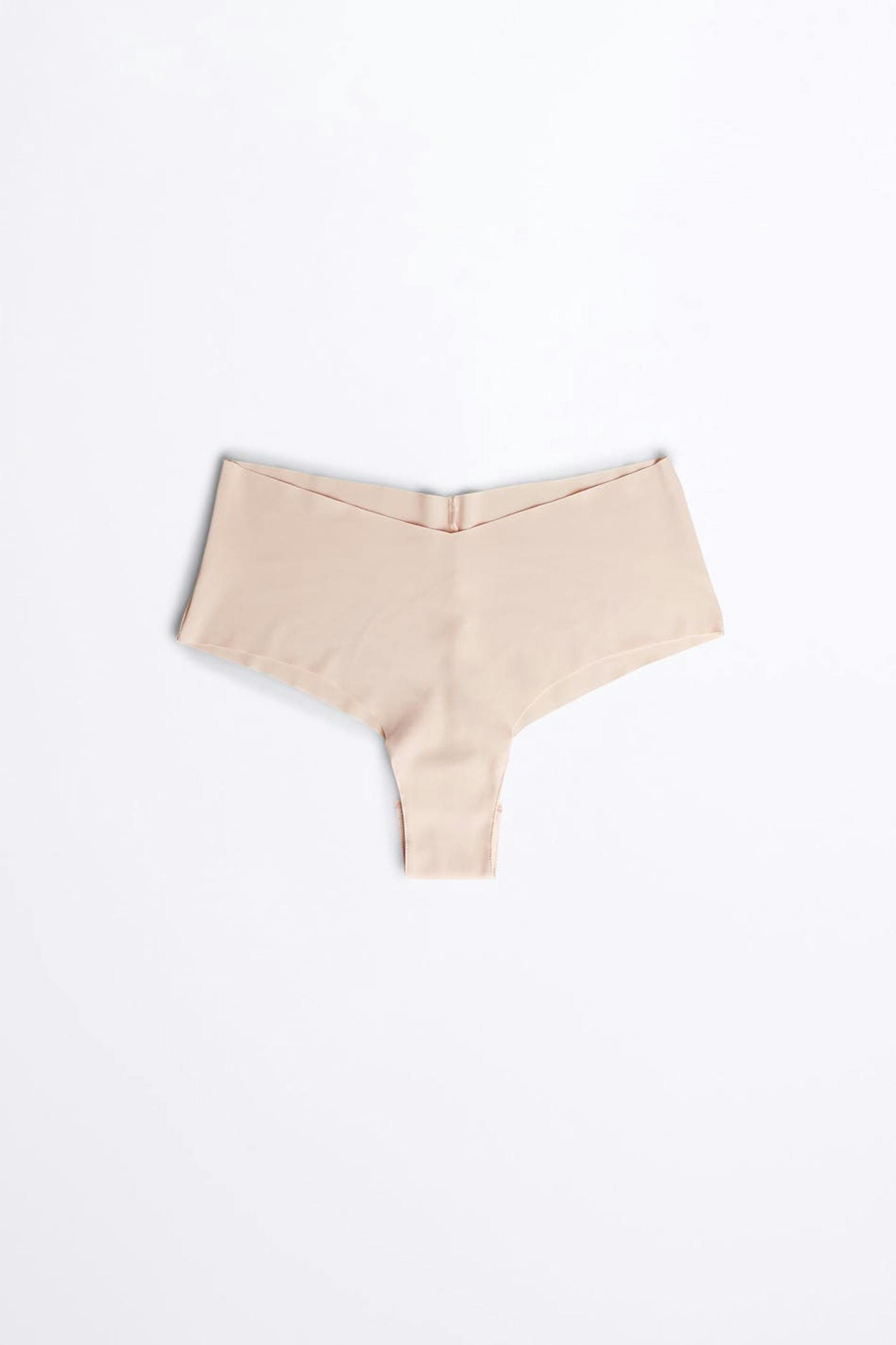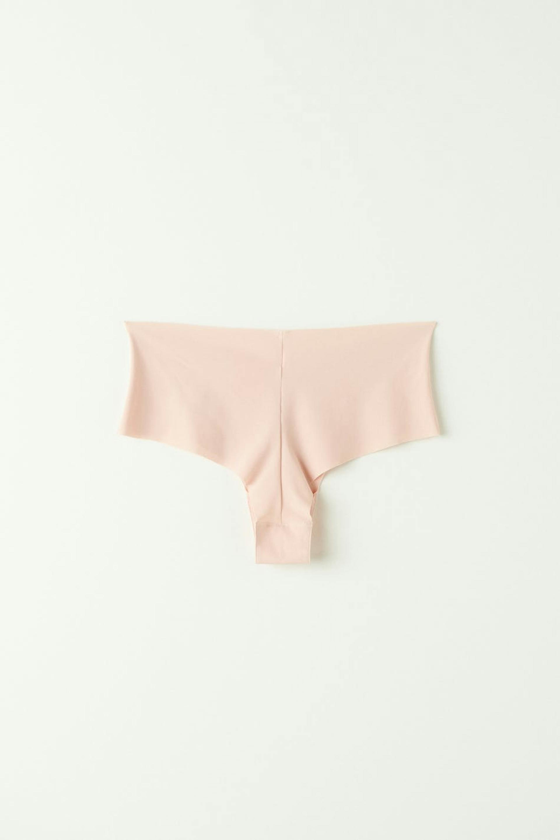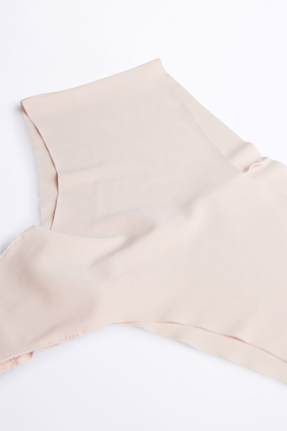 Brasilianisches Höschen mit Futter aus Baumwolle zwischen den Beinen. Das Höschen ist verblasste-rosa. Es ist hergestellt aus Mikrofaser.