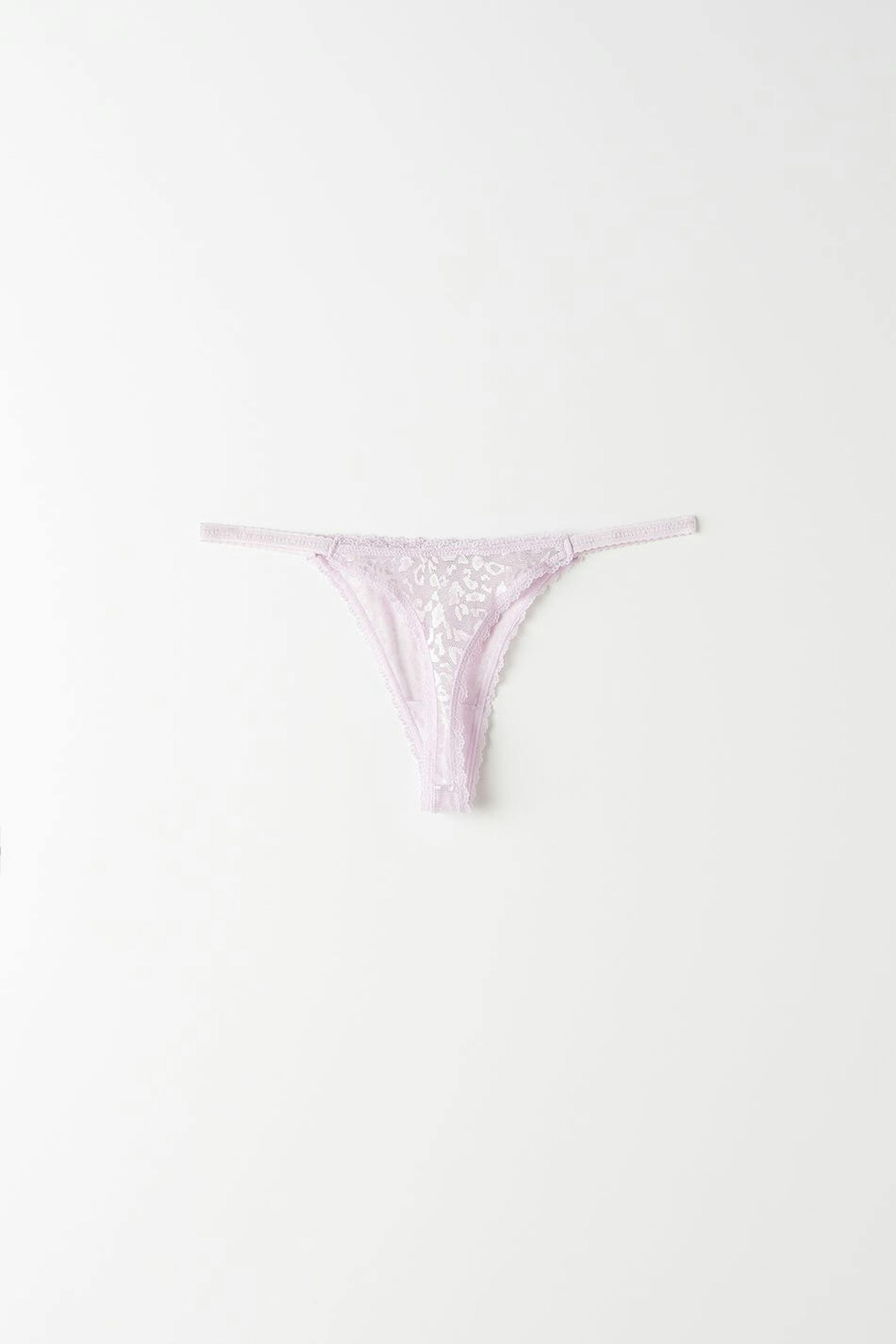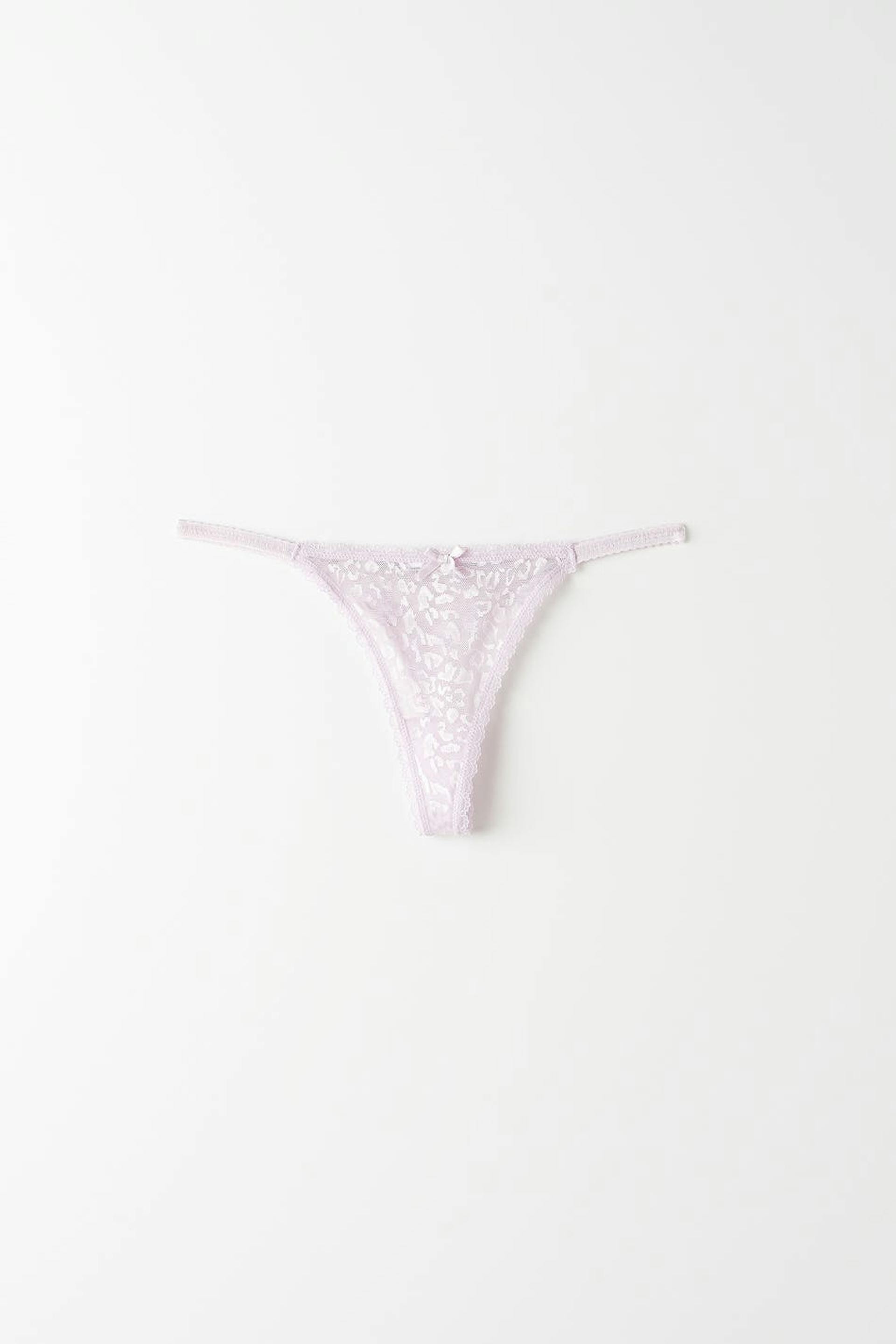 Gemusterte Stringtangas mit Spitzenborten. Die Stringtangas sind rosa und haben ein Schrittfutter. Sie haben einen Bogen vorne und schmale elastische Gurte in den Seiten.