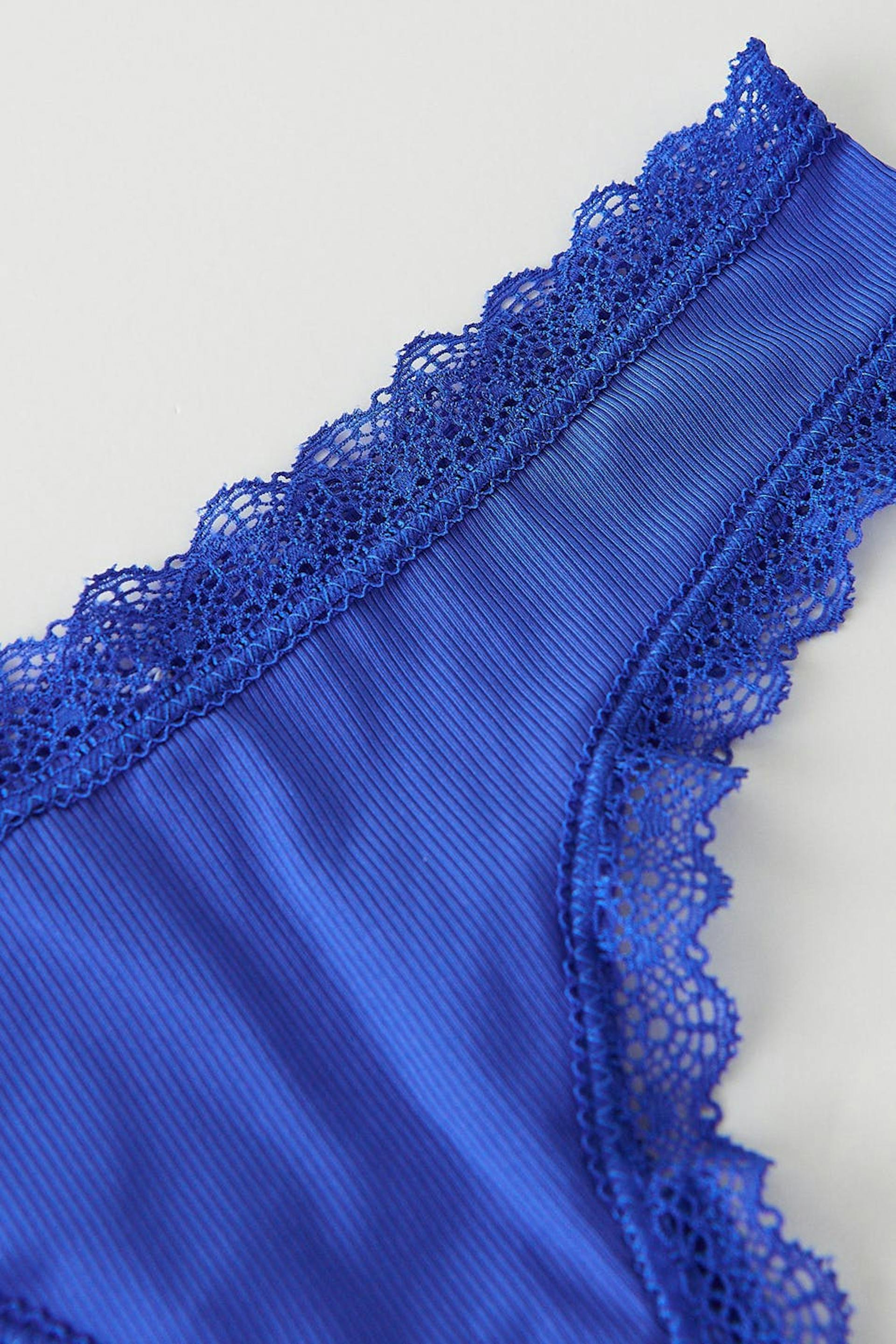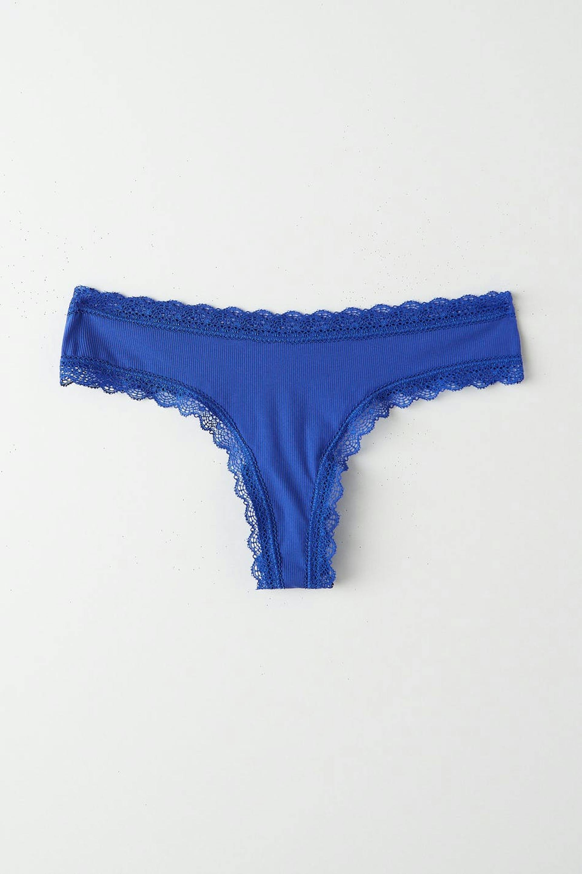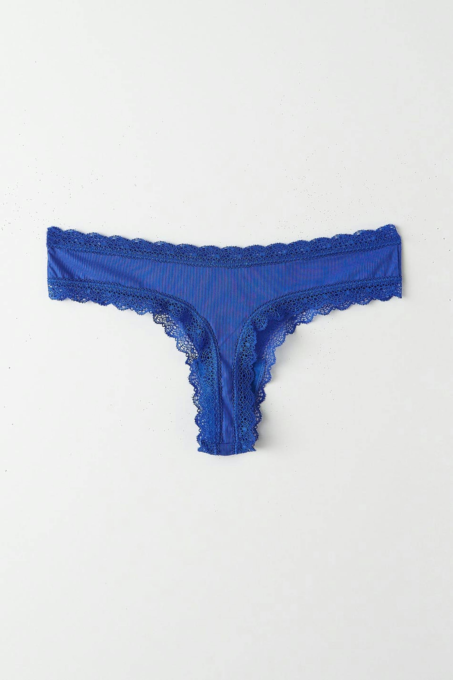 Gerippte Stringtangas mit Spitzenborten. Die Stringtangas sind blau und haben einen gefütterten Zweig aus Baumwolle.
